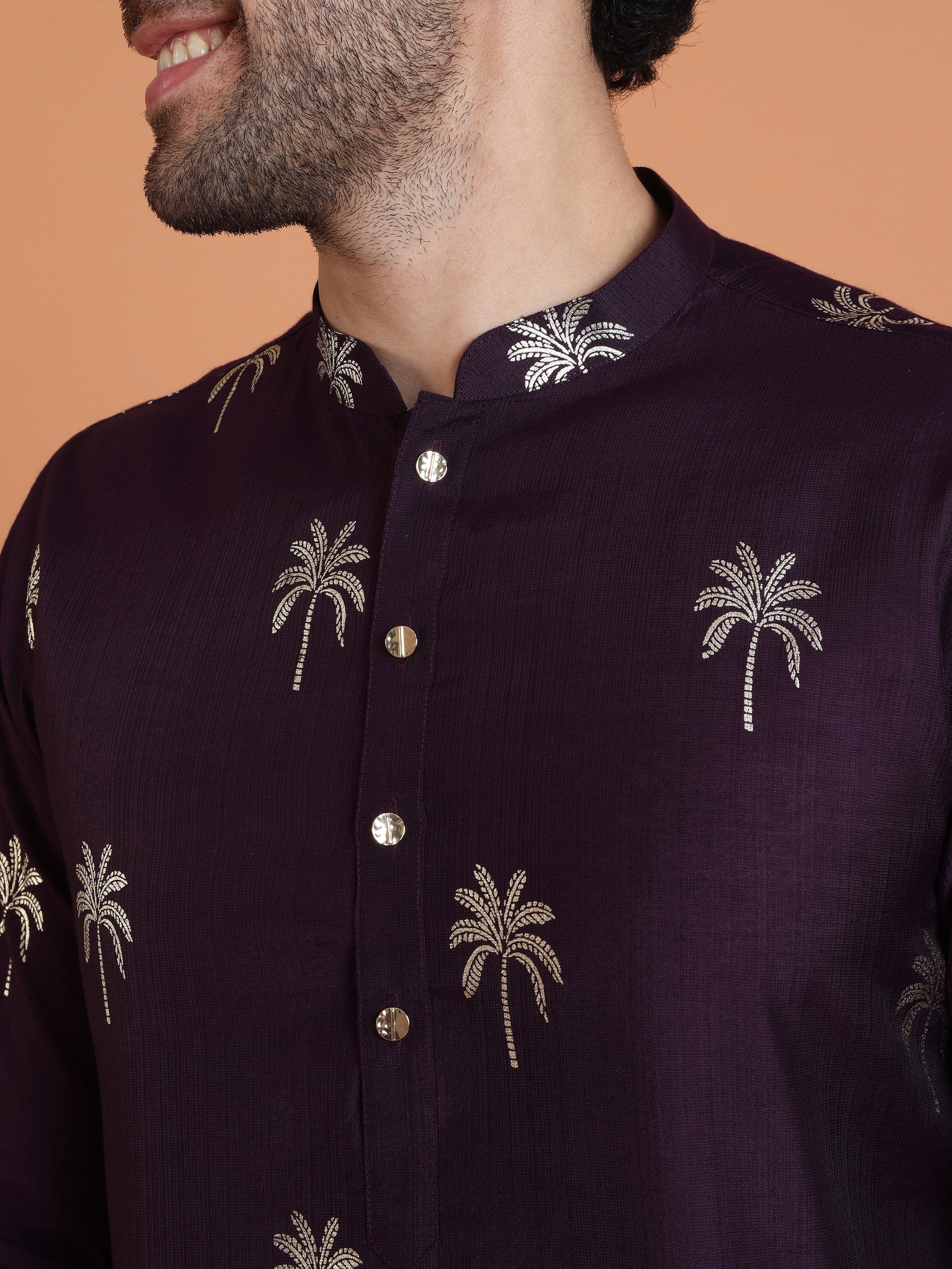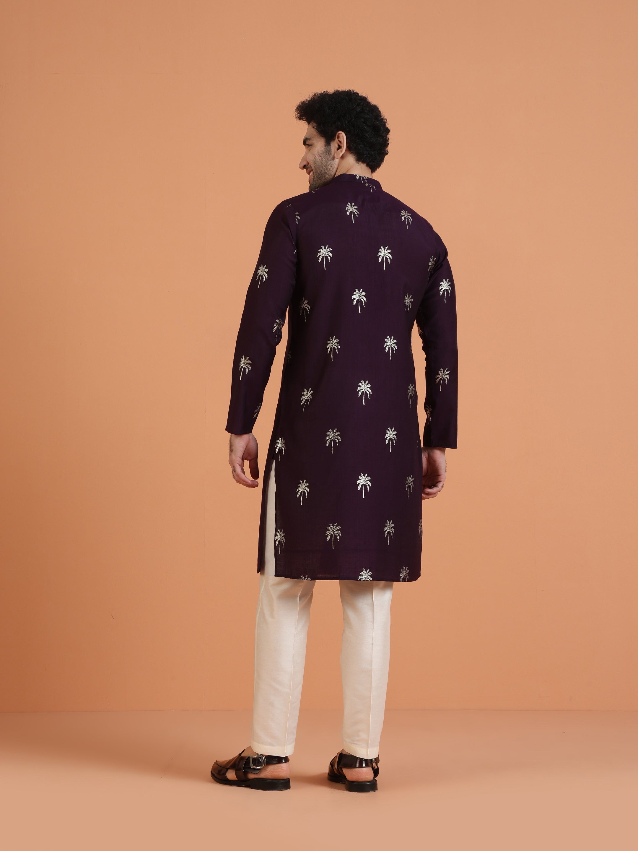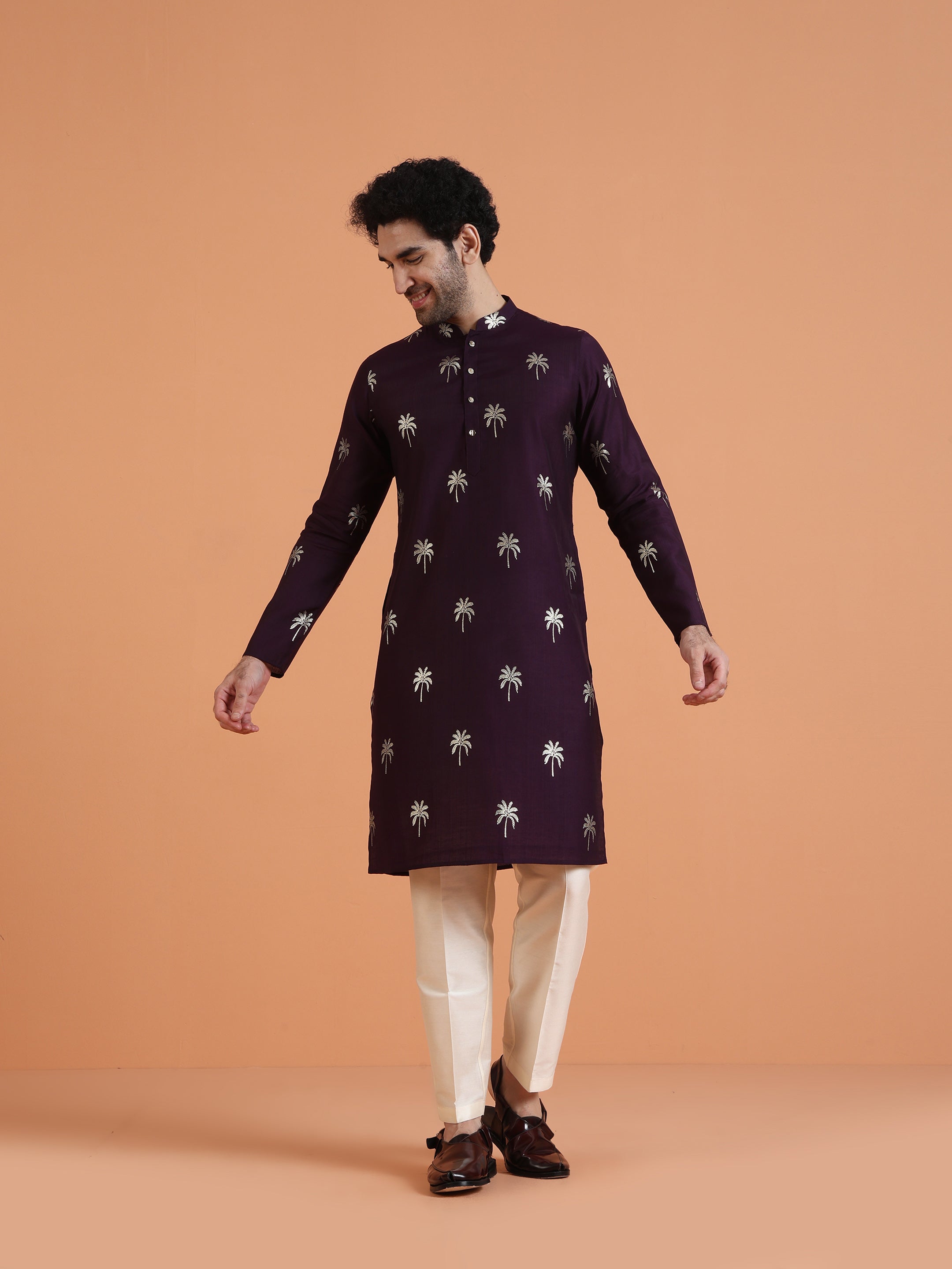 Kisah Wine Embroidered Kurta with Cream Trouser Set in silk blend with functional side pockets. Perfect festive wear for weddings and celebrations.