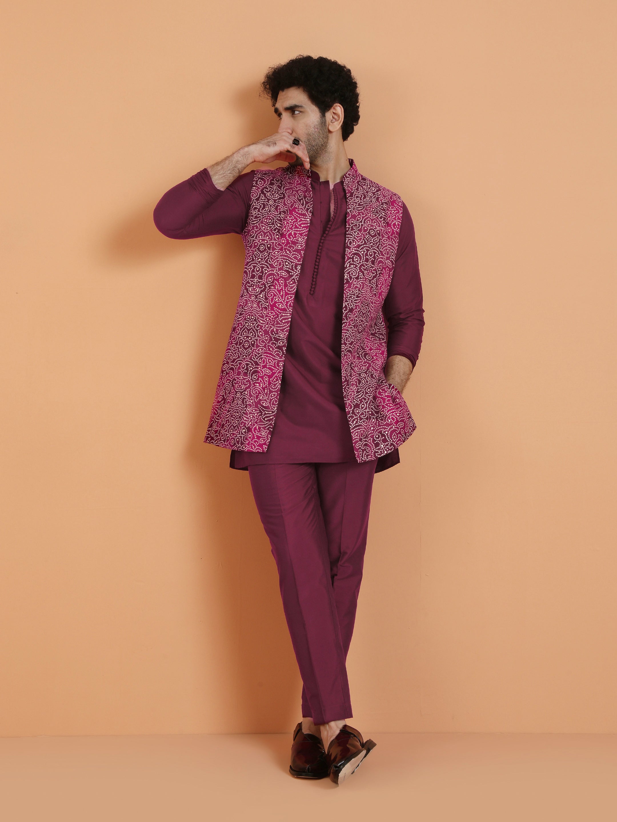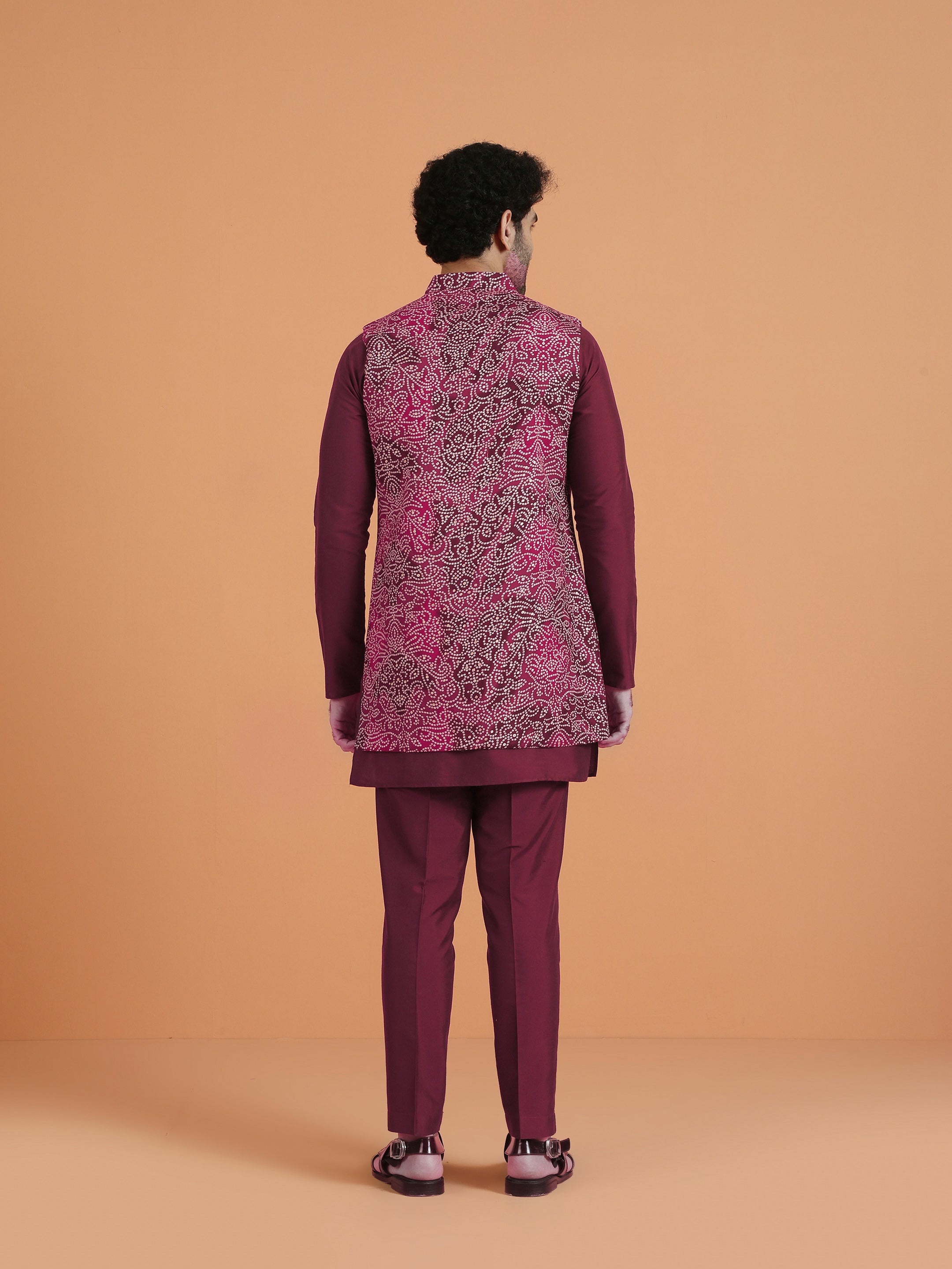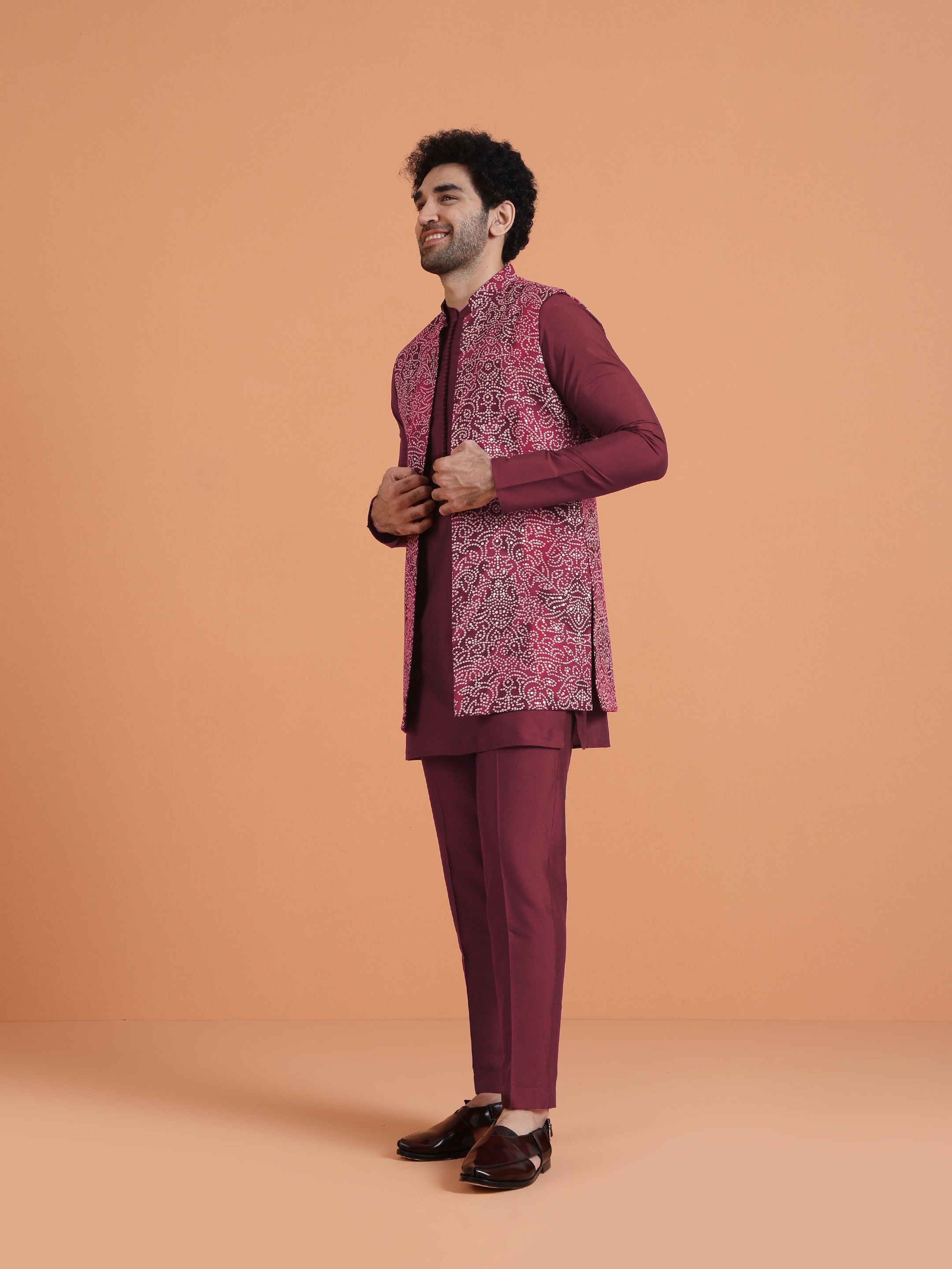 Wine Modal Chanderi Printed Mid Kurta Front Open Long Jacket Trouser Set, Perfect festive ethnic wear for men, ideal festive and casual occasions.