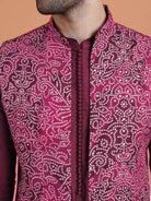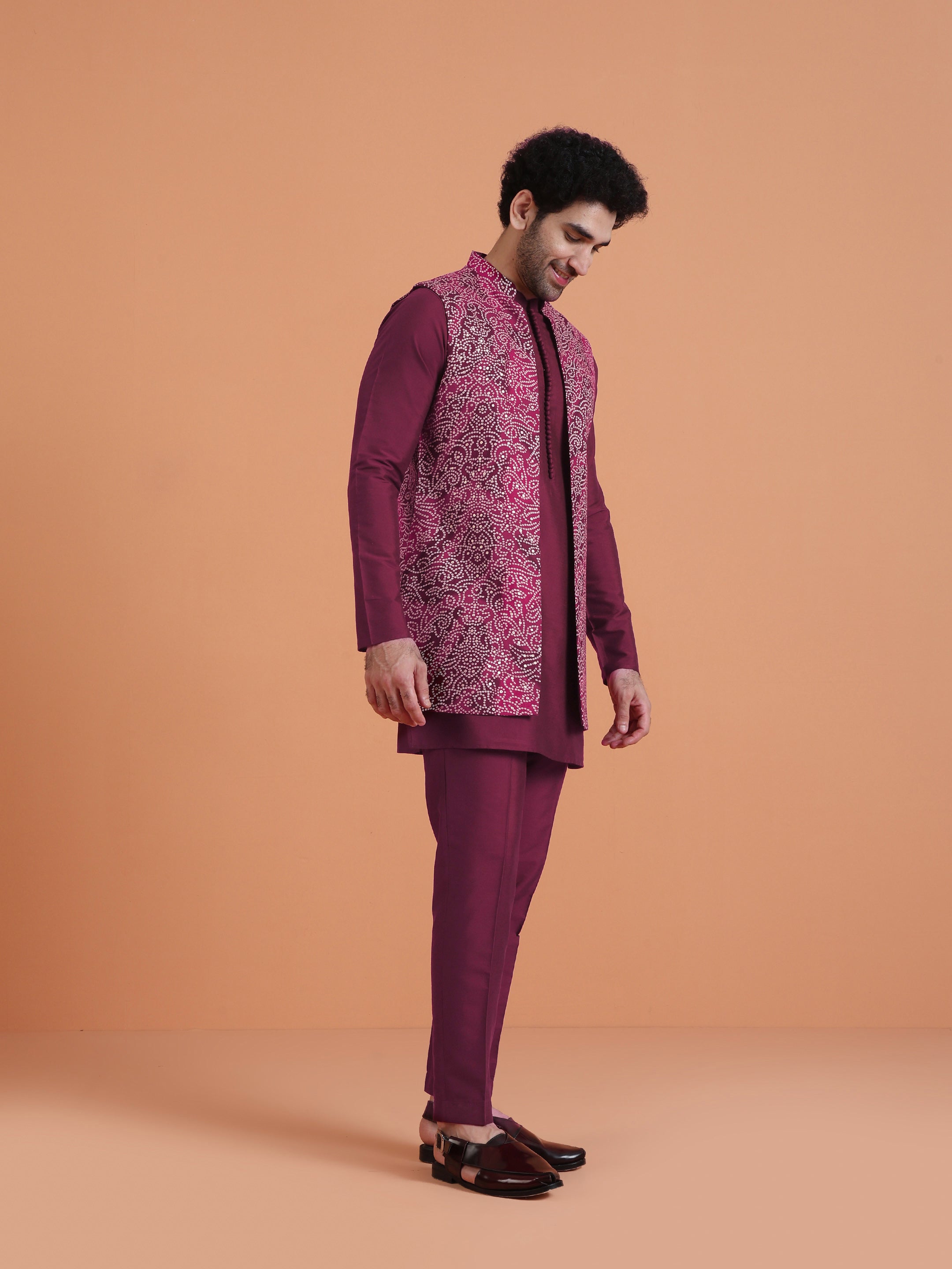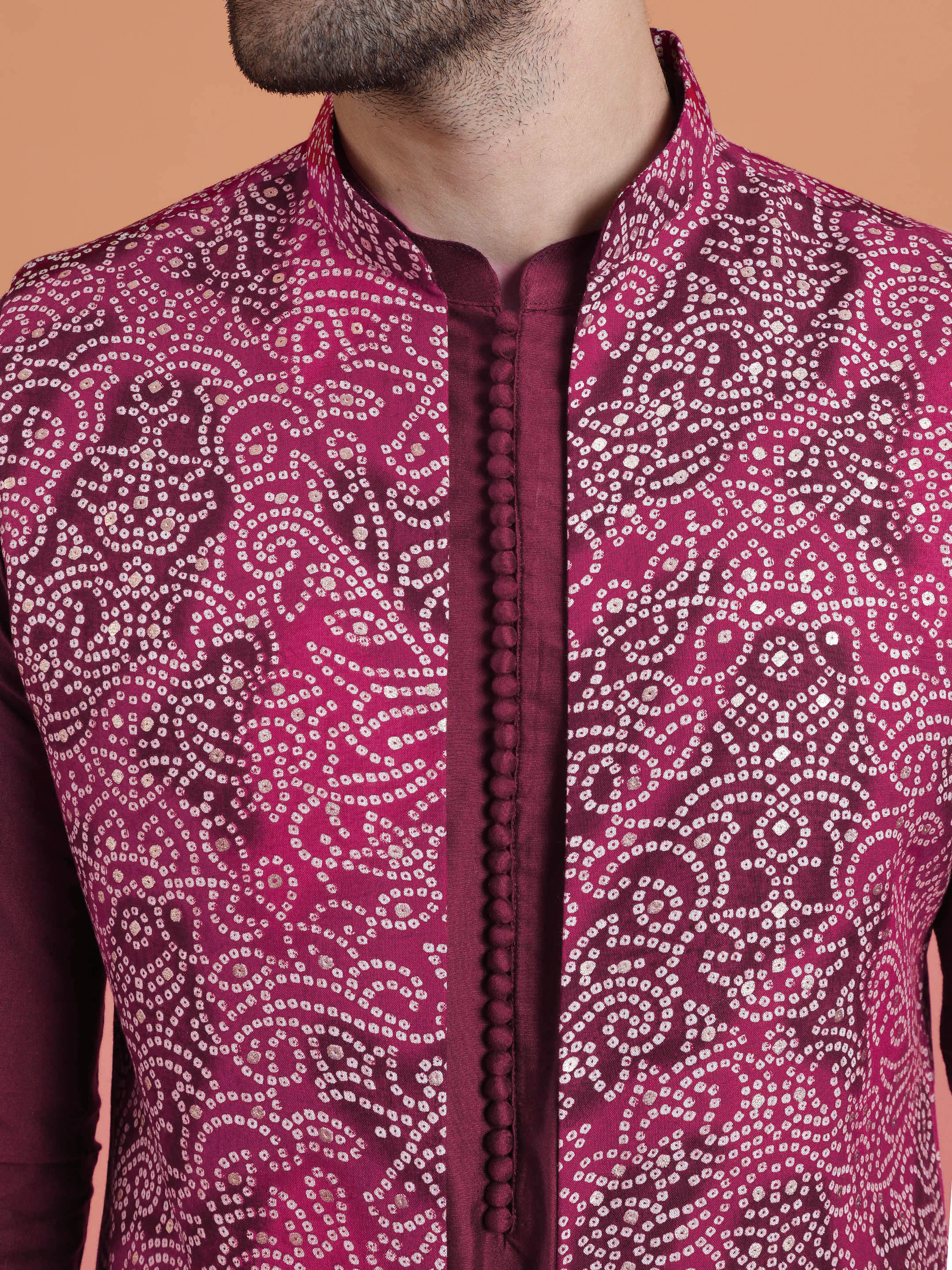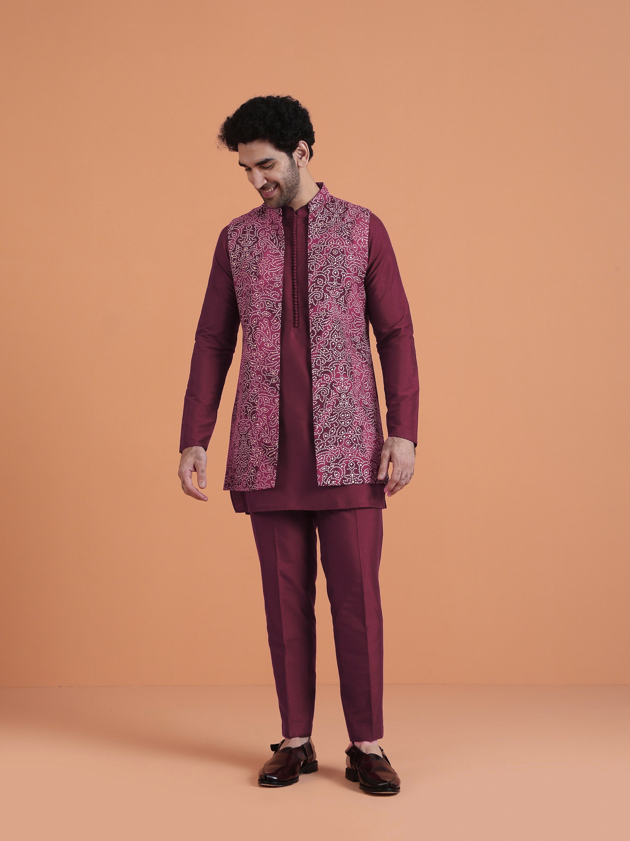 Wine Modal Chanderi Printed Mid Kurta Front Open Long Jacket Trouser Set, Perfect festive ethnic wear for men, ideal festive and casual occasions.