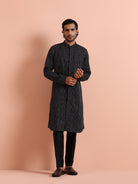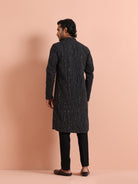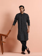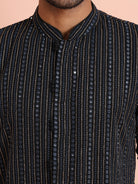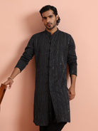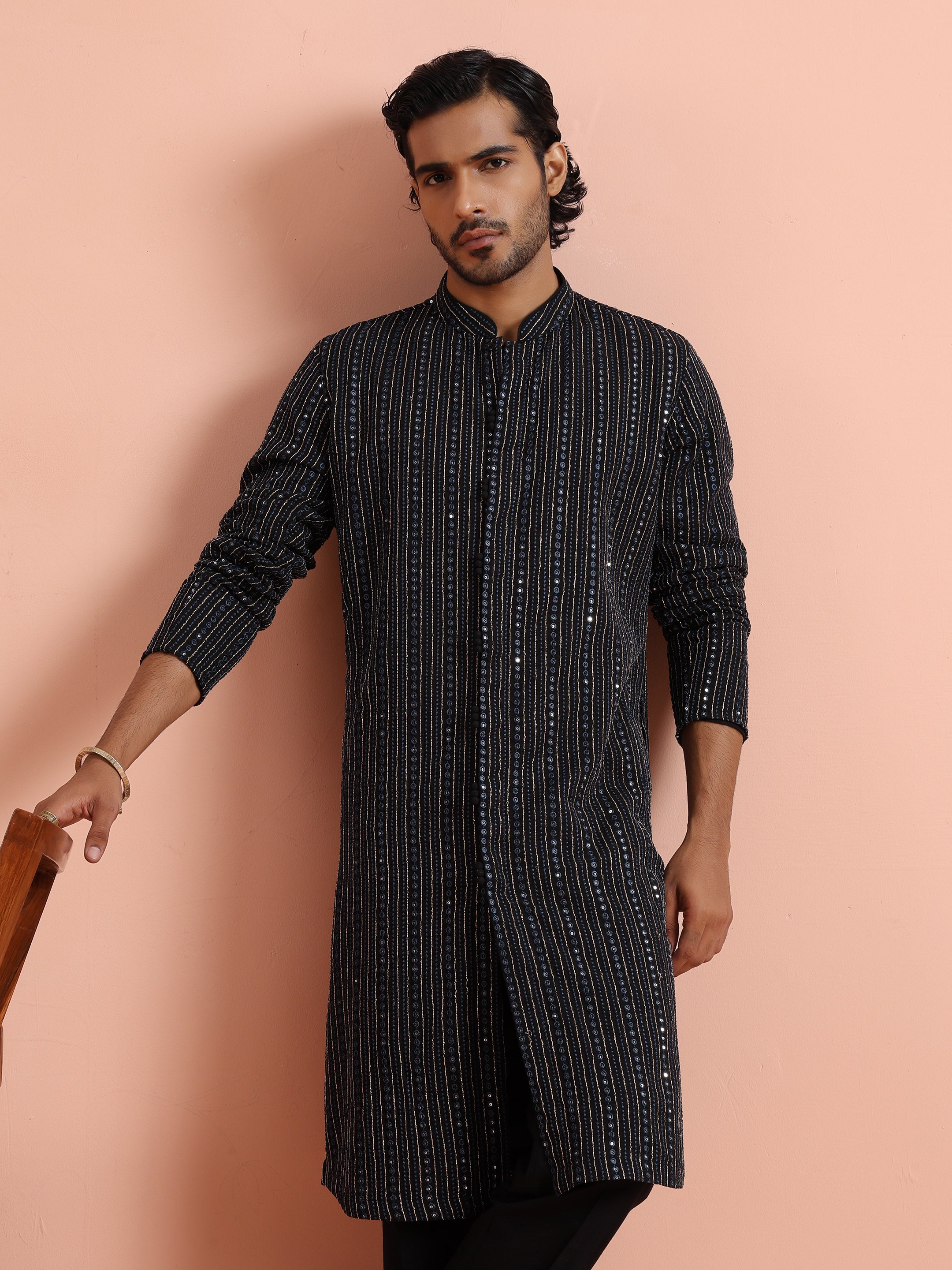 Black silk blend mirror work kurta trouser set. Front open long kurta with elegant stripes, paired with black trousers for weddings & festive occasions.