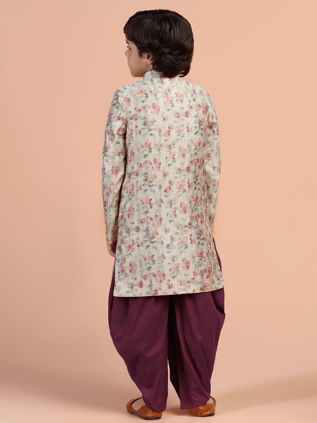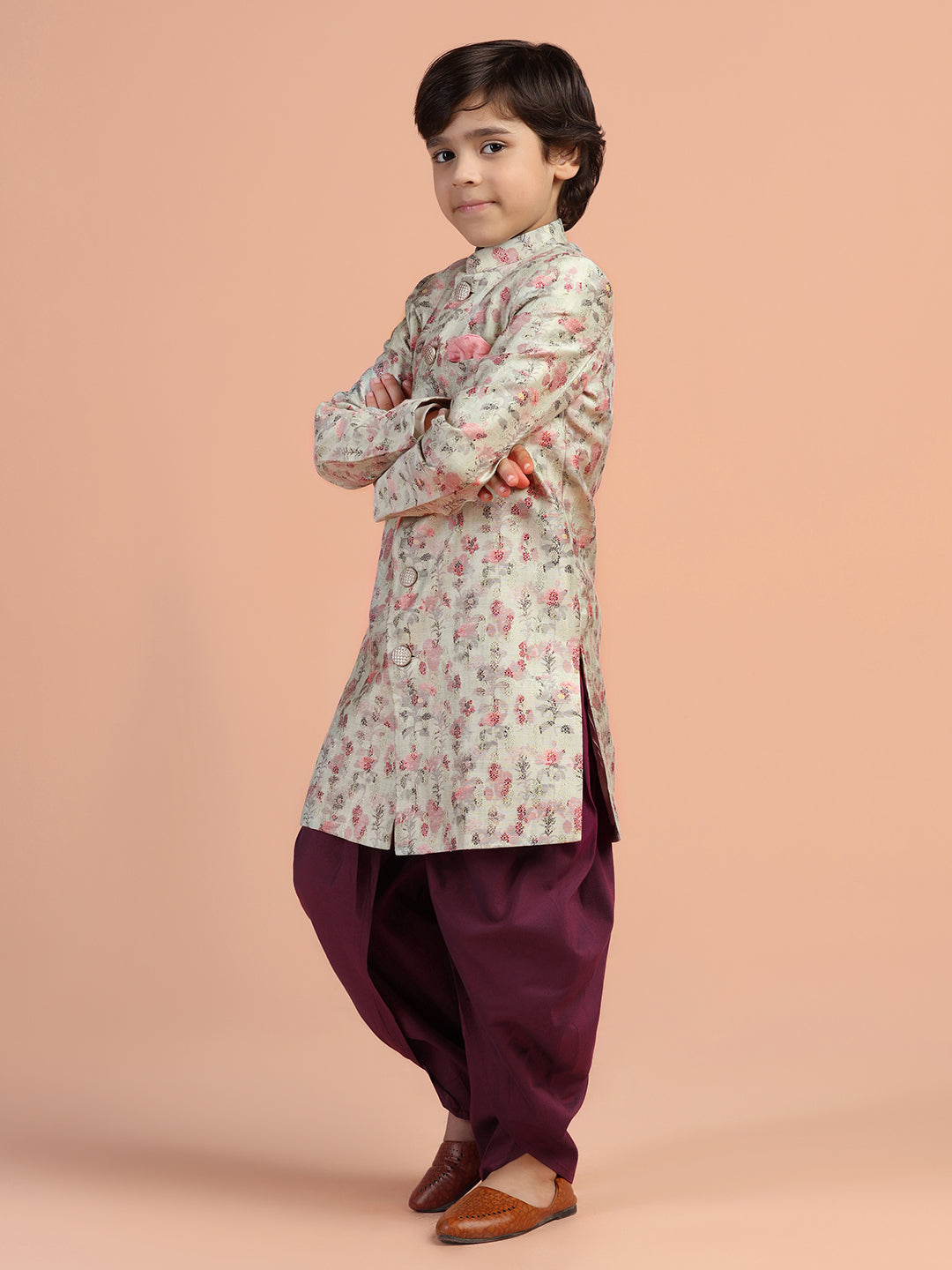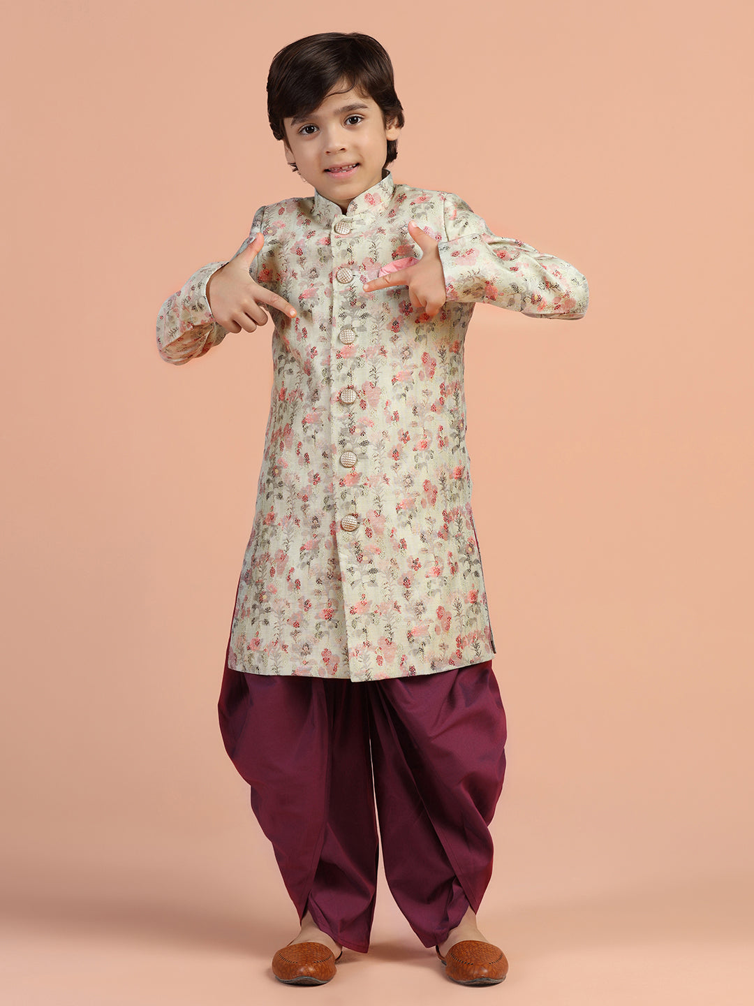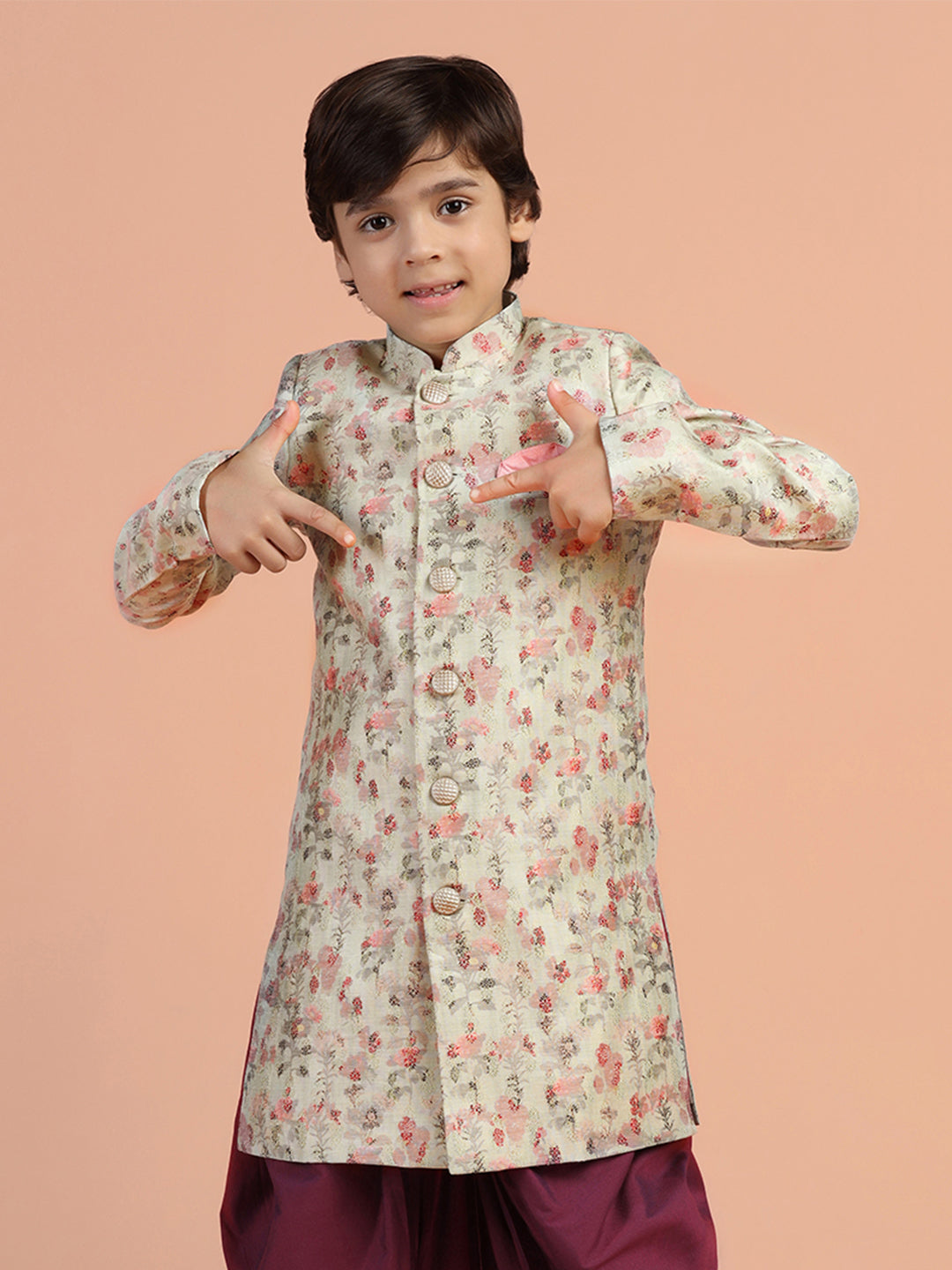 Ivory floral printed sherwani dhoti set for boys – premium festive wear featuring a soft silk blend and elegant floral print.