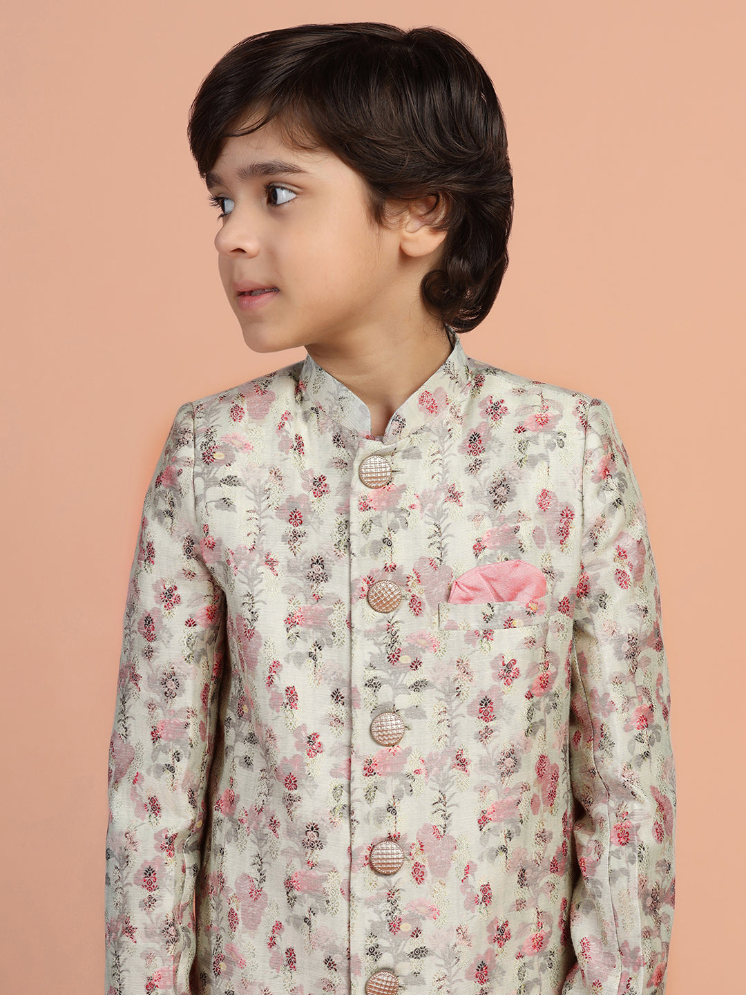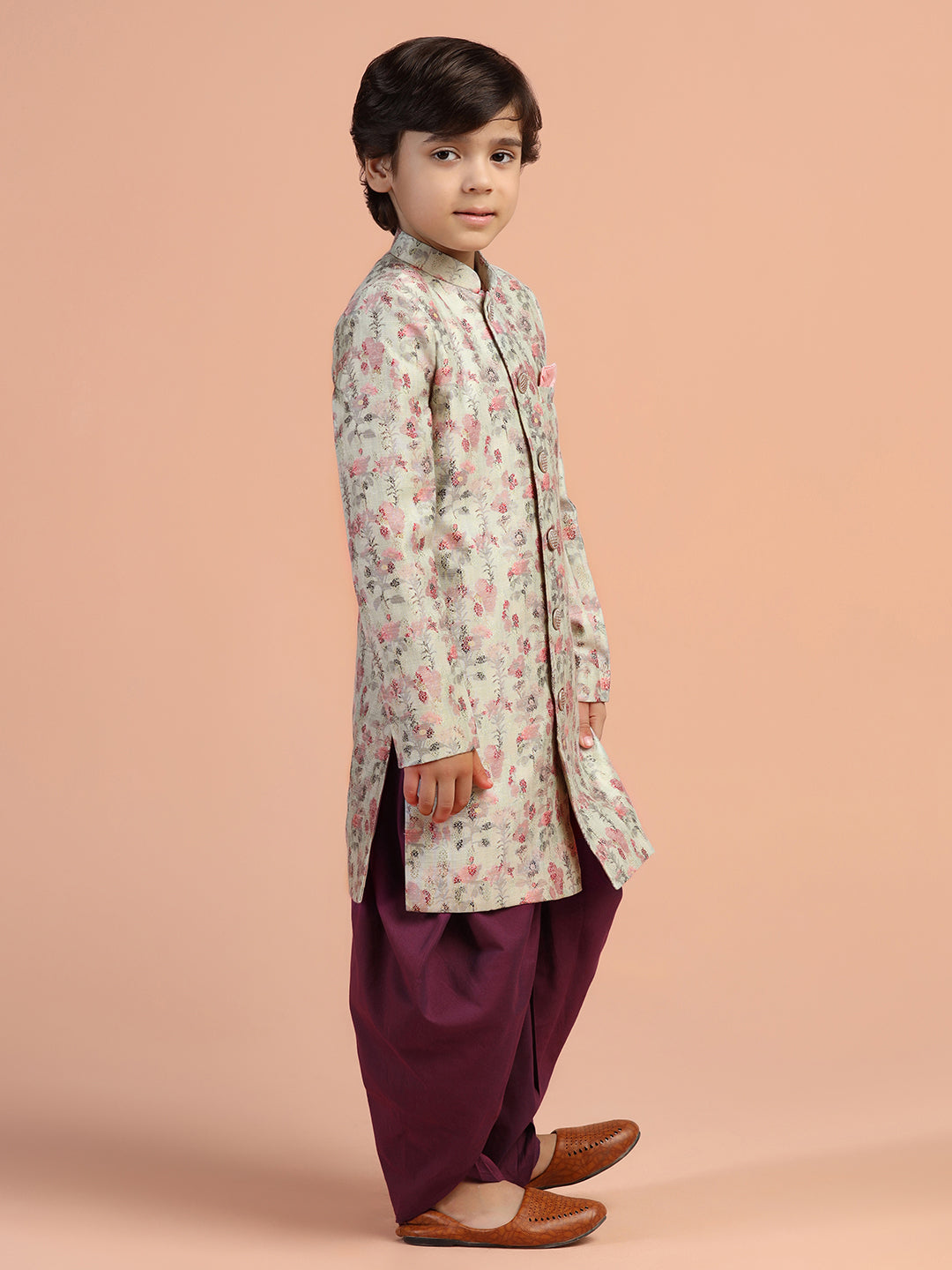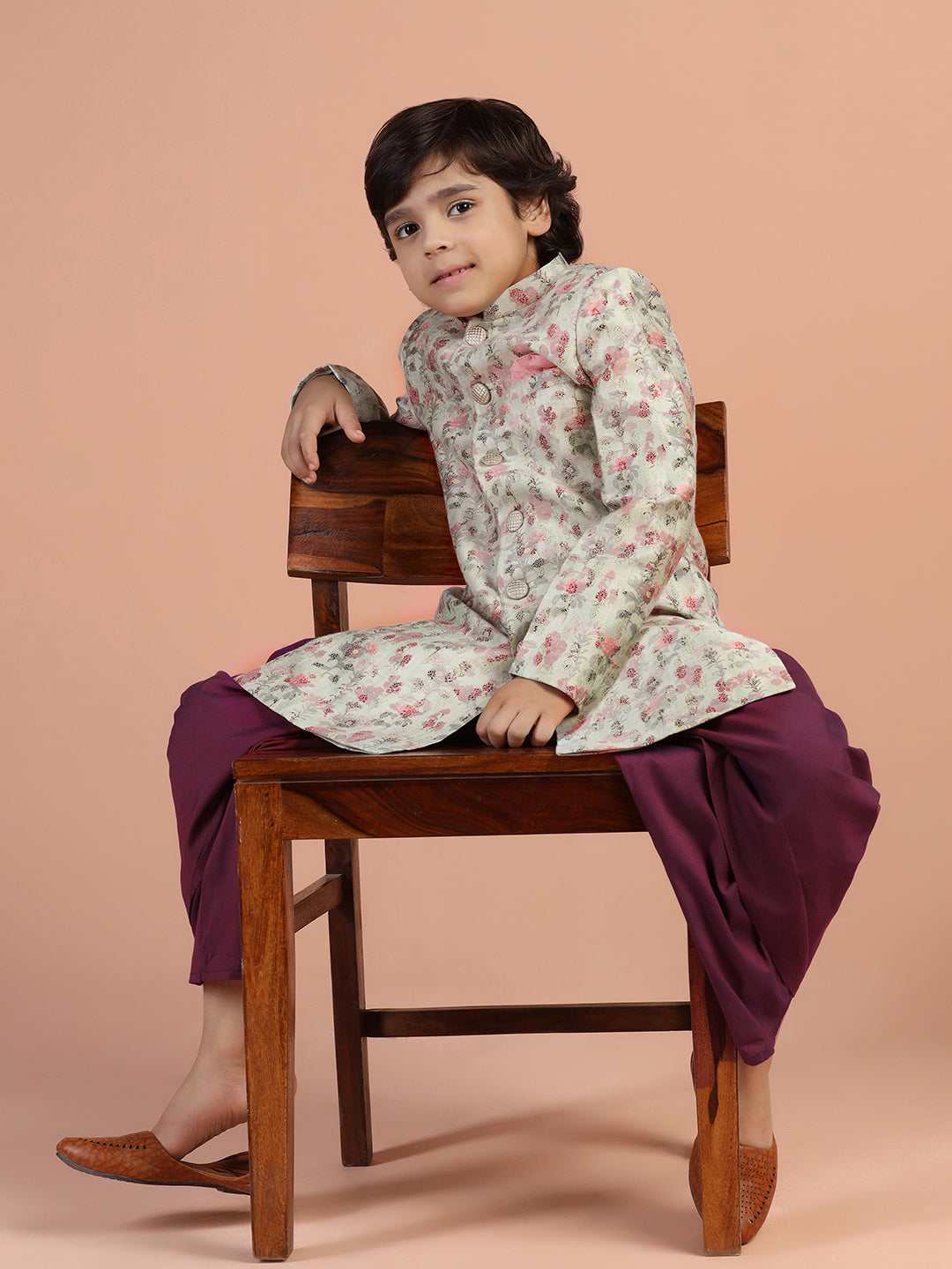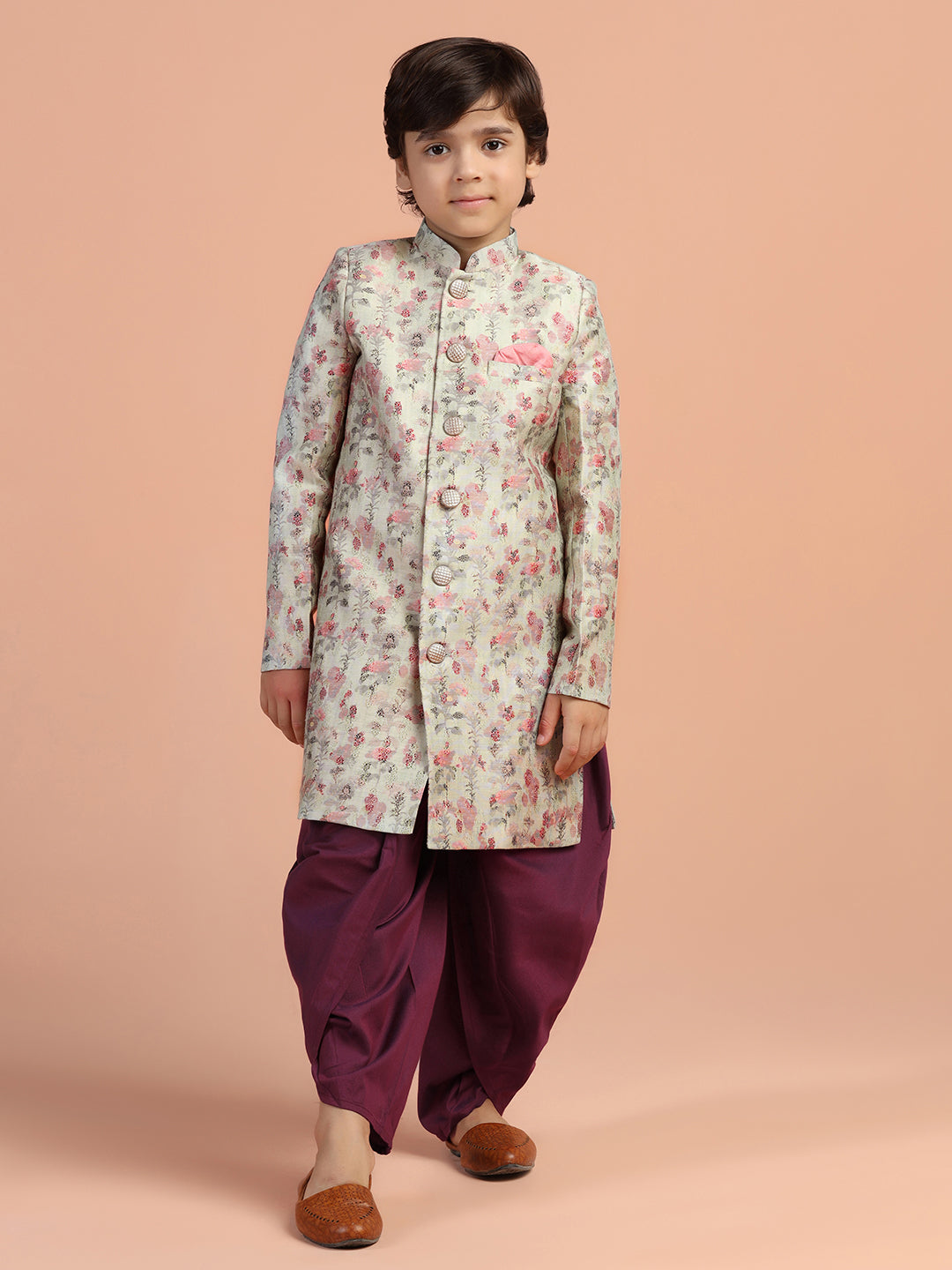 Ivory floral printed sherwani dhoti set for boys – premium festive wear featuring a soft silk blend and elegant floral print.