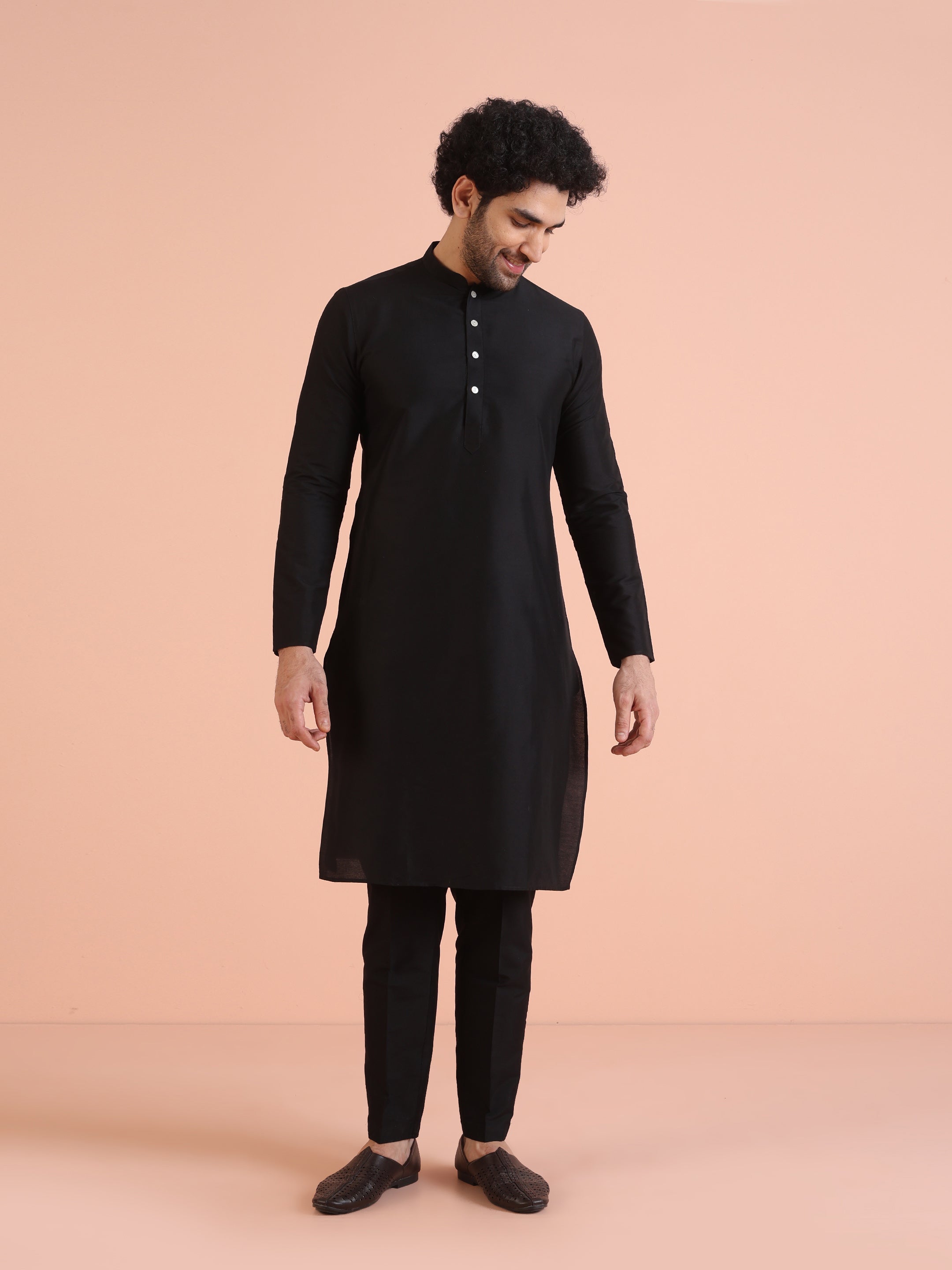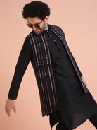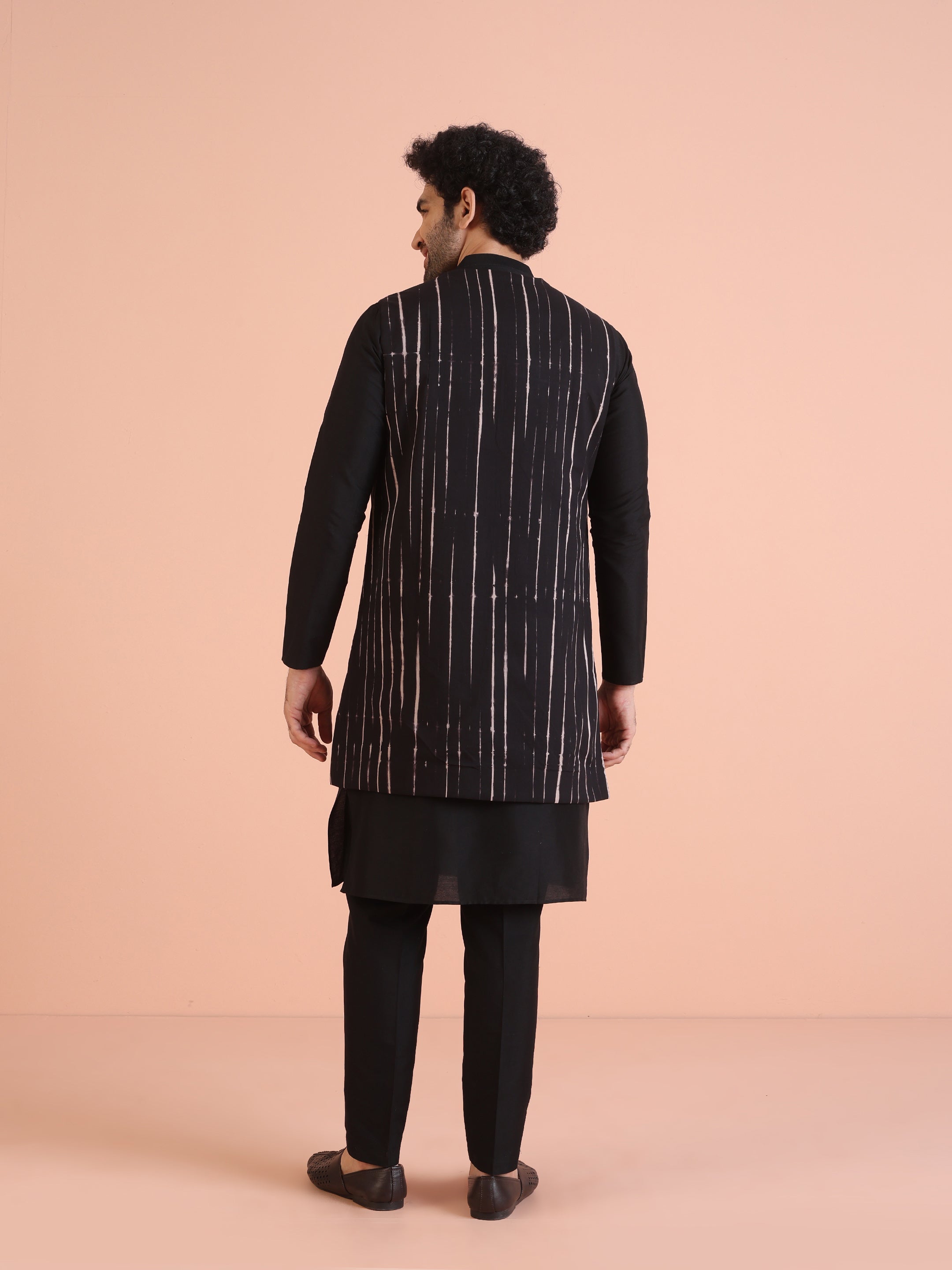 This black cotton blend kurta, jacket, and trouser set features a printed design and regular fit. Ideal for traditional occasions or casual wear, it combines style with comfort.