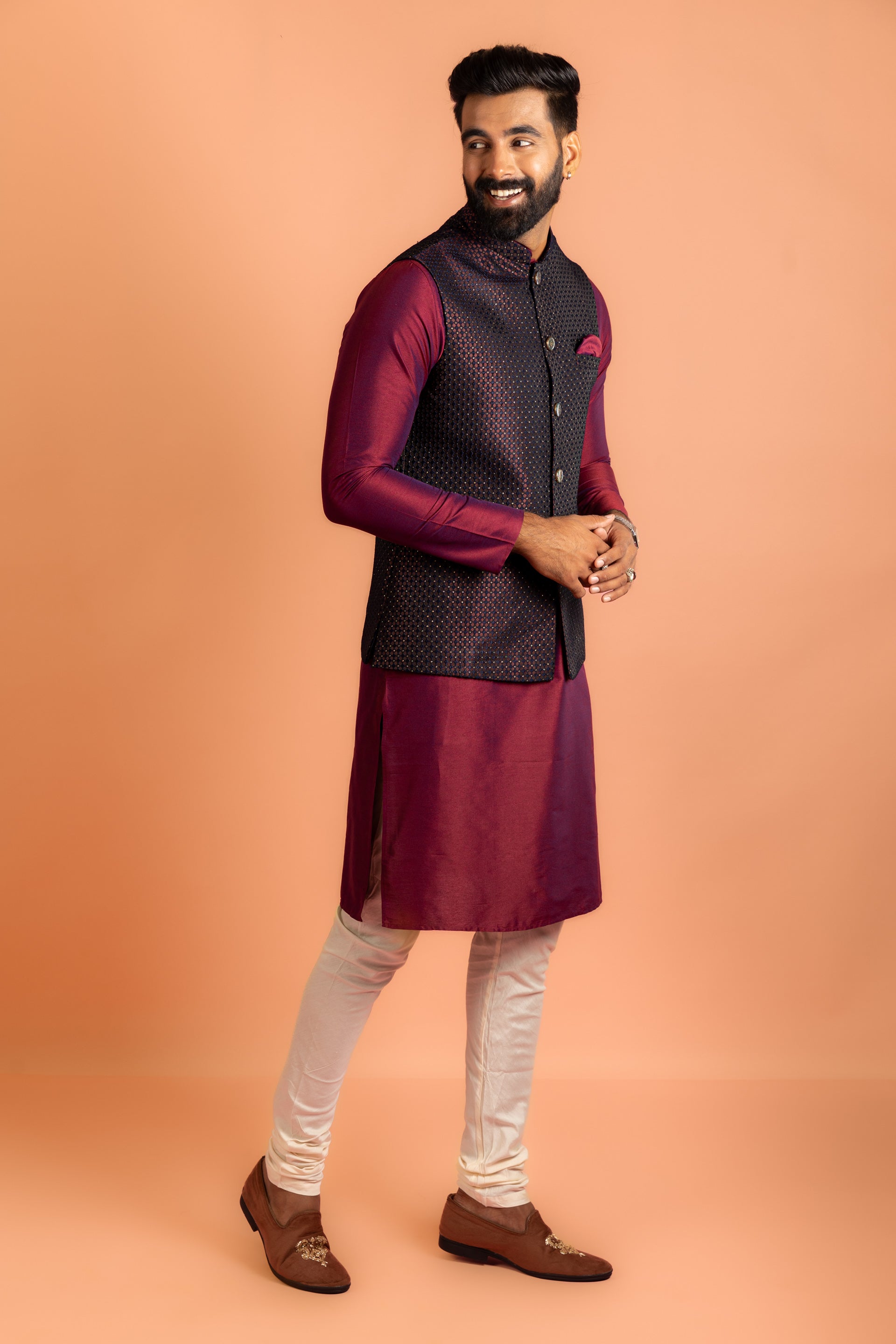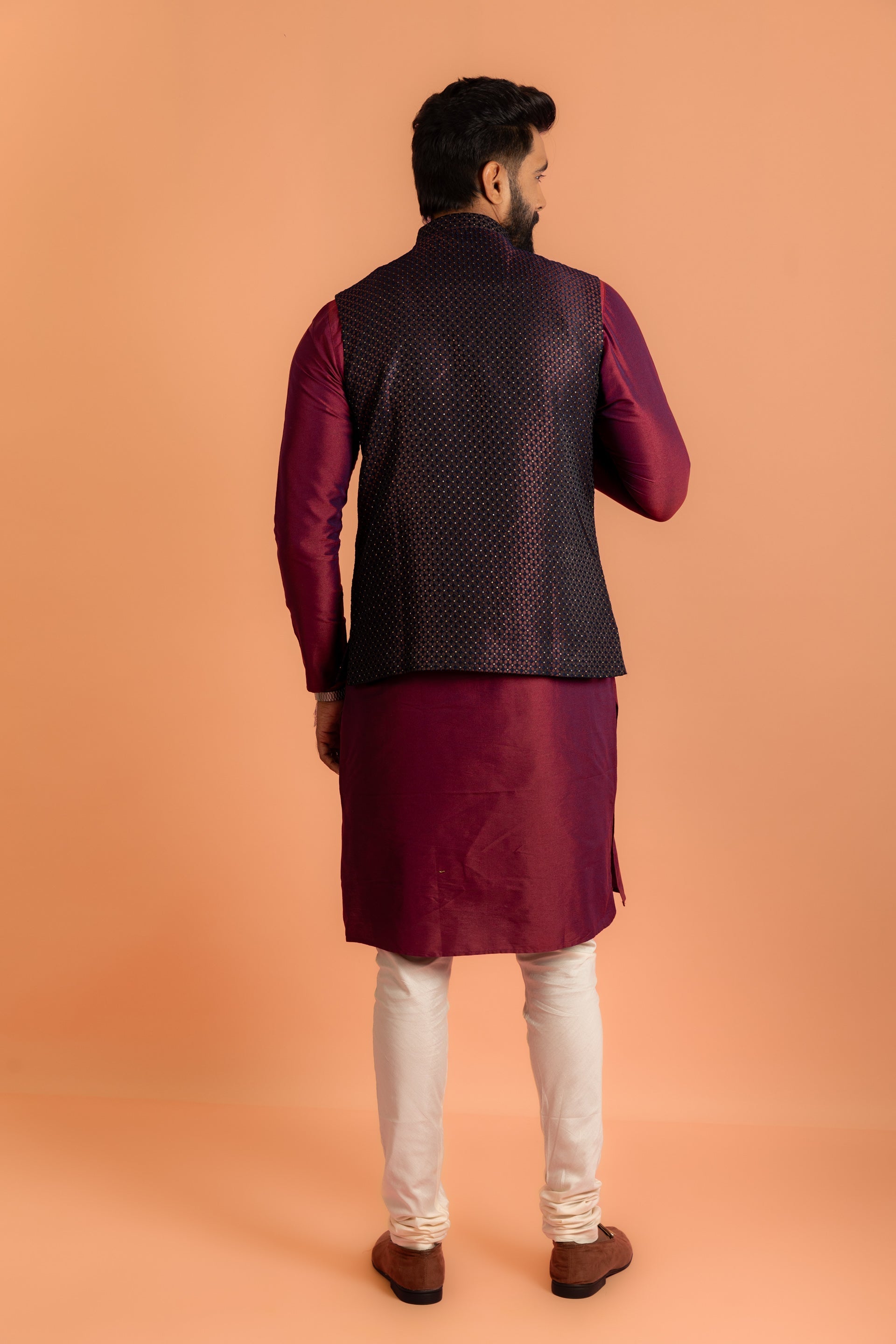 Elevate your ethnic wear with this Wine silk blend jacquard kurta, jacket, and churidar set. Featuring a textured design and regular fit, it is ideal for festive occasions.