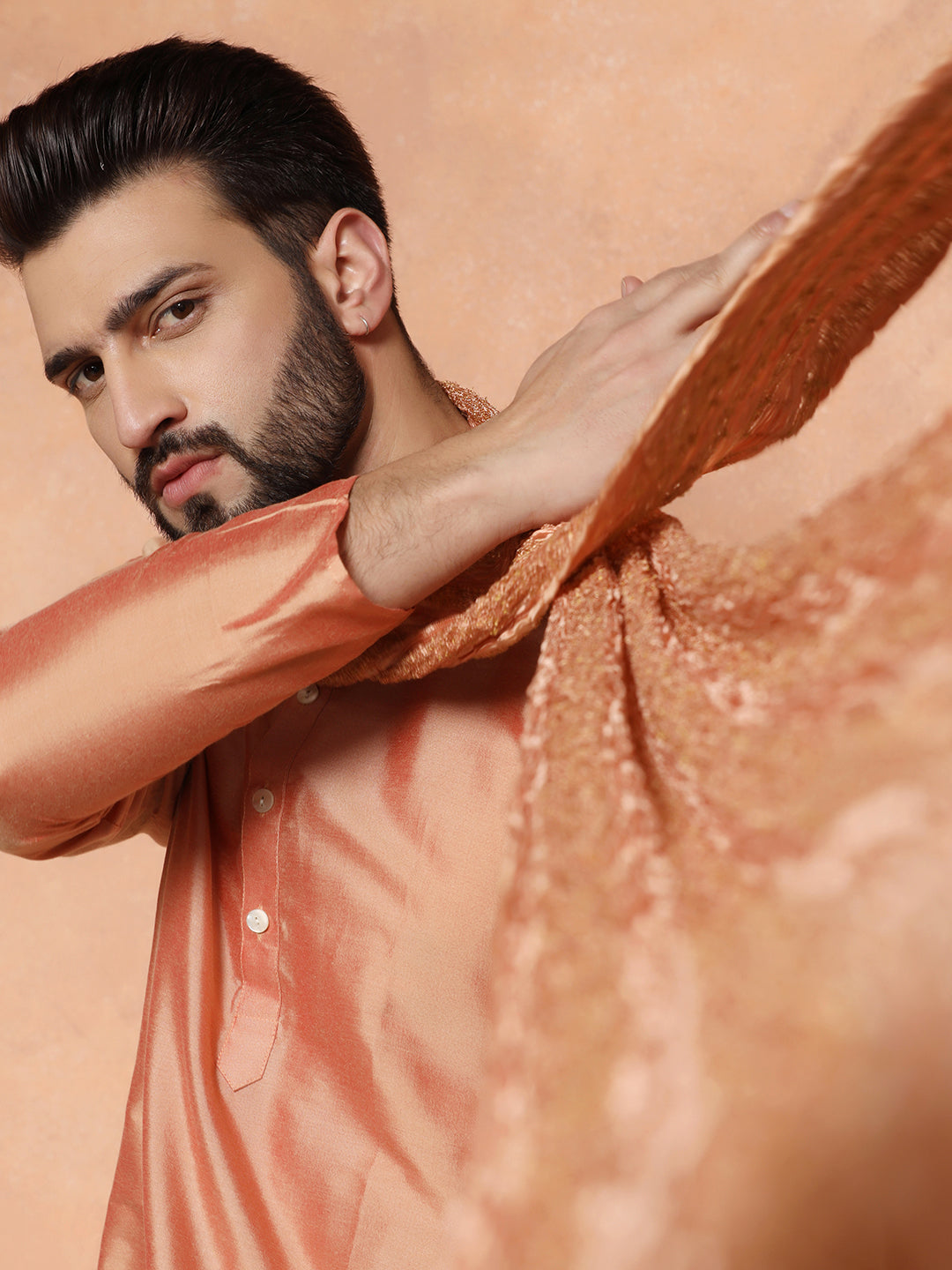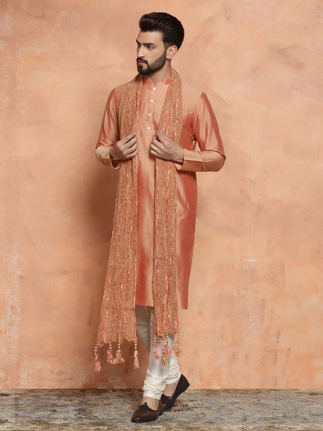 Peach Silk Blend Kurta Churidar with Embellished Dupatta