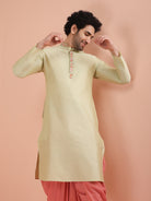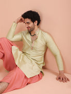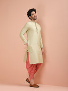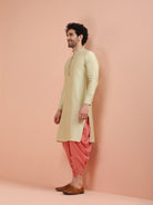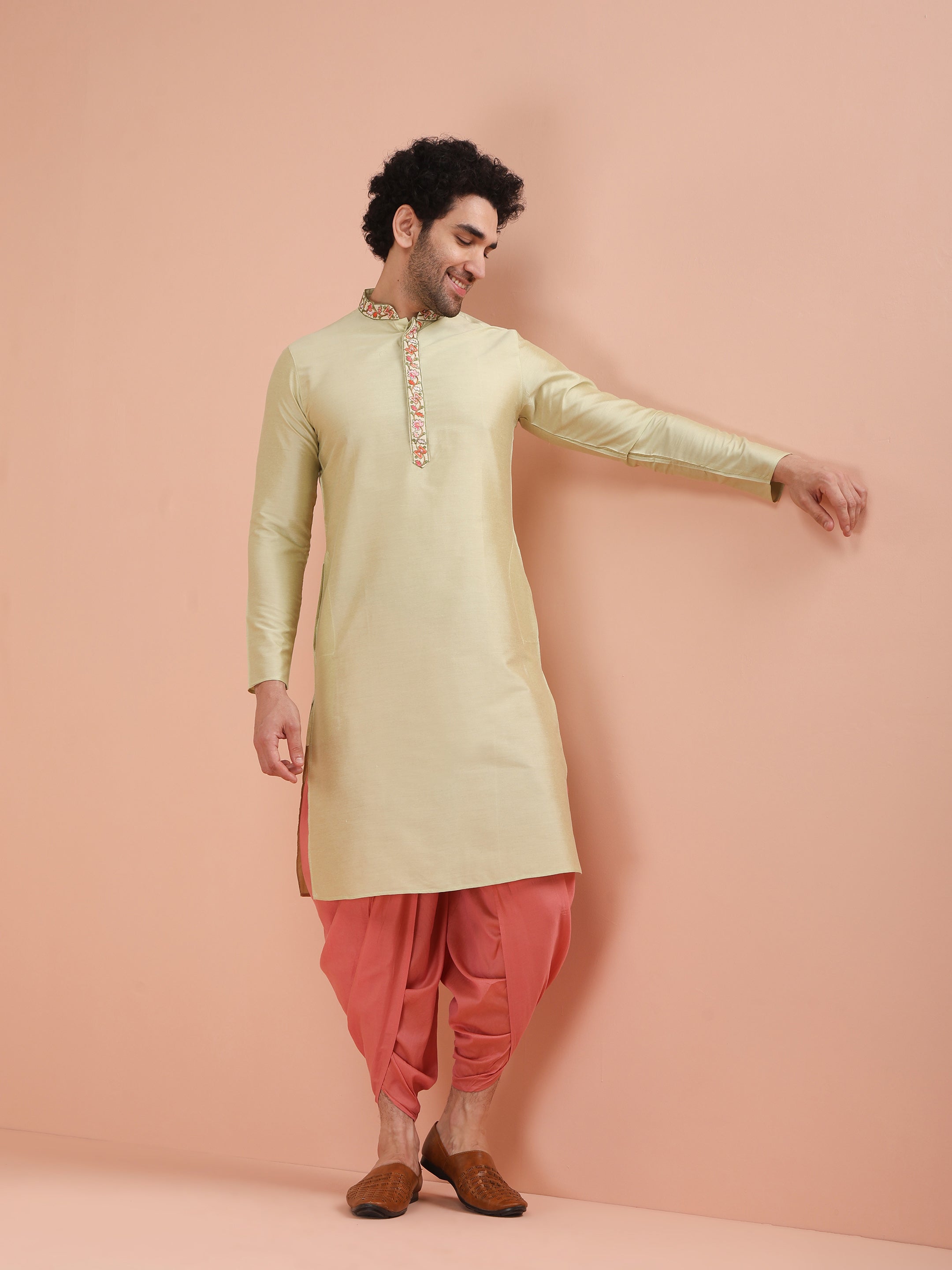 Enhance your ethnic wardrobe with our Green Kurta & Dhoti set. Made from a cotton blend, this regular-fit outfit is ideal for festive events, keeping you both comfortable and stylish.