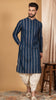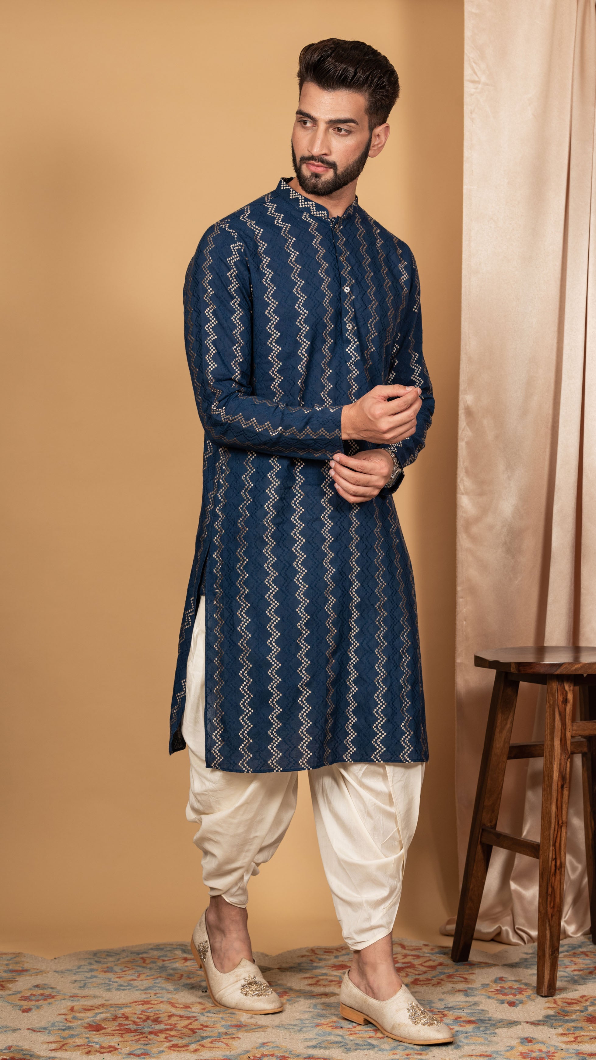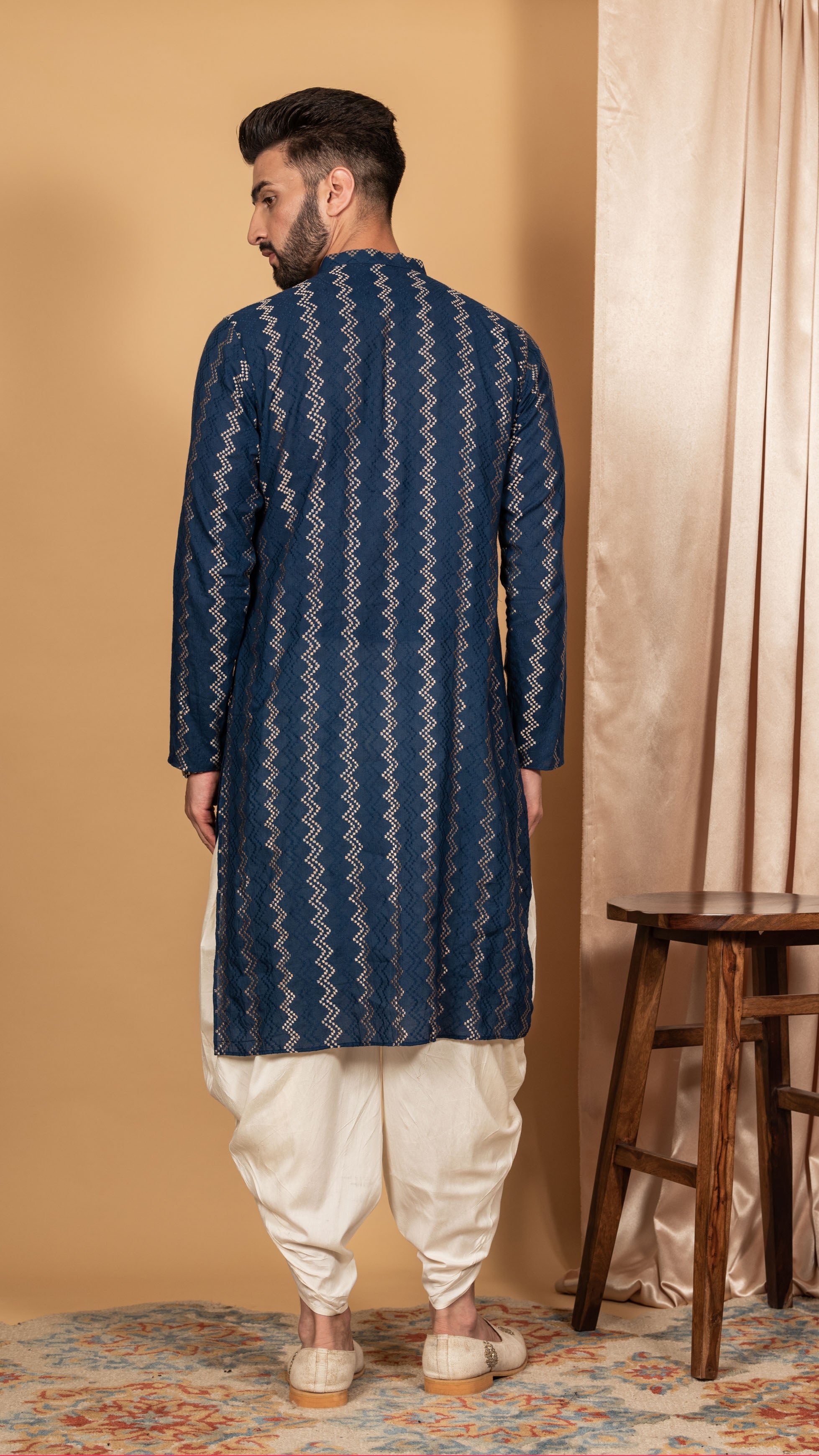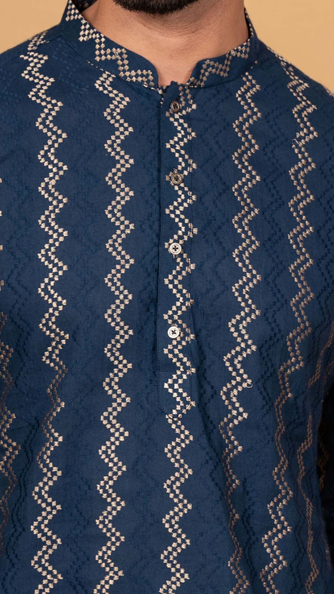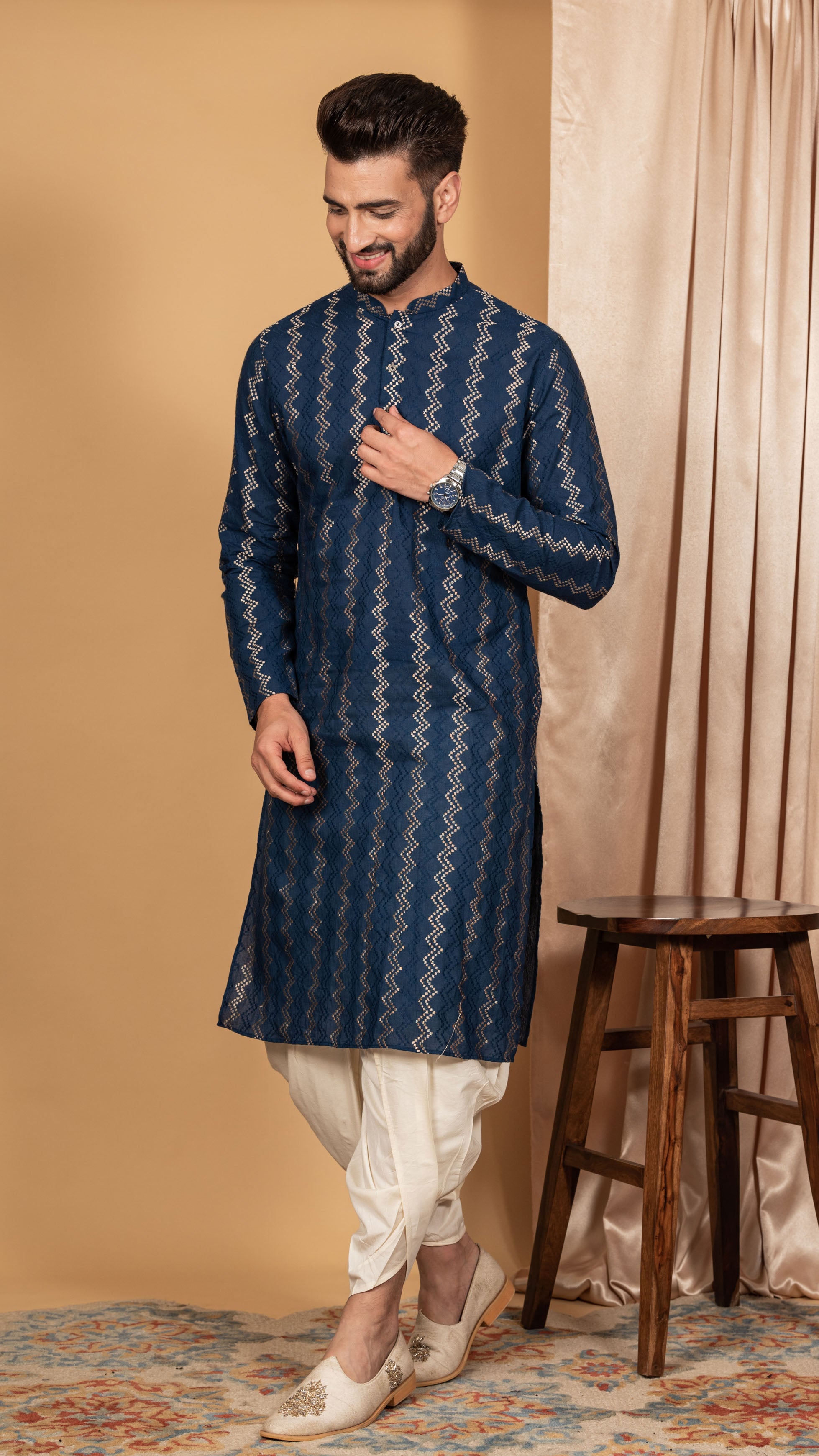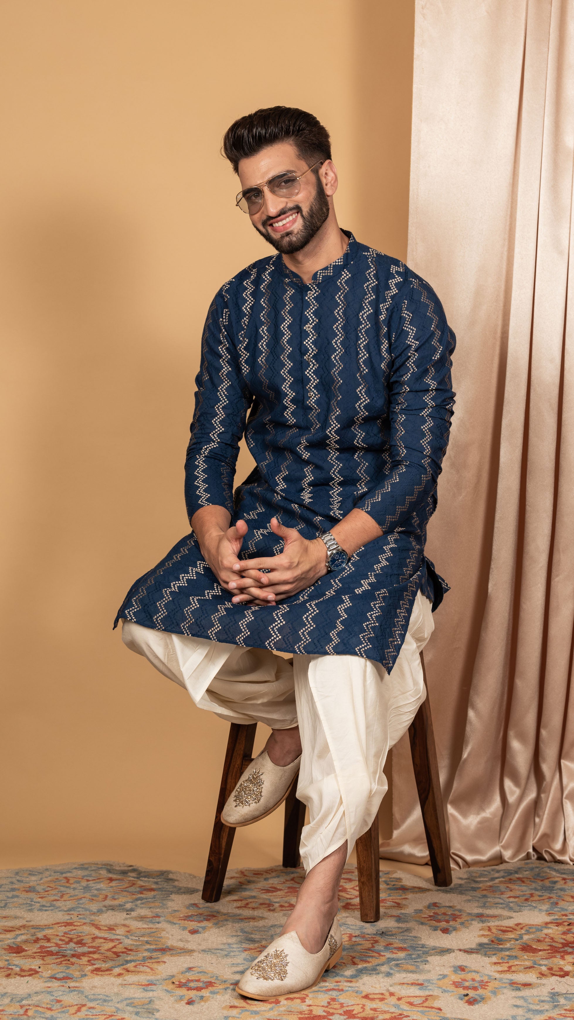 Men Navy Blue Chevron Textured Kurta Dhoti Set