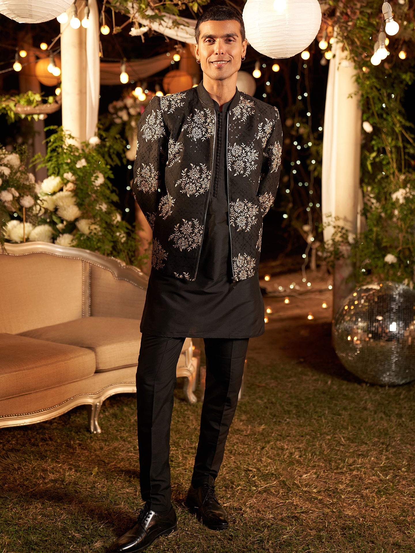 Men Black Embroidered Kurta Bomber Jacket Trouser Set with Thread Work