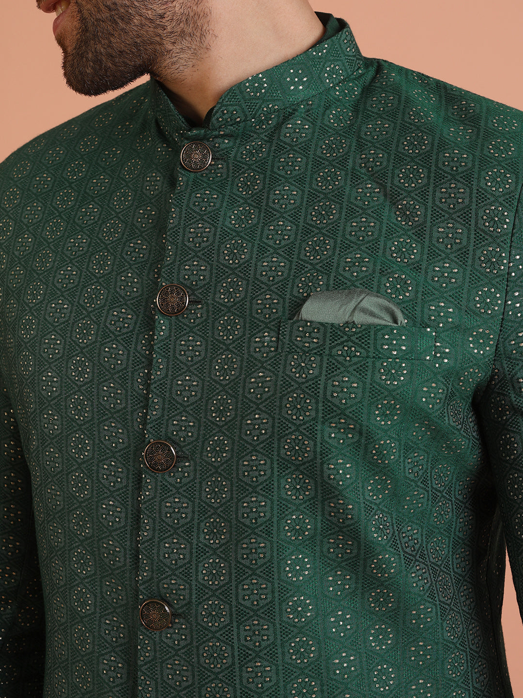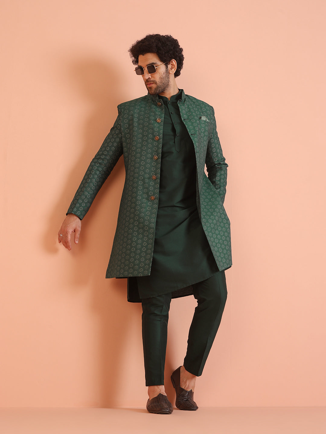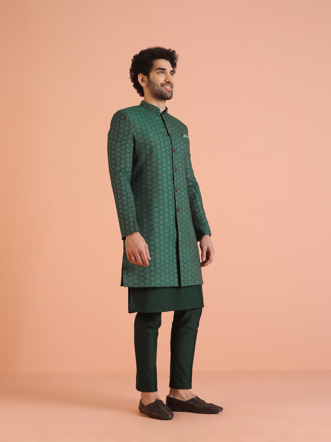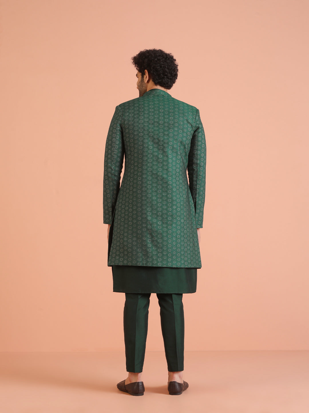 Experience classic elegance with this Men Green Jacquard Geometric Kurta Indowestern Trouser Set. The Jacquard Pattern adds a refined touch, while the breathable Silk Blend fabric ensures comfort throughout the day. Ideal for festive events or casual wear, this Kurta Indowestern Trouser Set is a wardrobe essential..