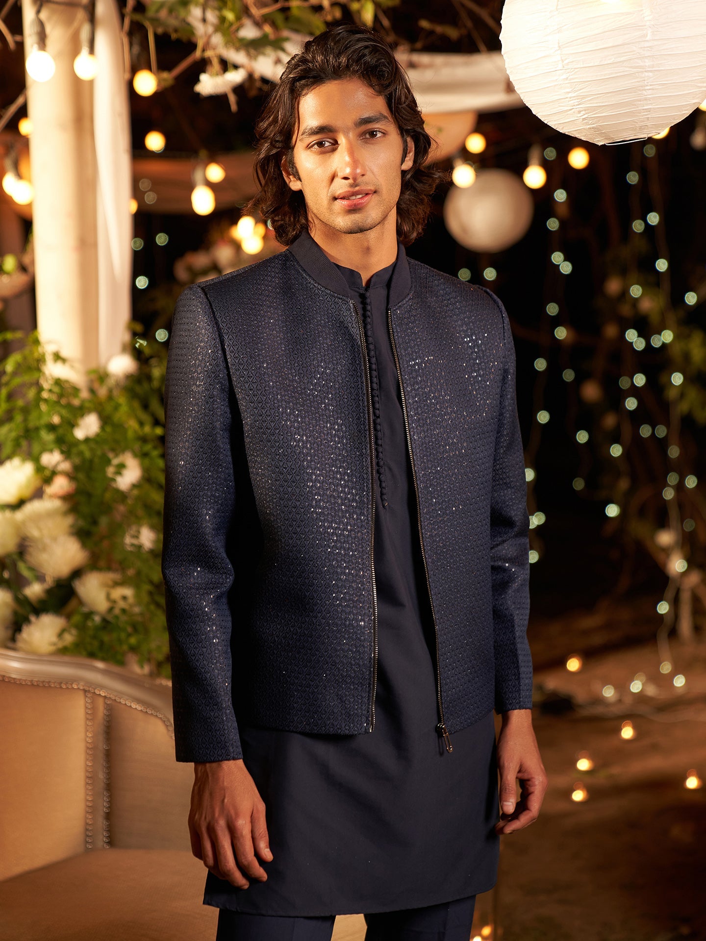 Men Navy Blue Woven Design Kurta Bomber Jacket Trouser Set with Sequence