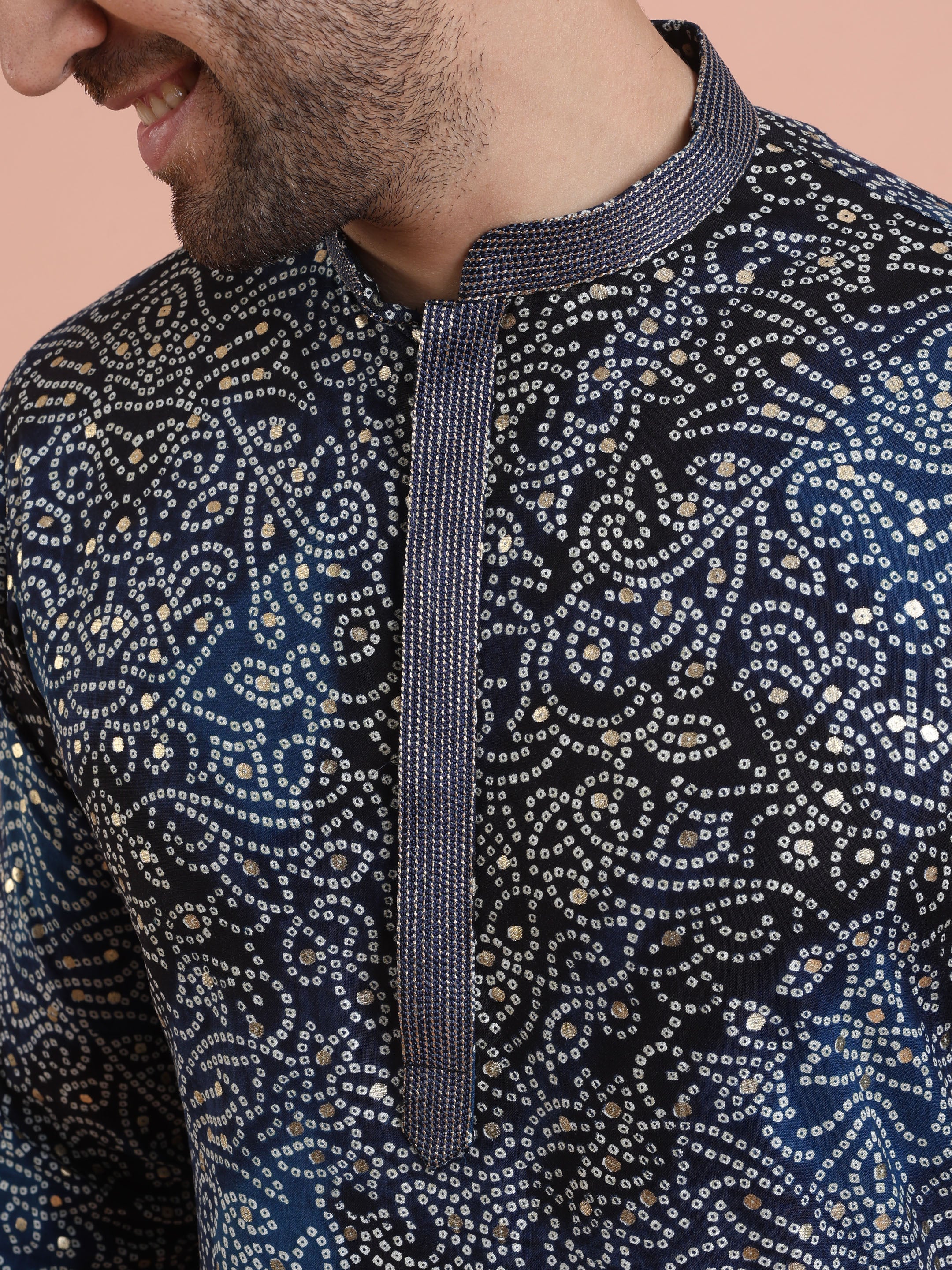 Experience classic elegance with this Men Navy Blue Printed Bandhani Kurta Trouser Set. The Printed Pattern adds a refined touch, while the breathable Cotton Blend fabric ensures comfort throughout the day. Ideal for festive events or casual wear, this Kurta Trouser Set is a wardrobe essential..