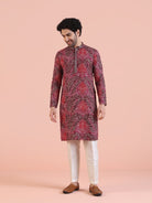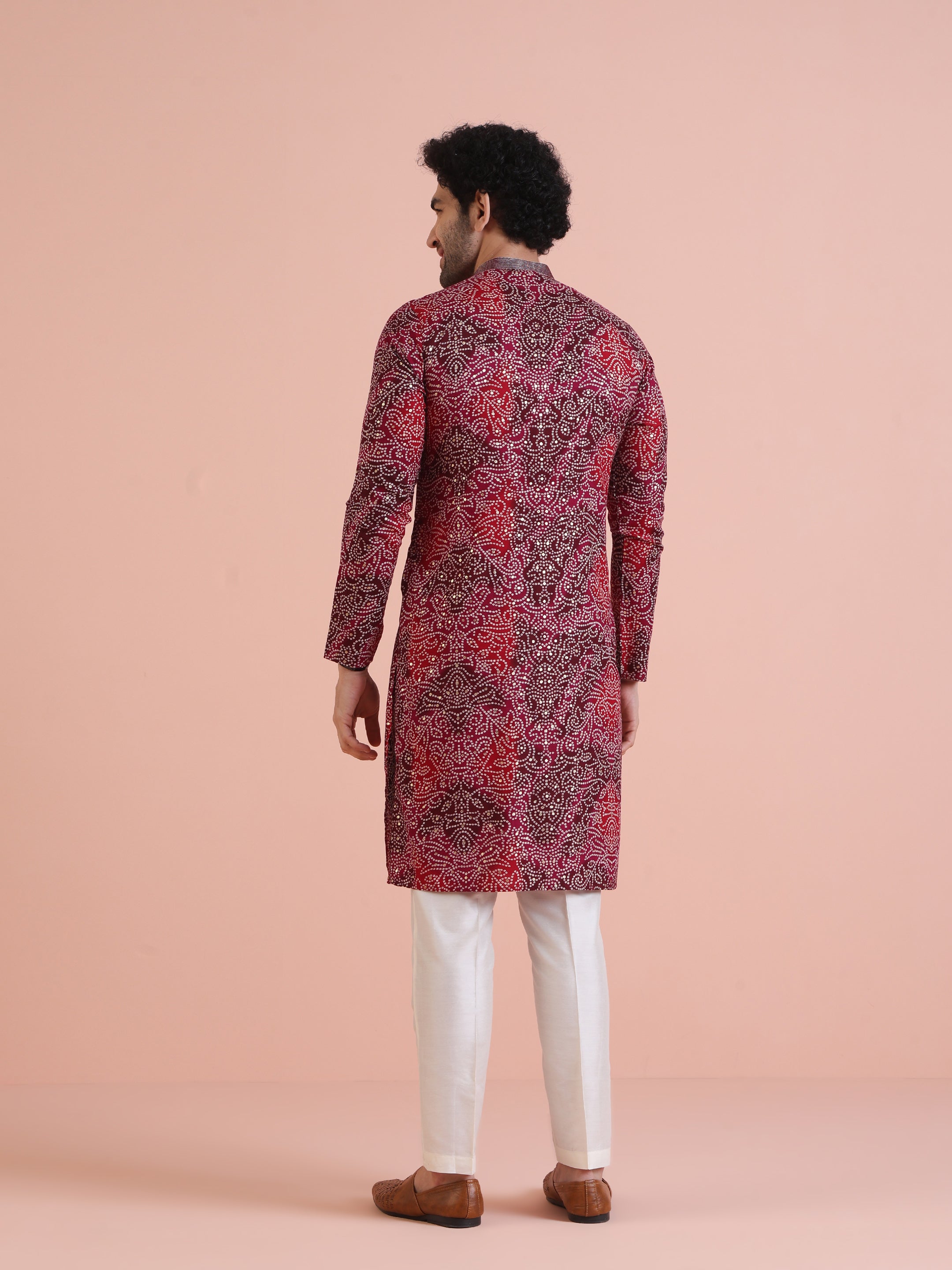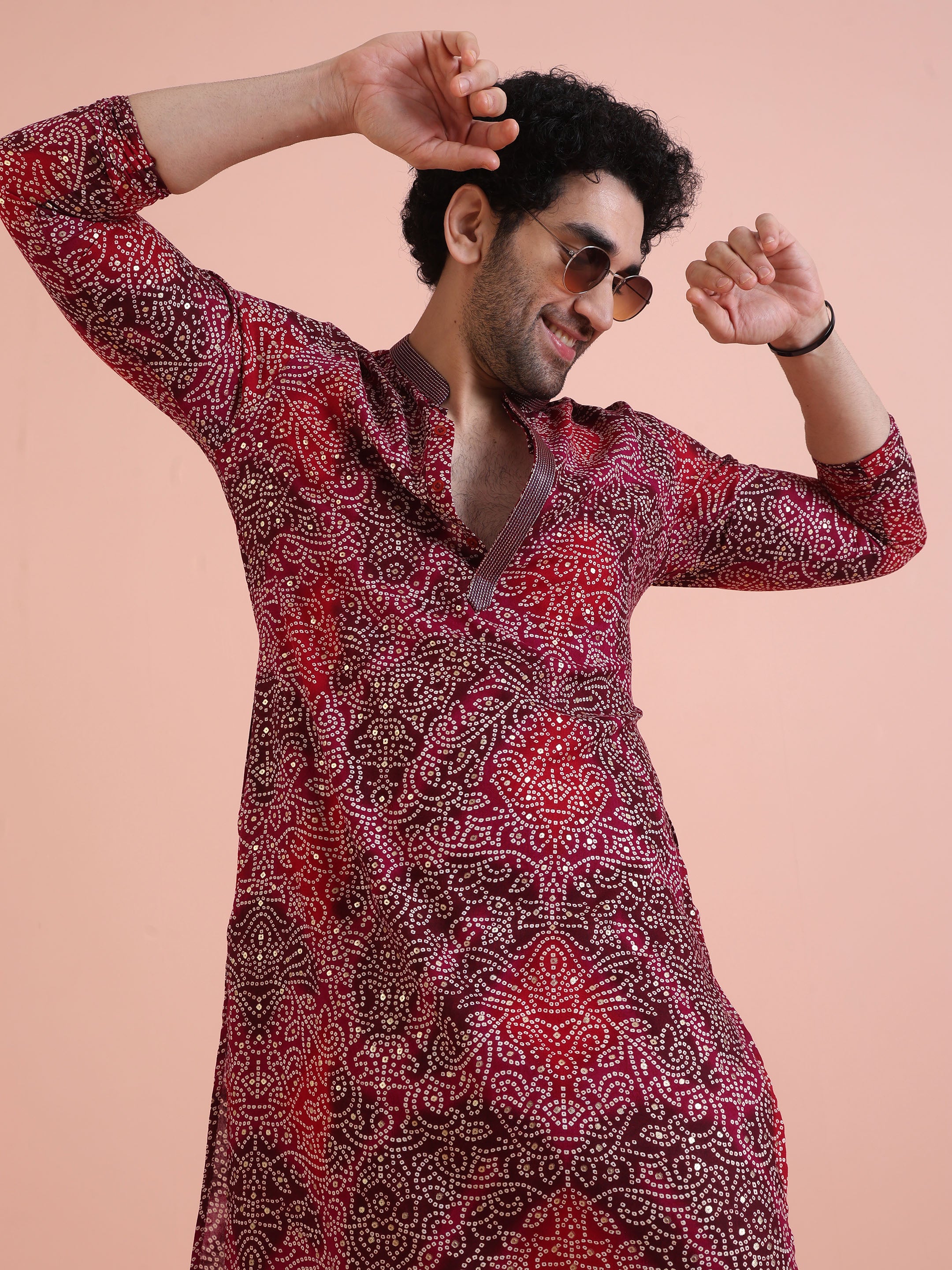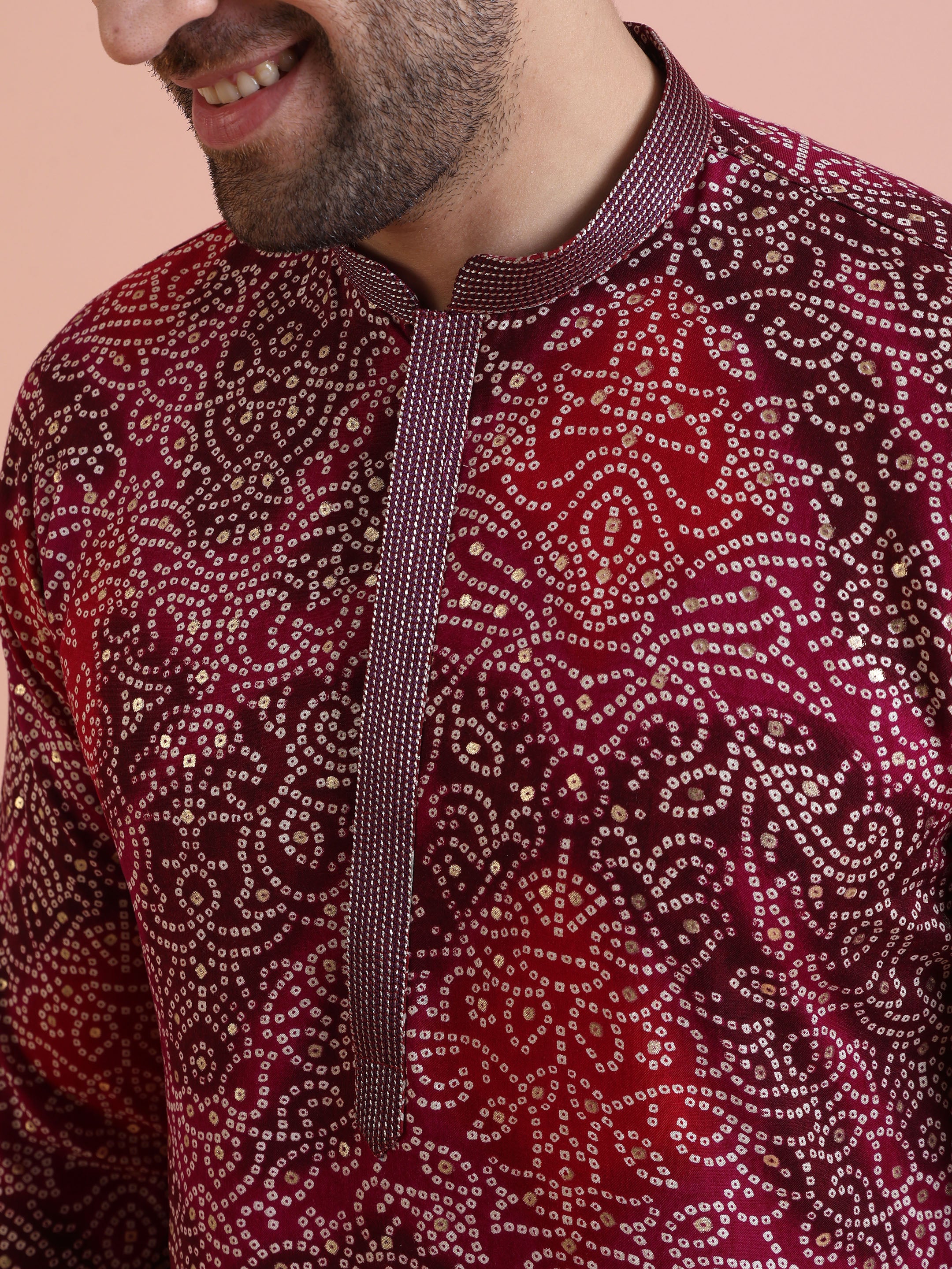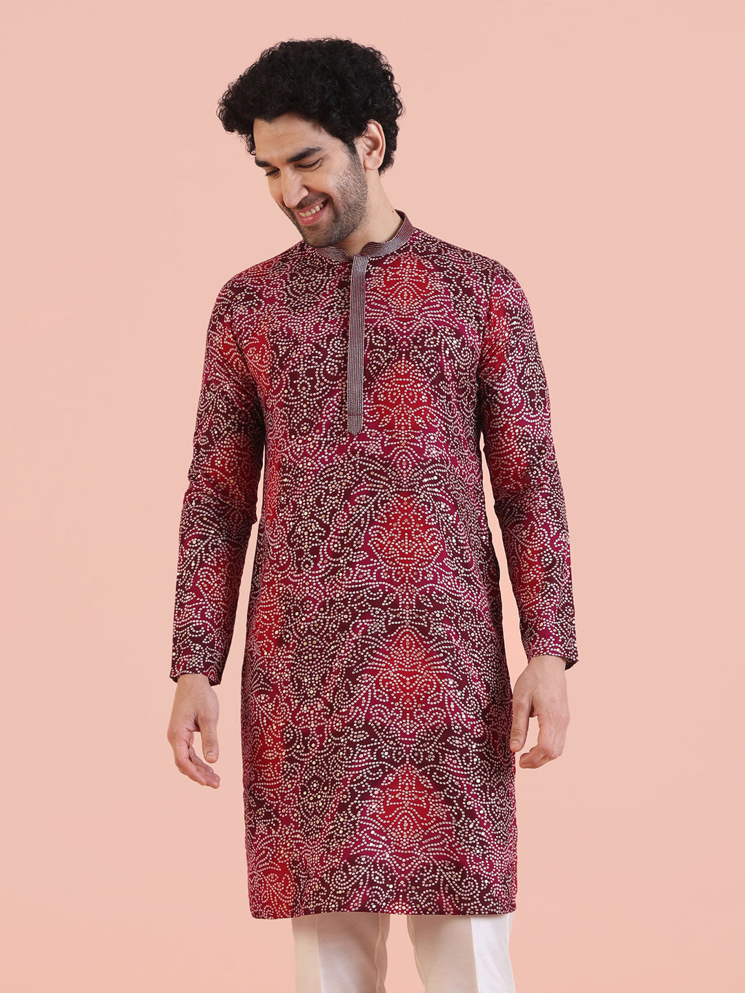 Experience classic elegance with this Men Magenta Printed Kurta with Bandhni. The breathable Silk Blend fabric ensures comfort throughout the day. Ideal for festive events or casual wear.