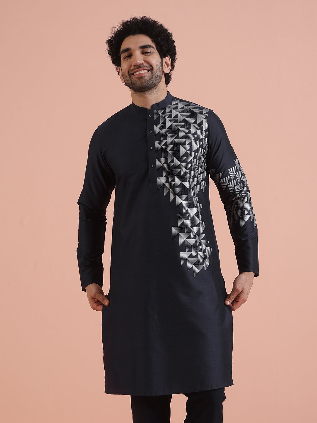 Experience classic elegance with this Men Navy Blue Printed Geometric Kurta. The Printed Pattern adds a refined touch, while the breathable Cotton Blend fabric ensures comfort throughout the day. Ideal for festive events or casual wear, this Kurta is a wardrobe essential..
