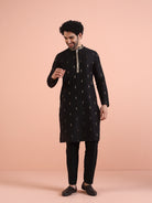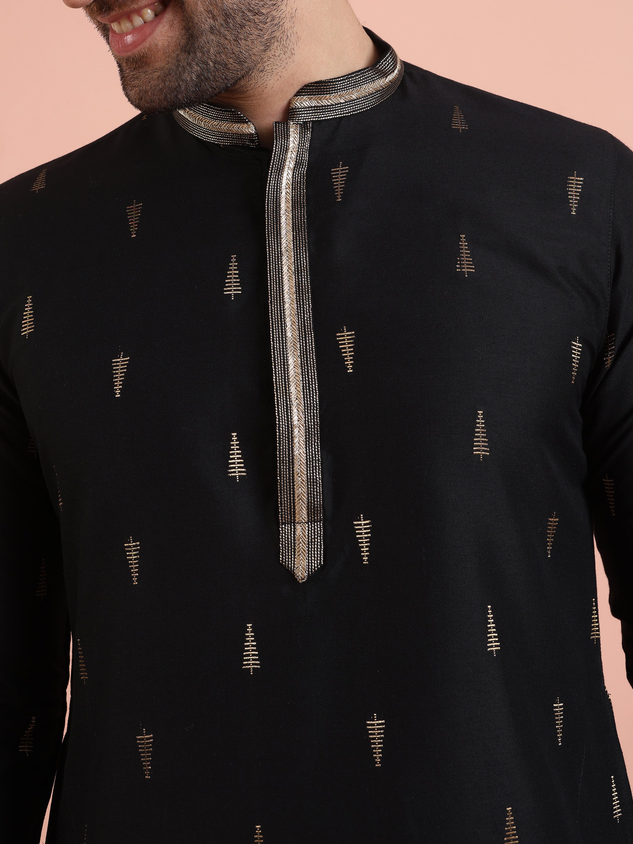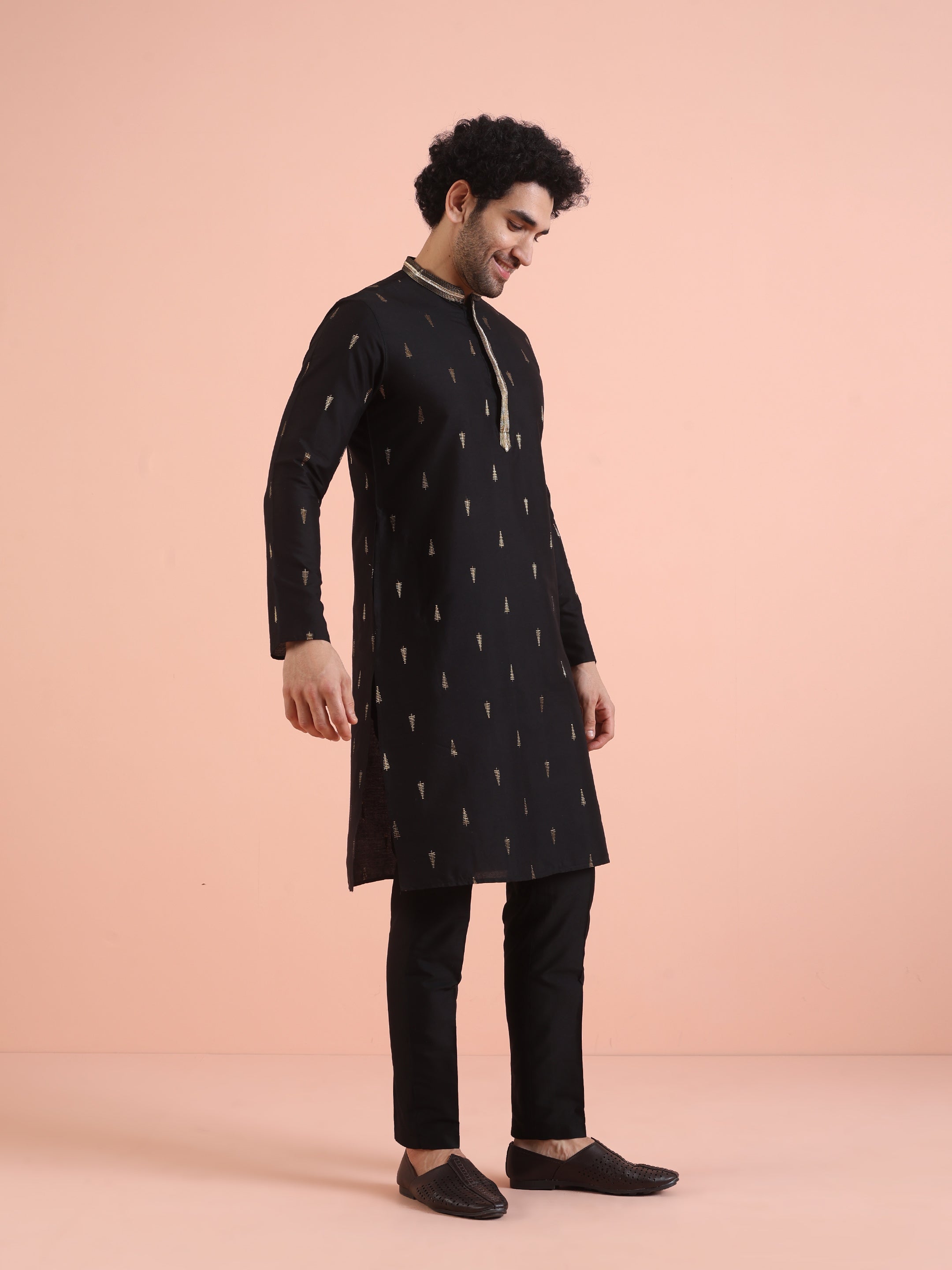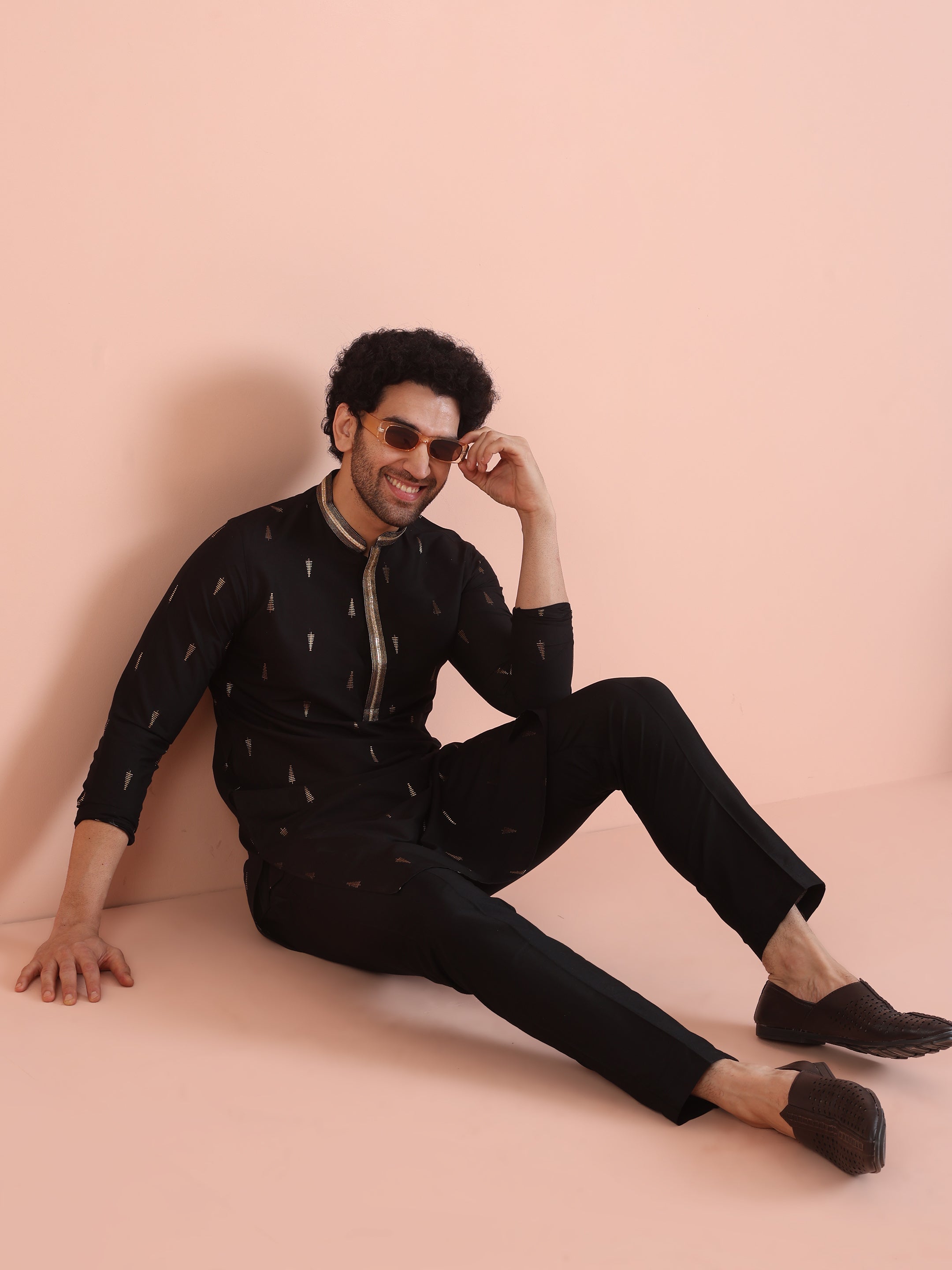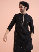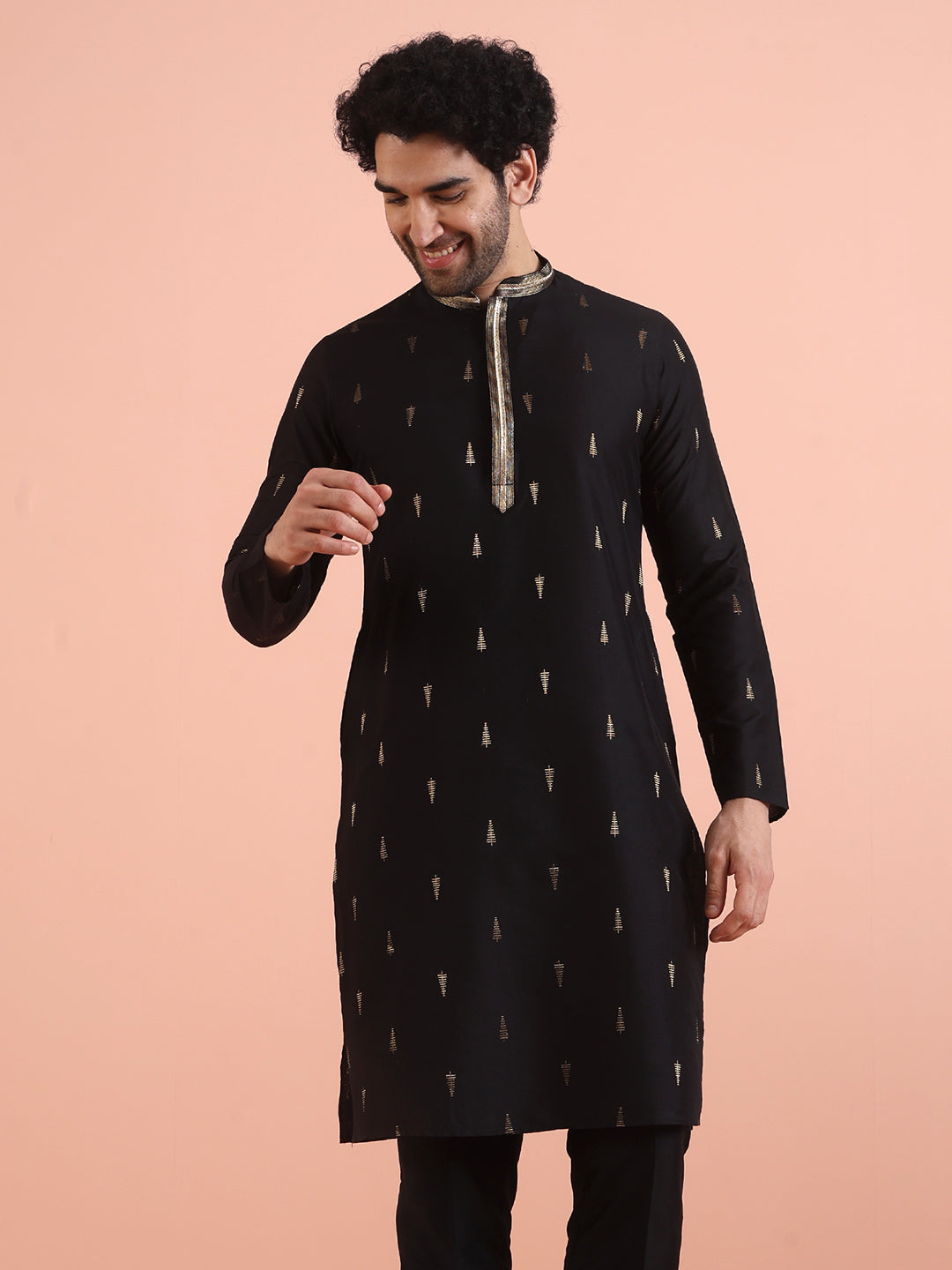 Experience classic elegance with this Men Black Jacquard Kurta with Ethnic Motifs. The breathable Silk Blend fabric ensures comfort throughout the day. Ideal for festive events or casual wear.
