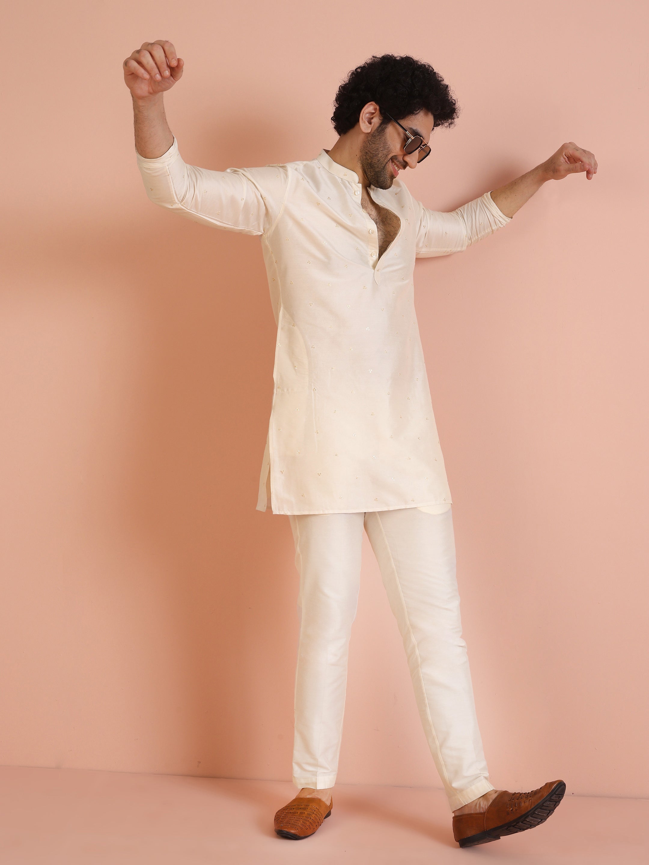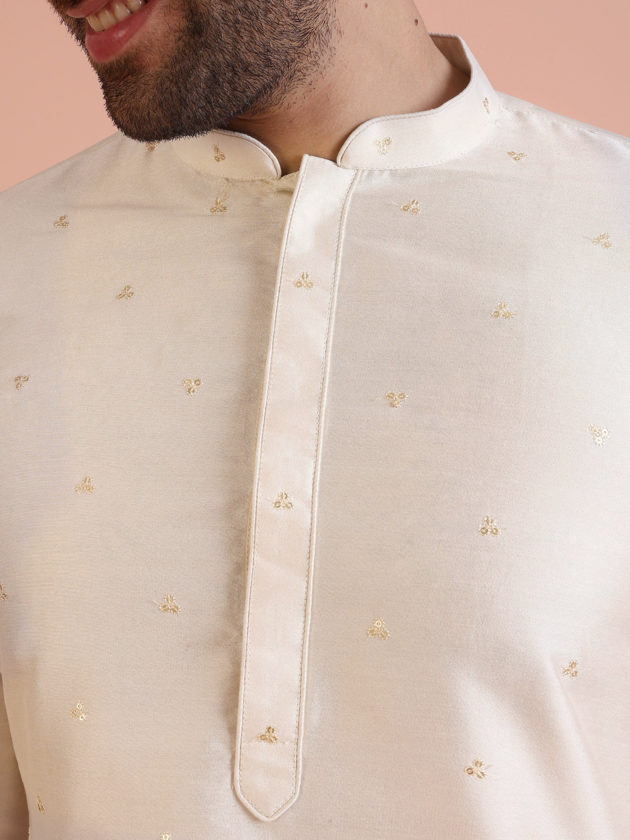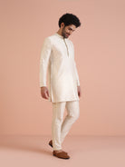 Experience classic elegance with this Men Off White Embroidered Kurta with Sequinned. The breathable Cotton Blend fabric ensures comfort throughout the day. Ideal for festive events or casual wear.
