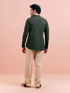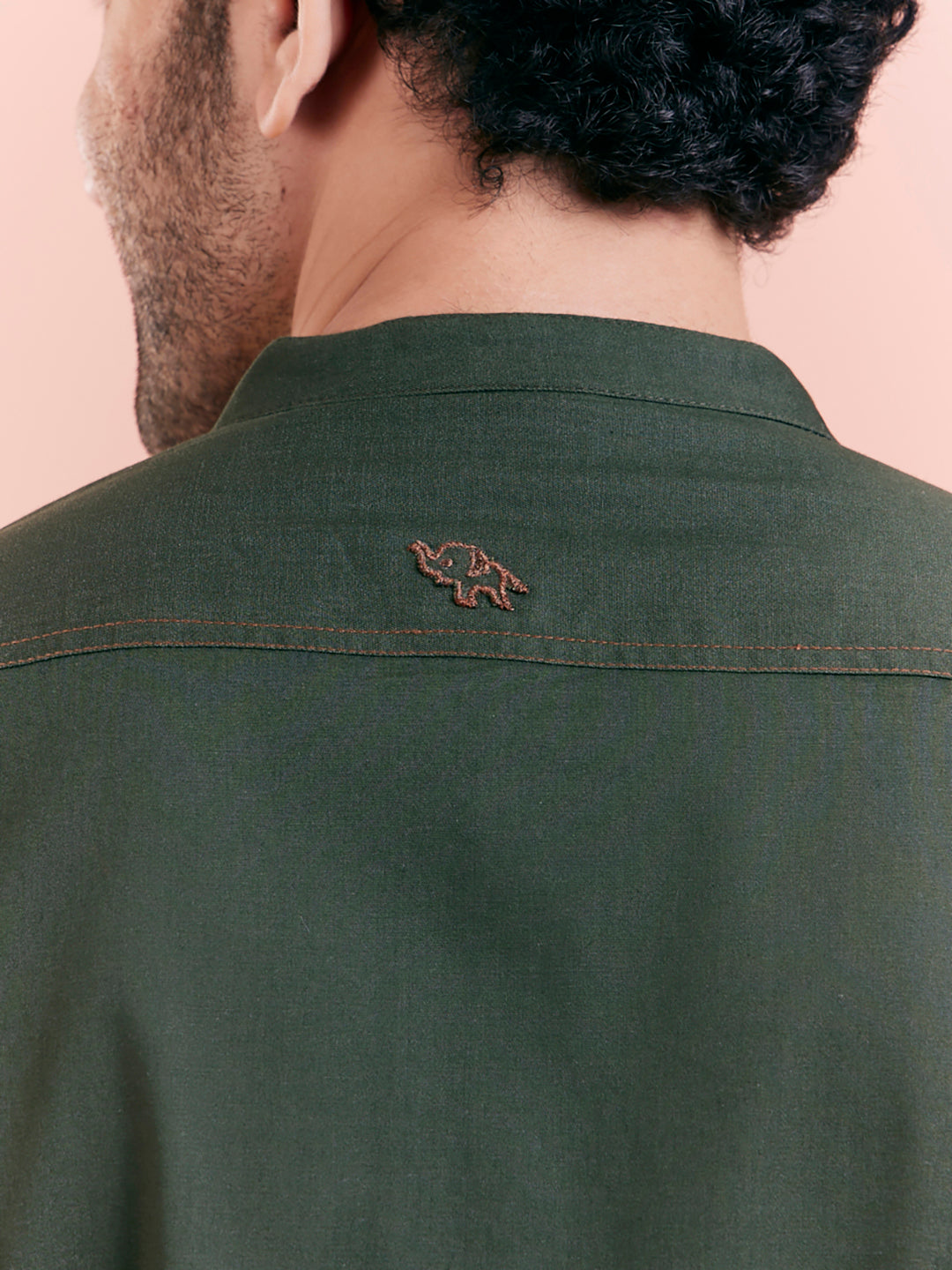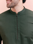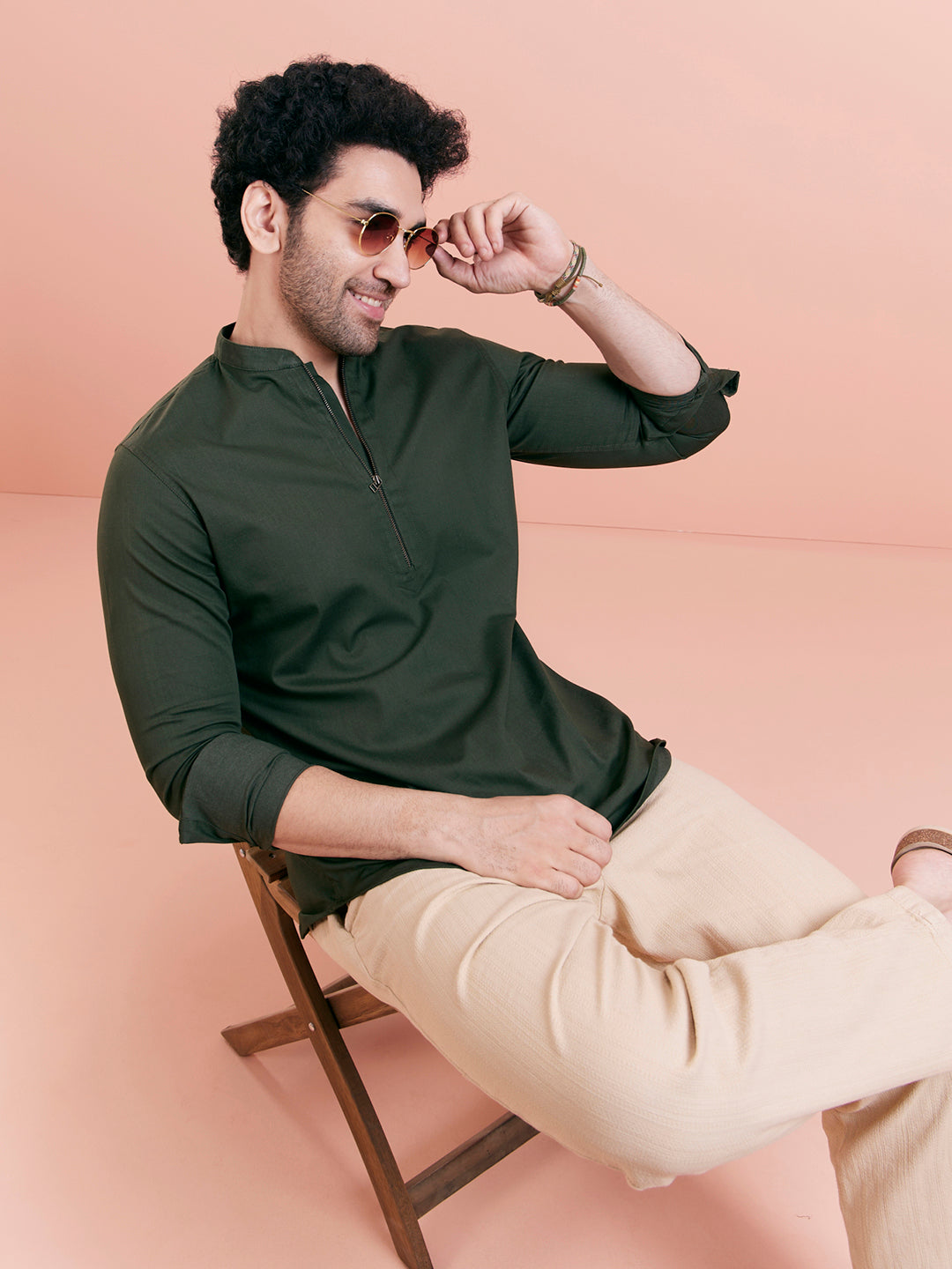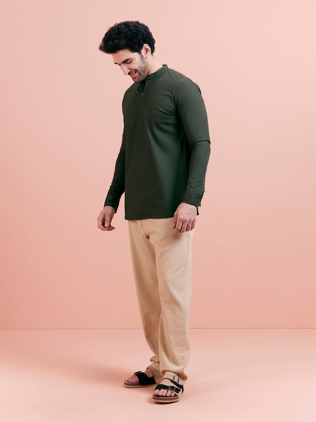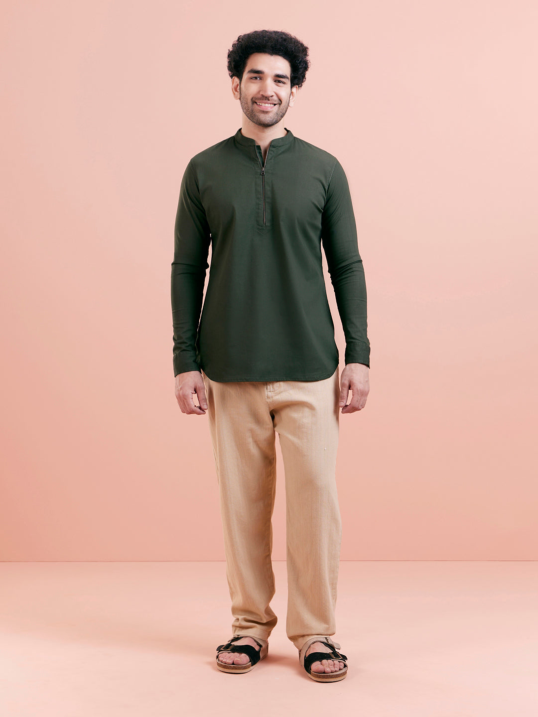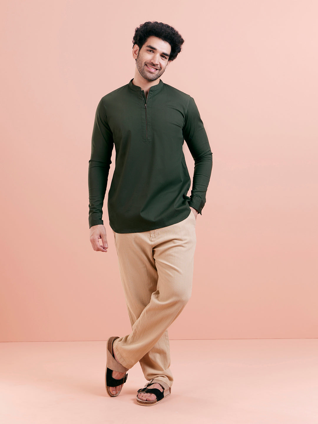 This olive denim short kurta features a sleek front zipper and mandarin collar, perfect for festive or casual fusion looks.