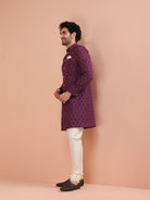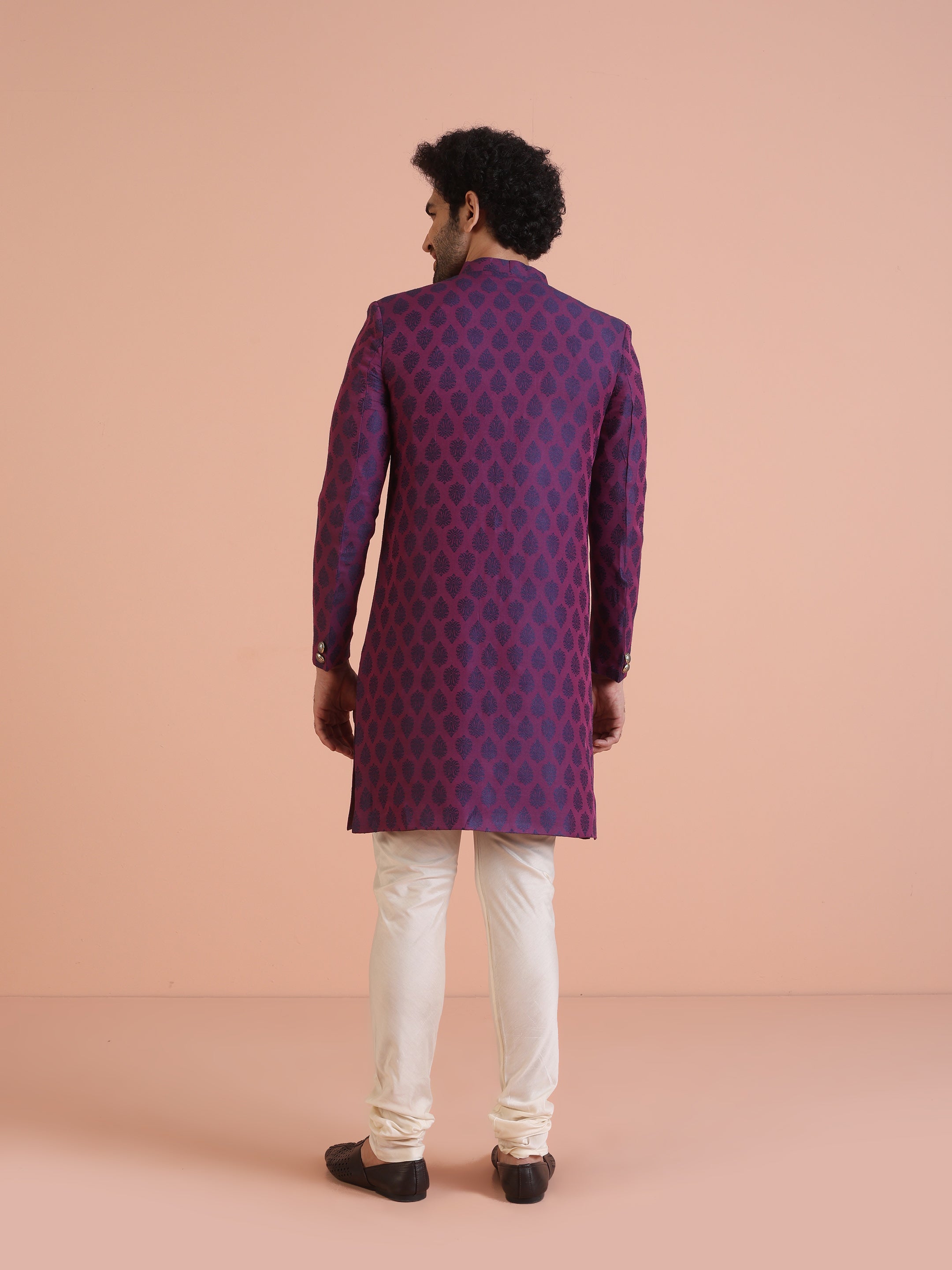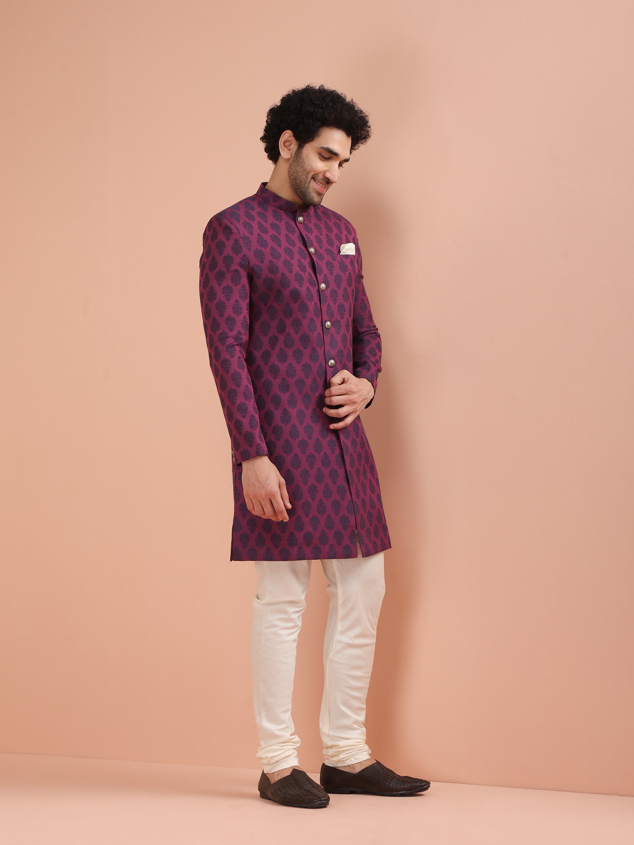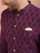 Experience classic elegance with this Men Magenta Jacquard Indowestern Churidar Set with Ethnic Motifs. The breathable Silk Blend fabric ensures comfort throughout the day. Ideal for festive events or casual wear.
