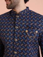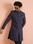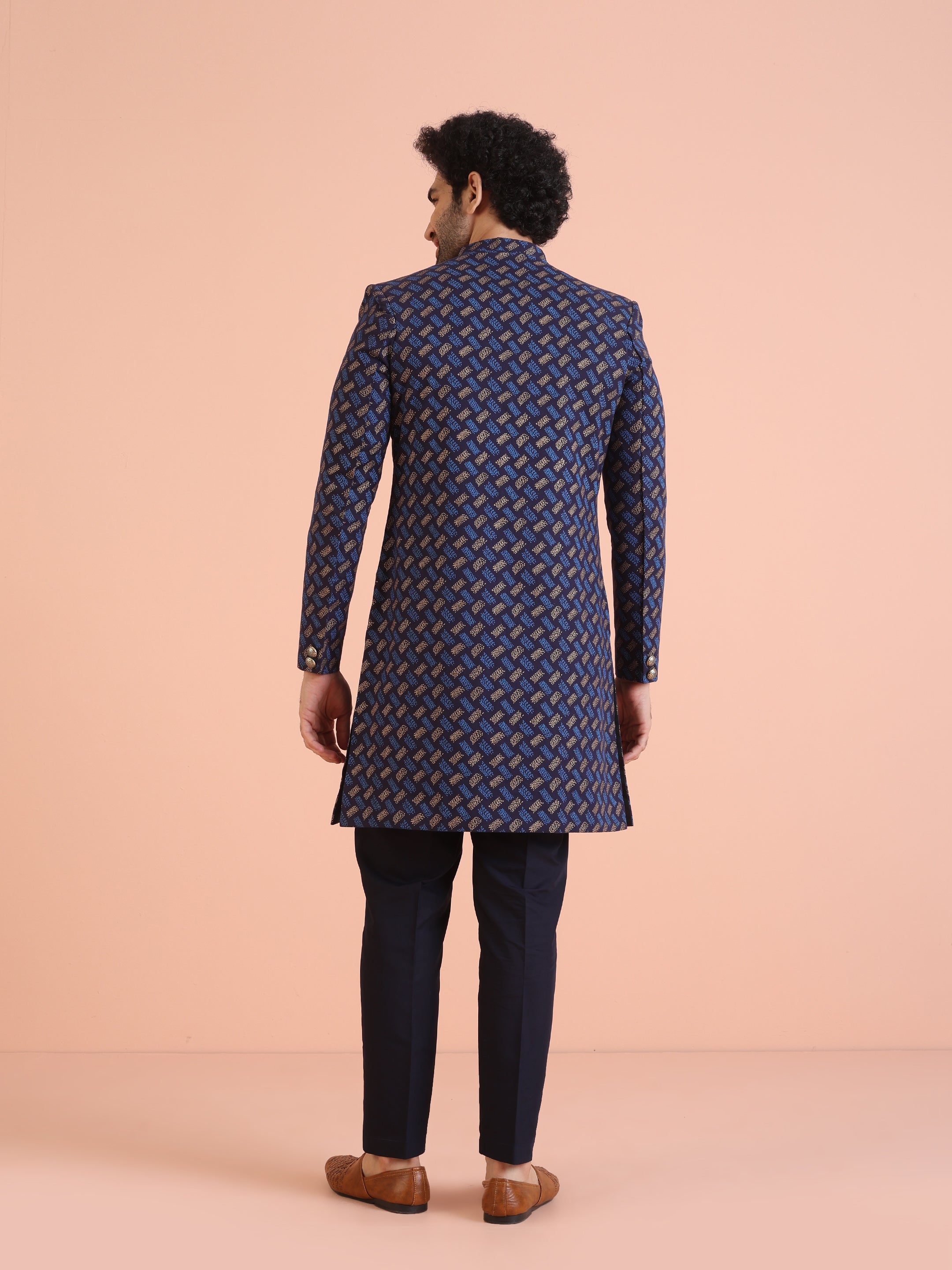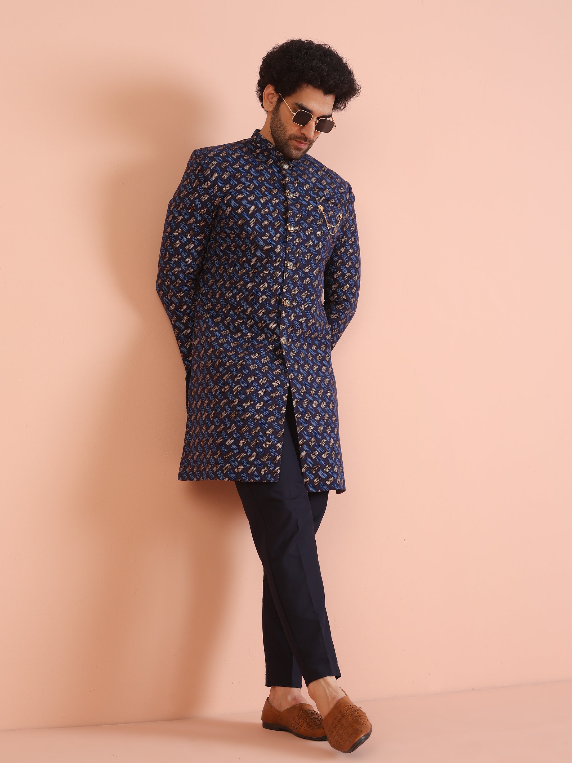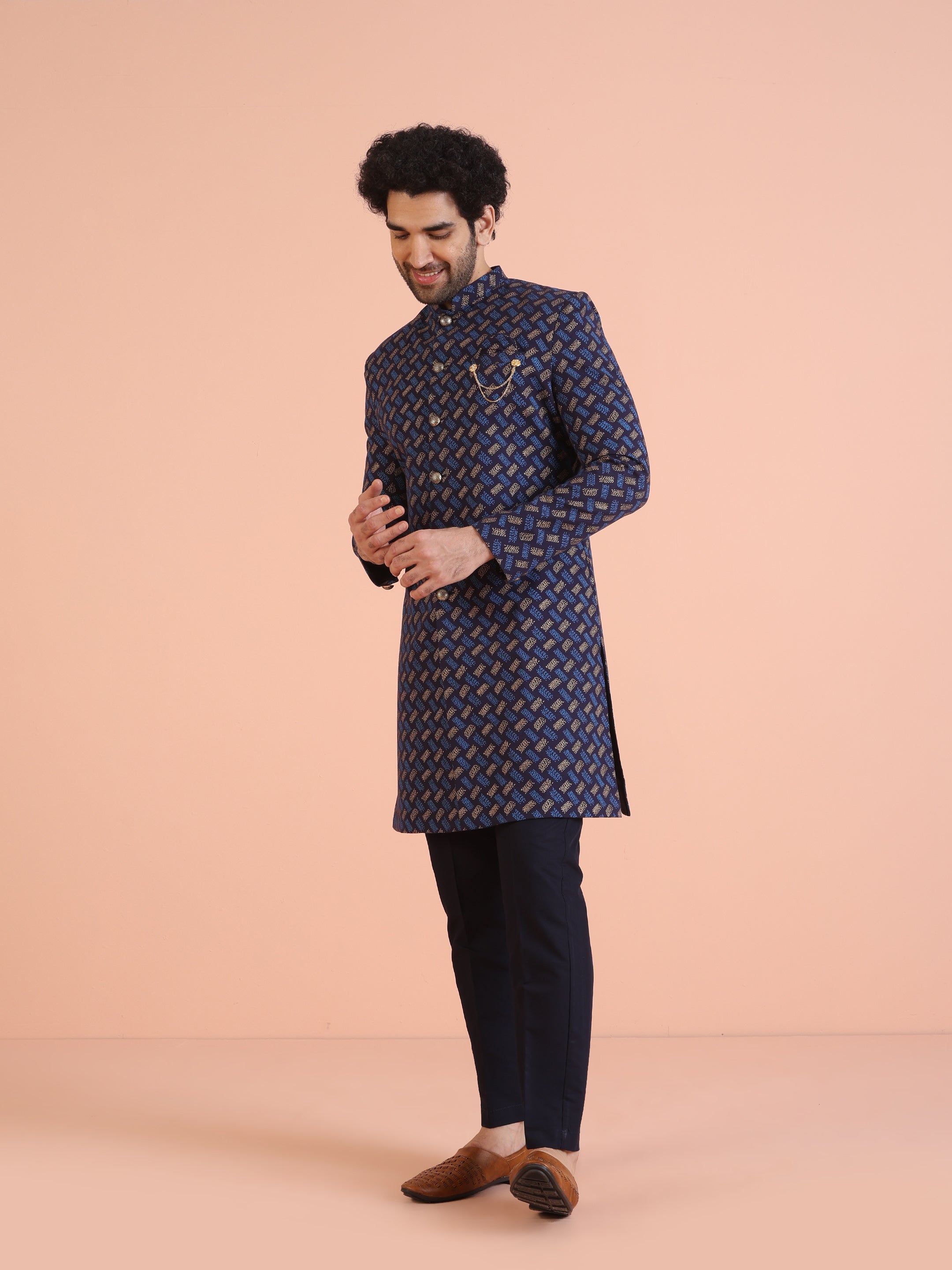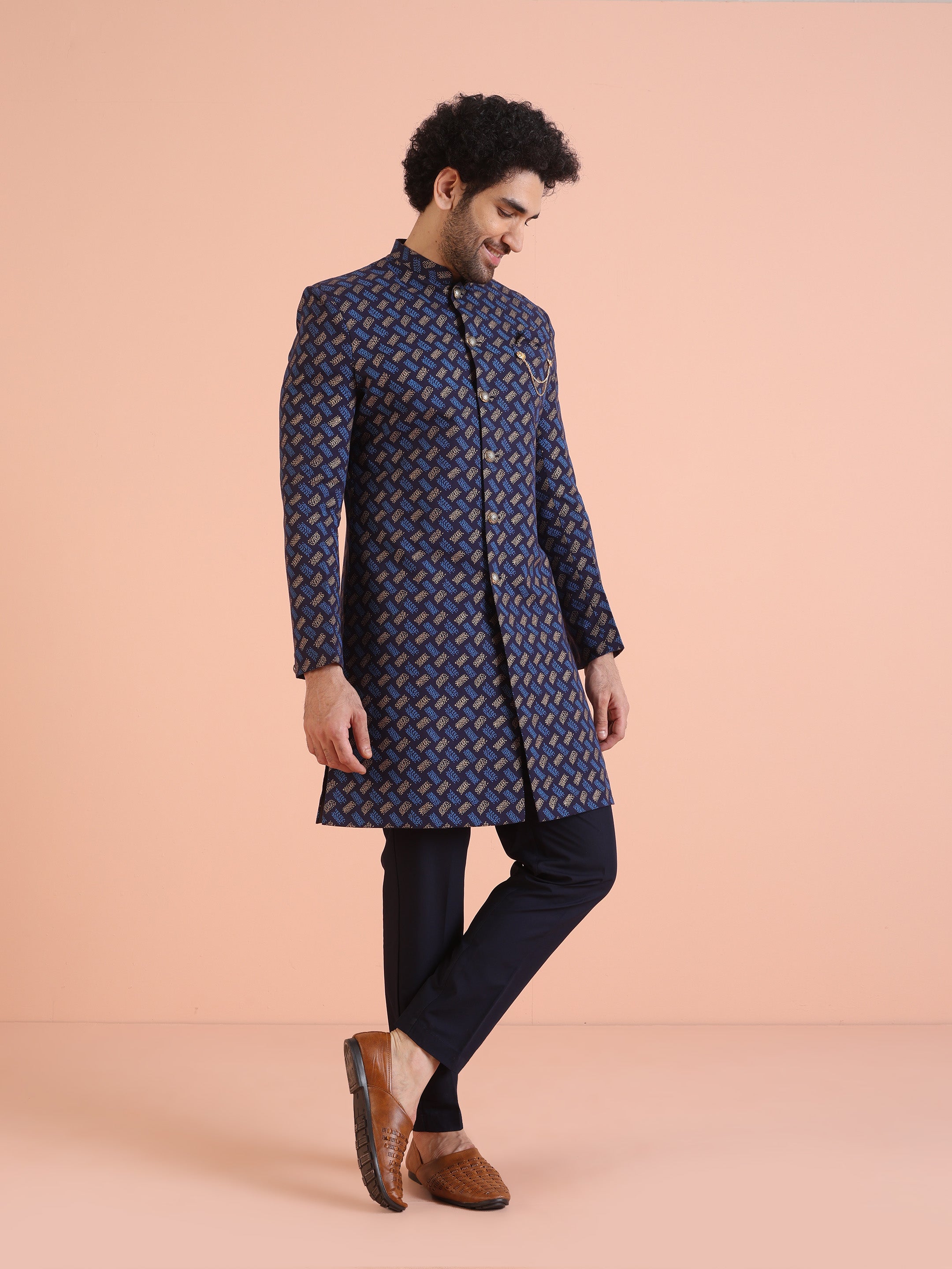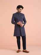 Enhance your style with this navy blue silk blend jacquard Indowestern and trouser set. Featuring a textured design and regular fit, it's ideal for festive gatherings.