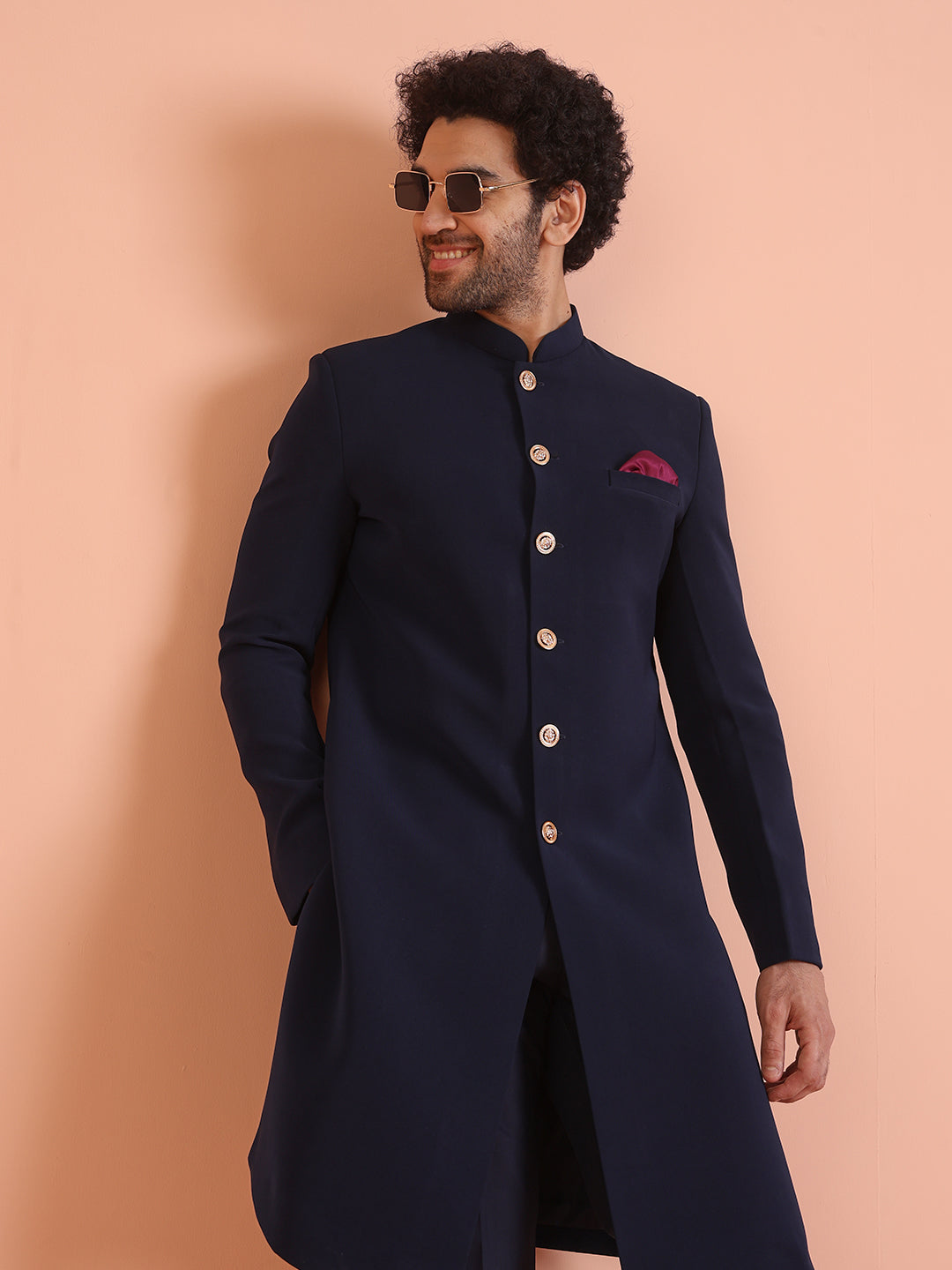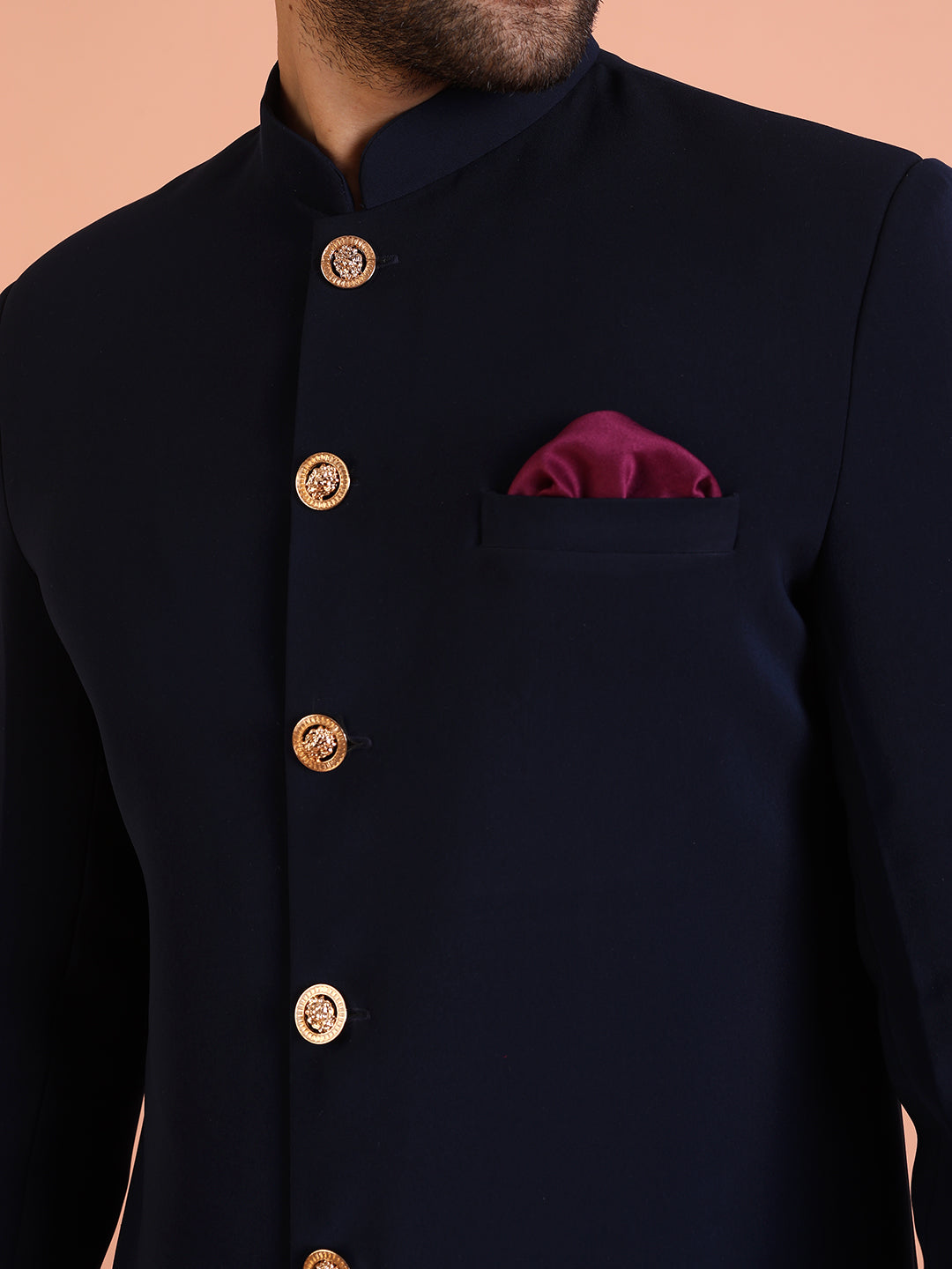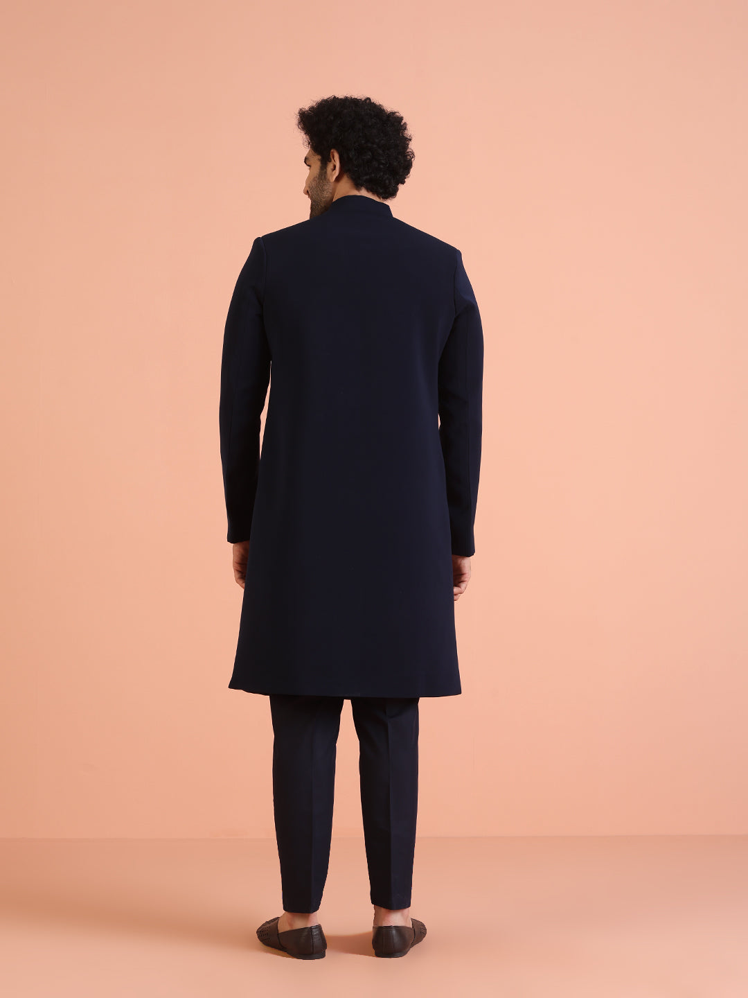 Experience classic elegance with this Men Navy Blue Solid Indowestern Trouser Set. The Solid Pattern adds a refined touch, while the breathable Cotton Blend fabric ensures comfort throughout the day. Ideal for festive events or casual wear, this Indowestern Trouser Set is a wardrobe essential..