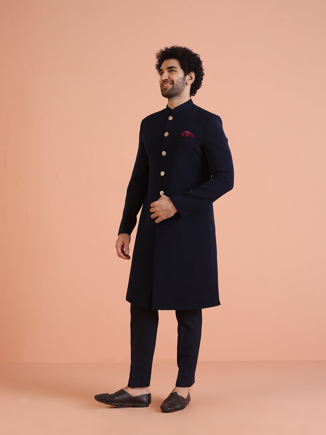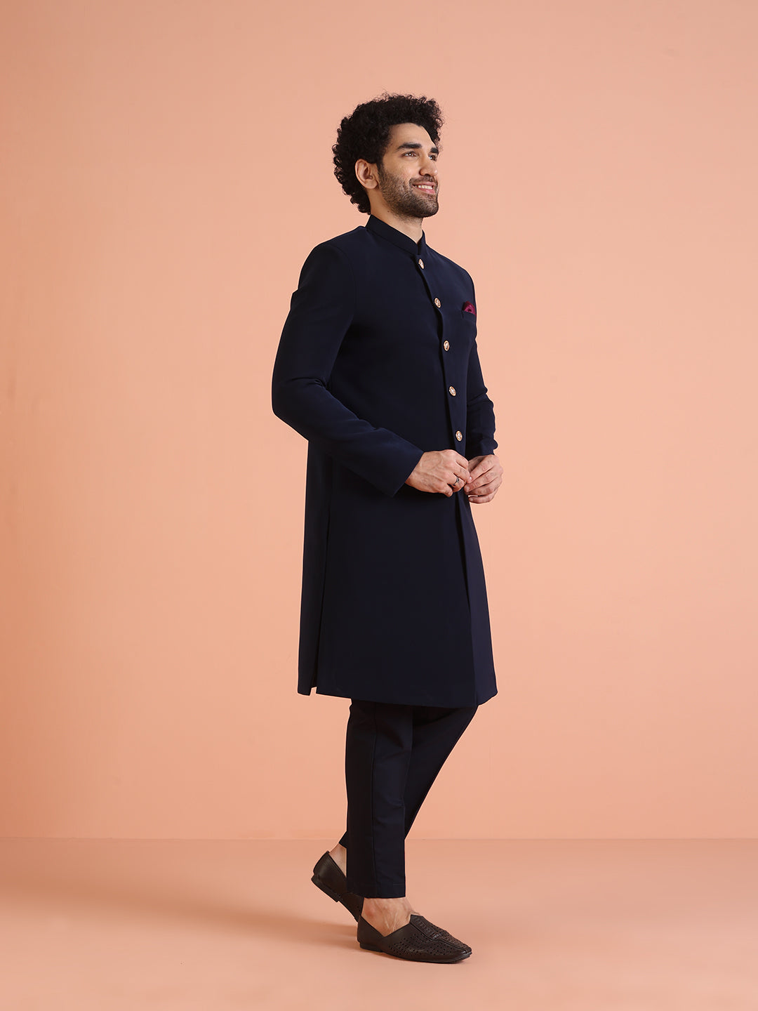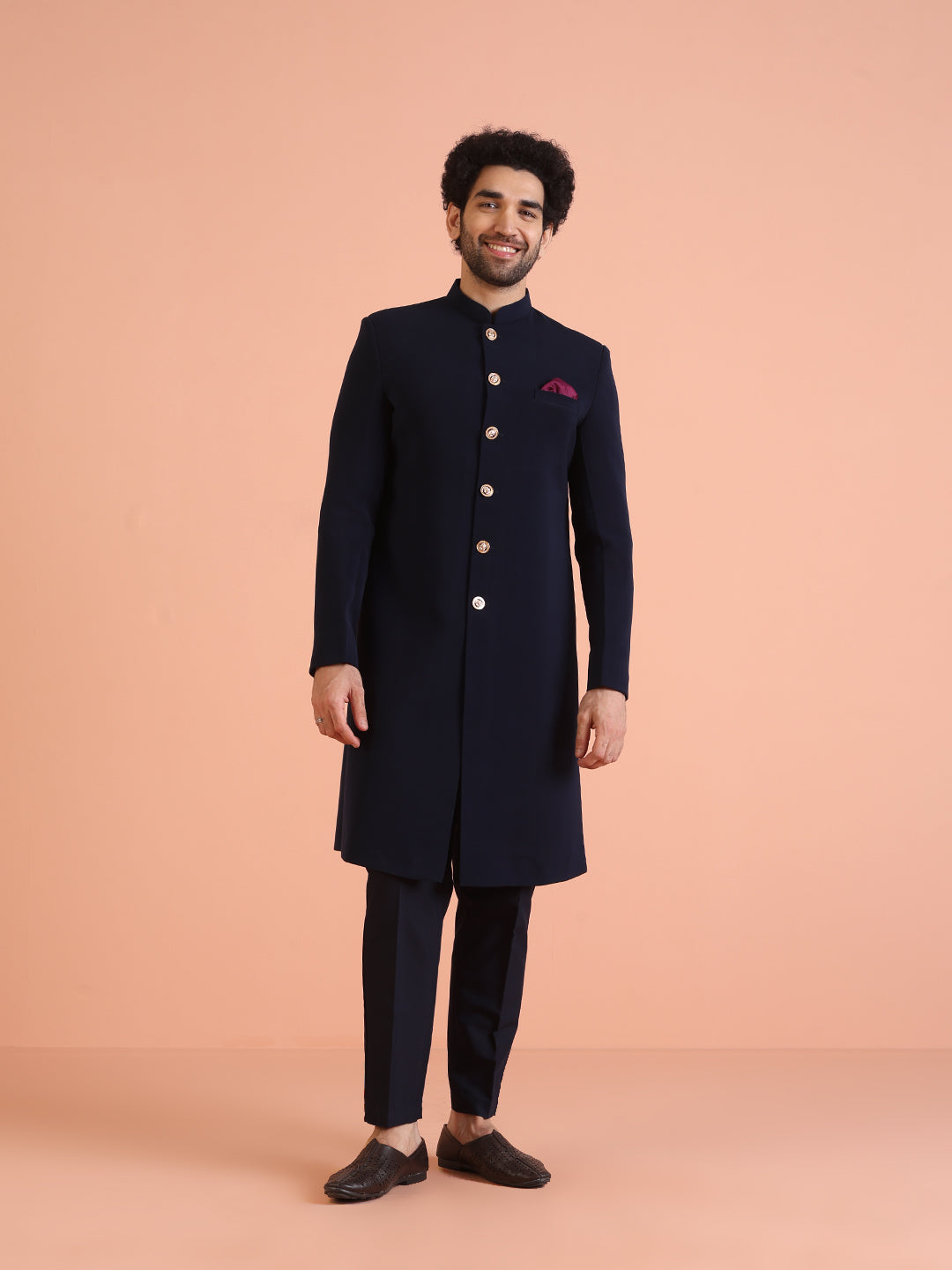 Experience classic elegance with this Men Navy Blue Solid Indowestern Trouser Set. The Solid Pattern adds a refined touch, while the breathable Cotton Blend fabric ensures comfort throughout the day. Ideal for festive events or casual wear, this Indowestern Trouser Set is a wardrobe essential..
