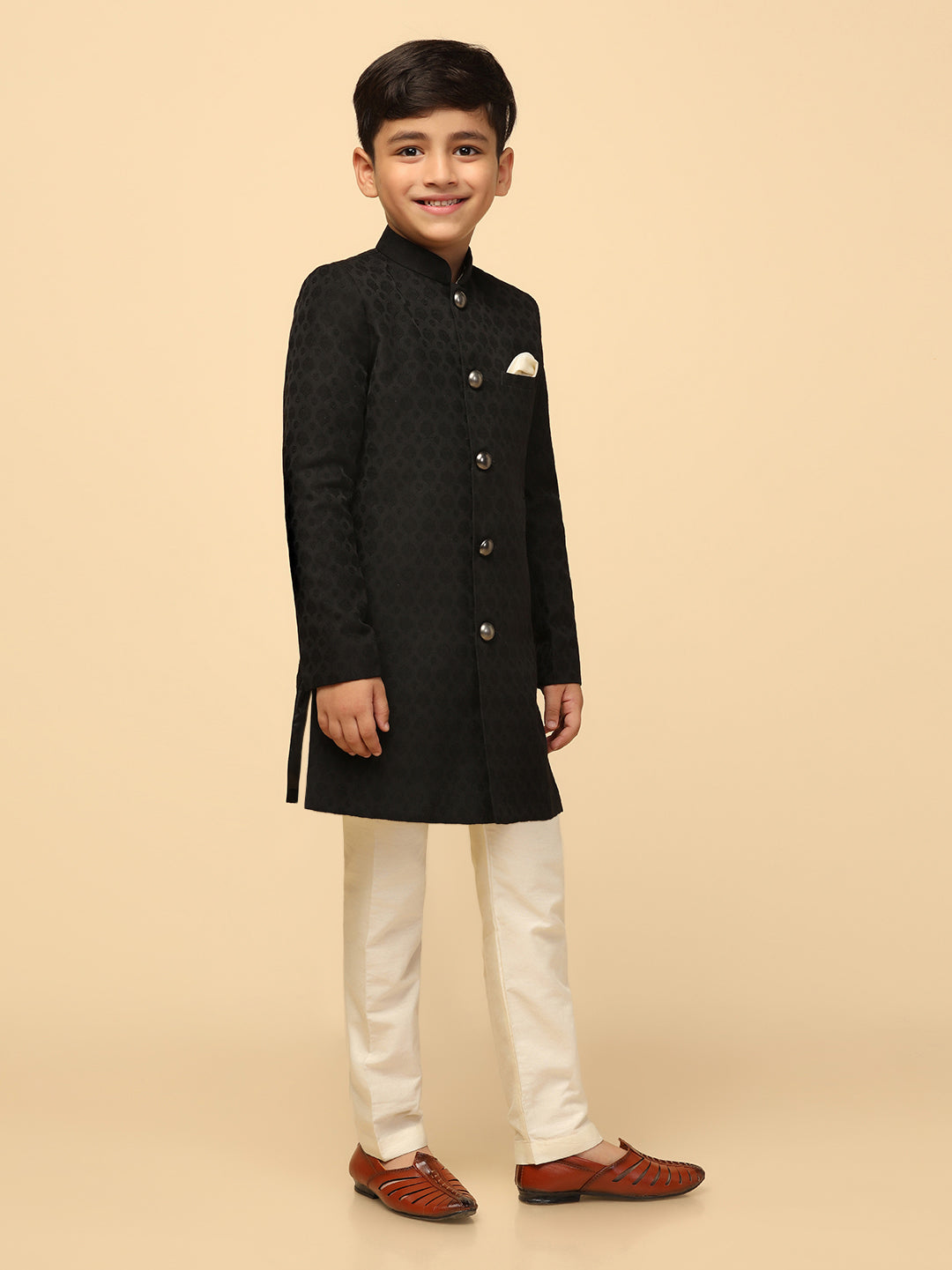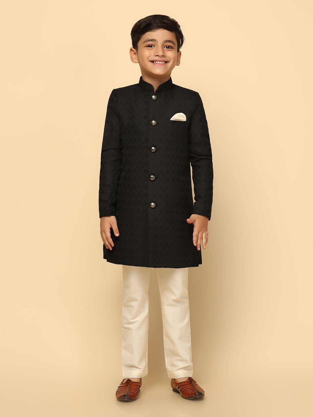 The Kisah Indo-Western Set is ideal for boys looking for stylish yet comfortable attire. Crafted from Silk Blend fabric, Black color, stylish Jacquard pattern, and It is a great addition to your boys wardrobe and will win you compliments from everyone.