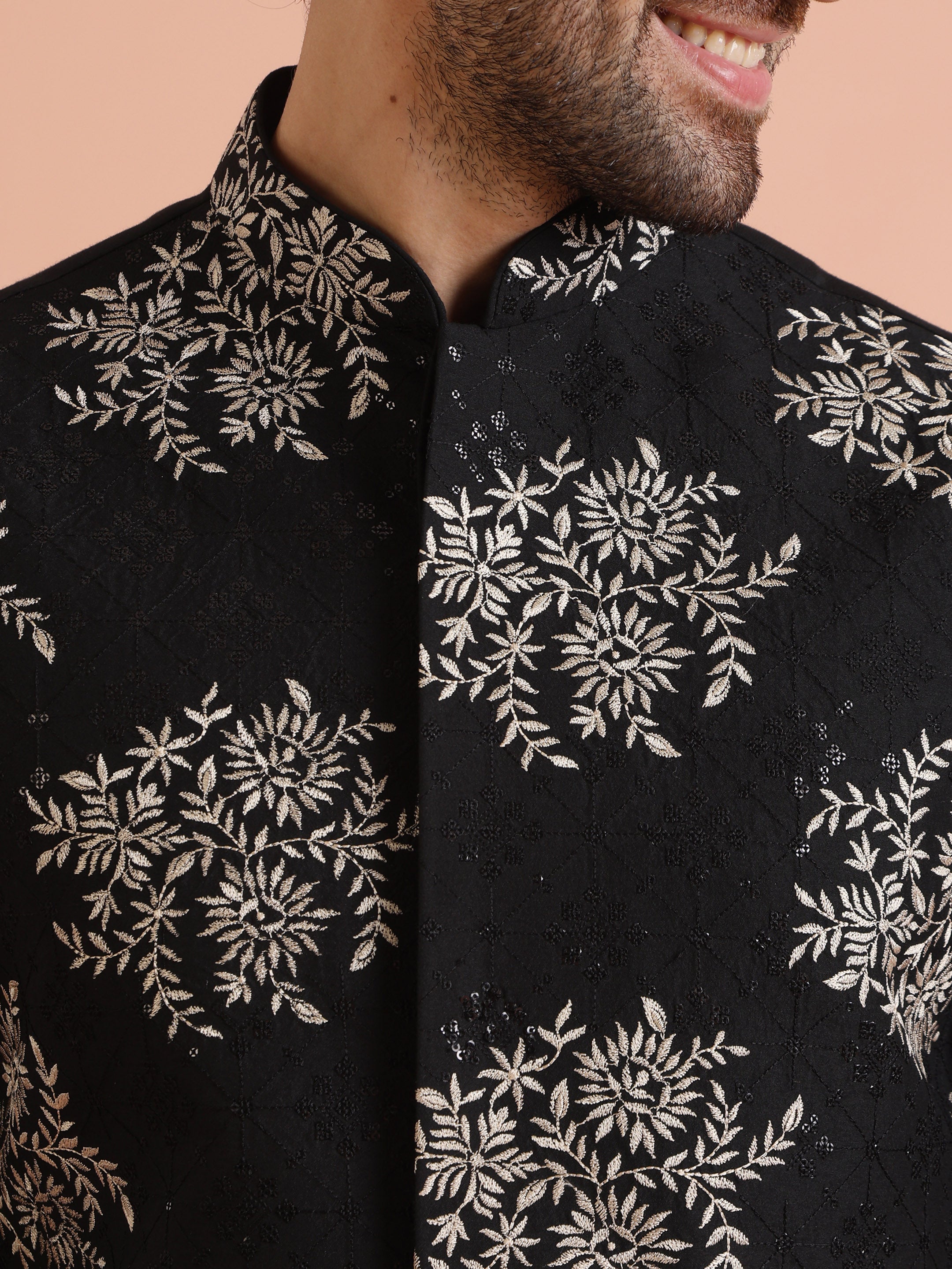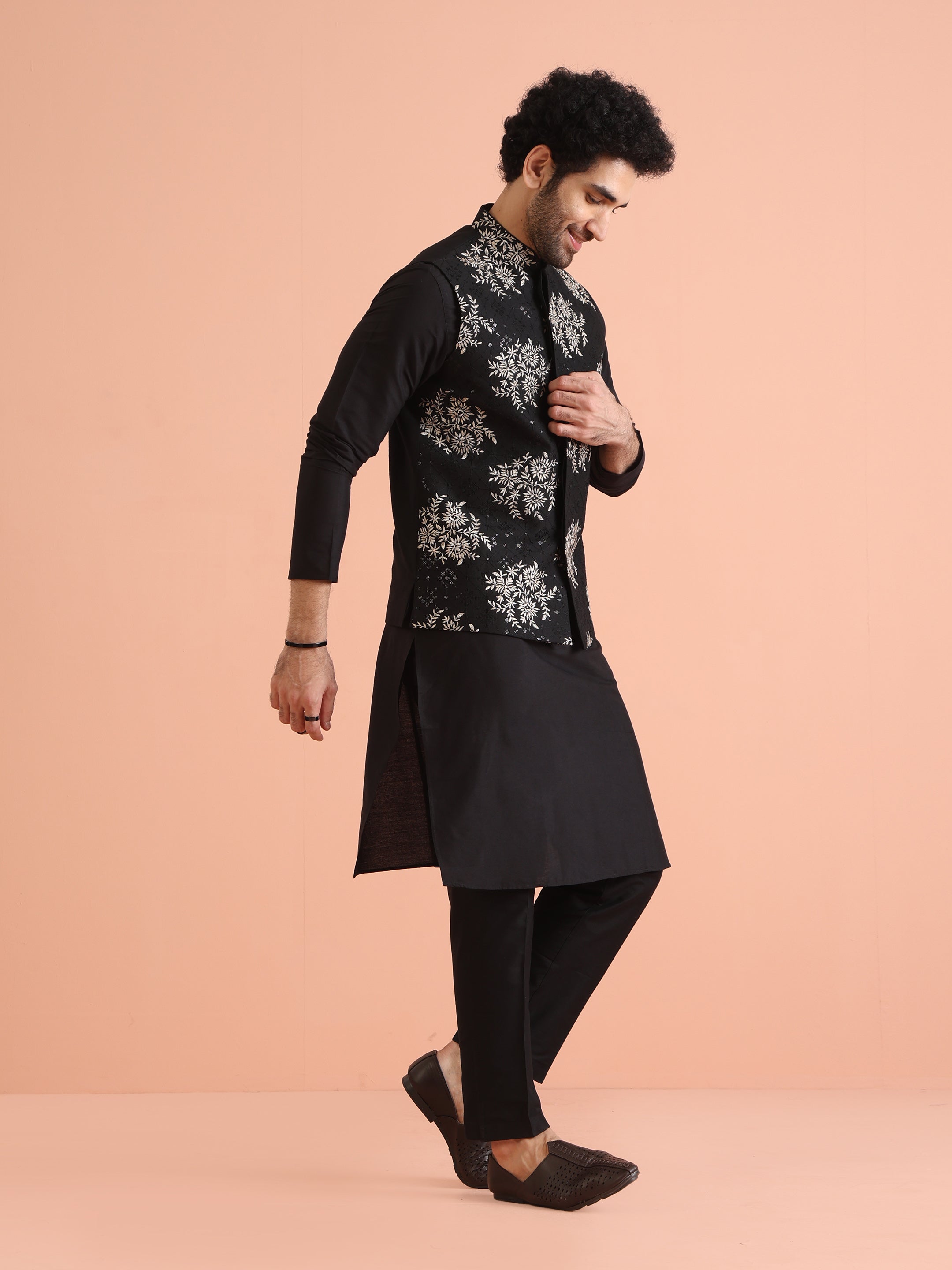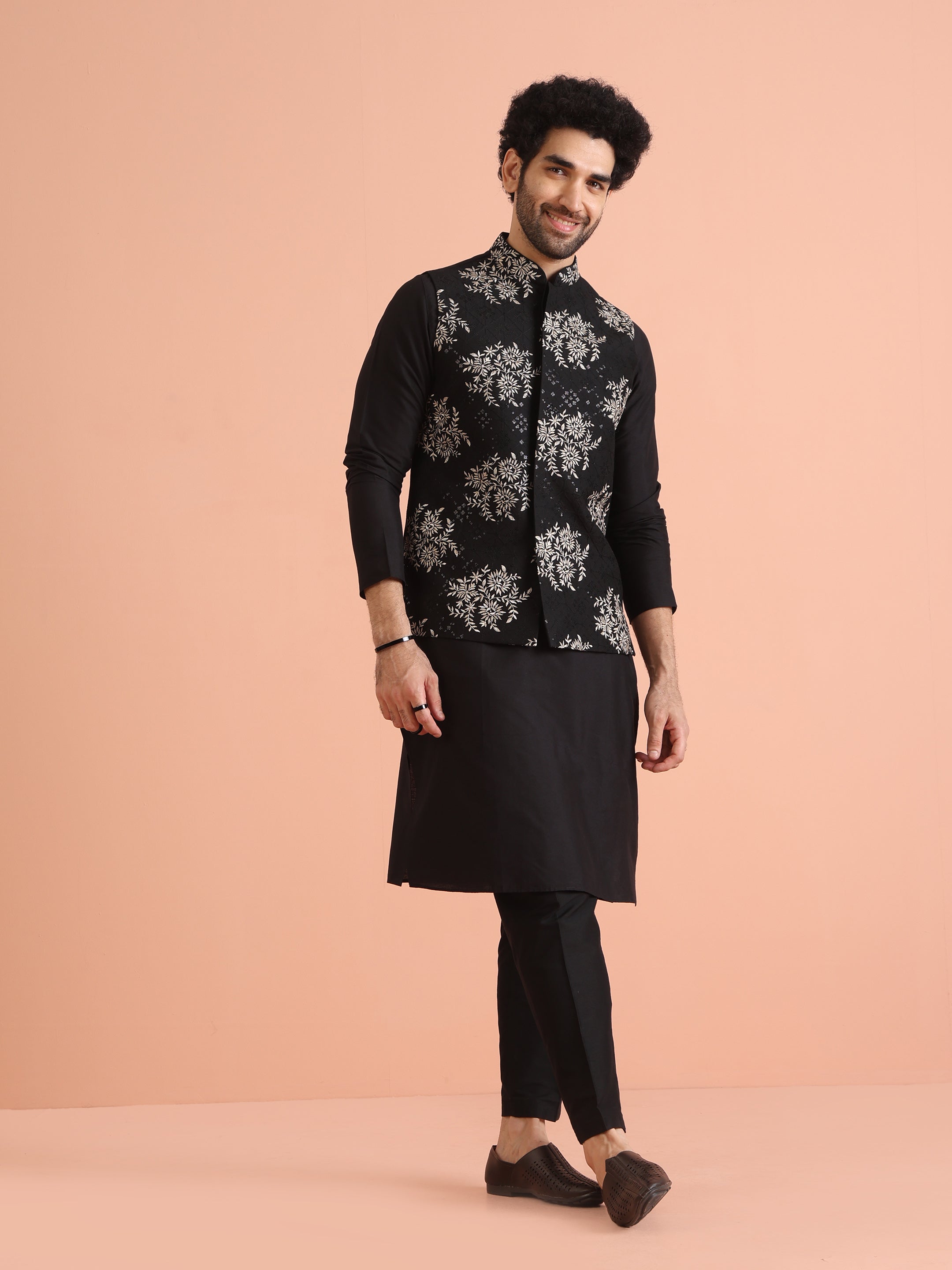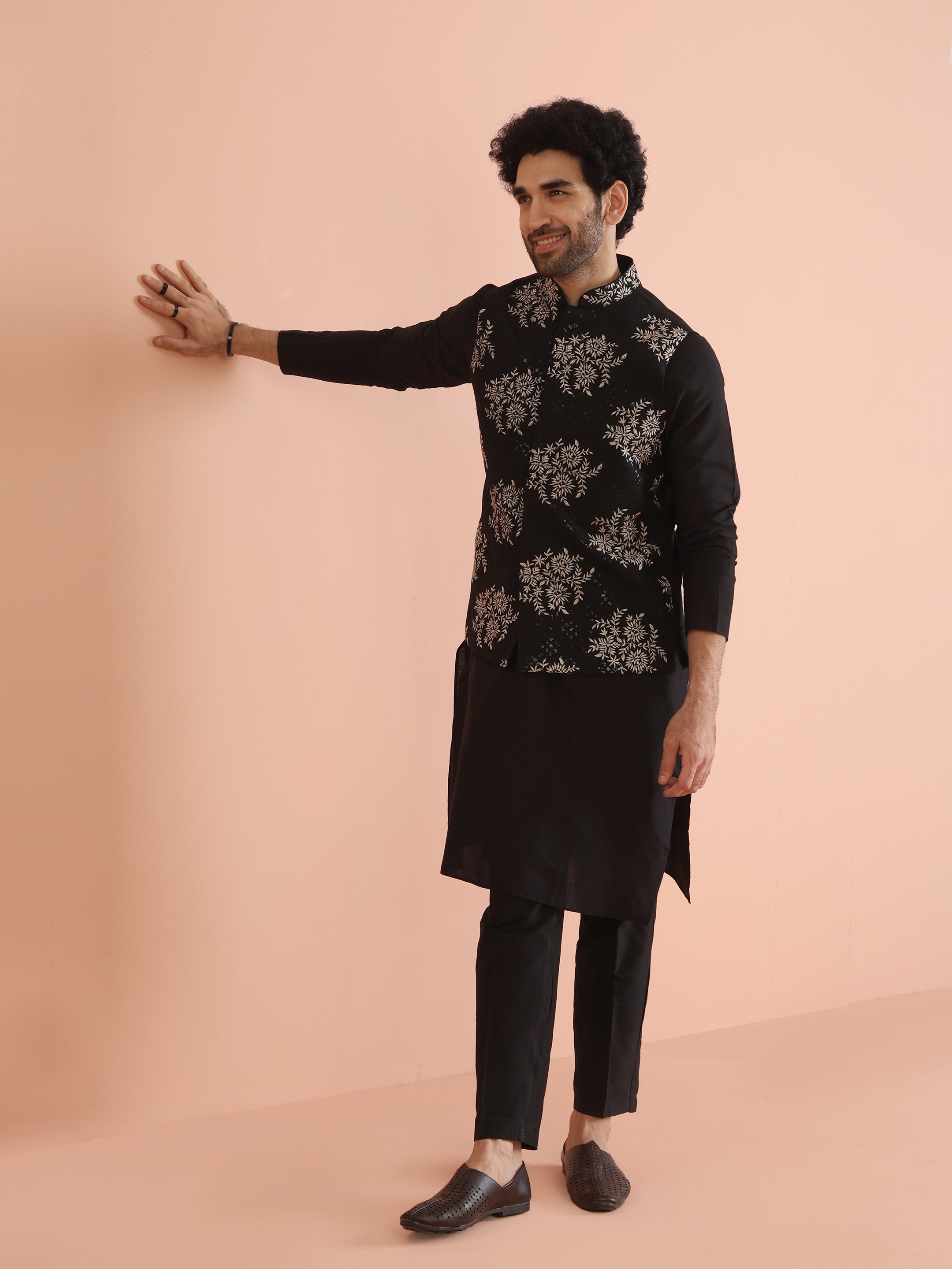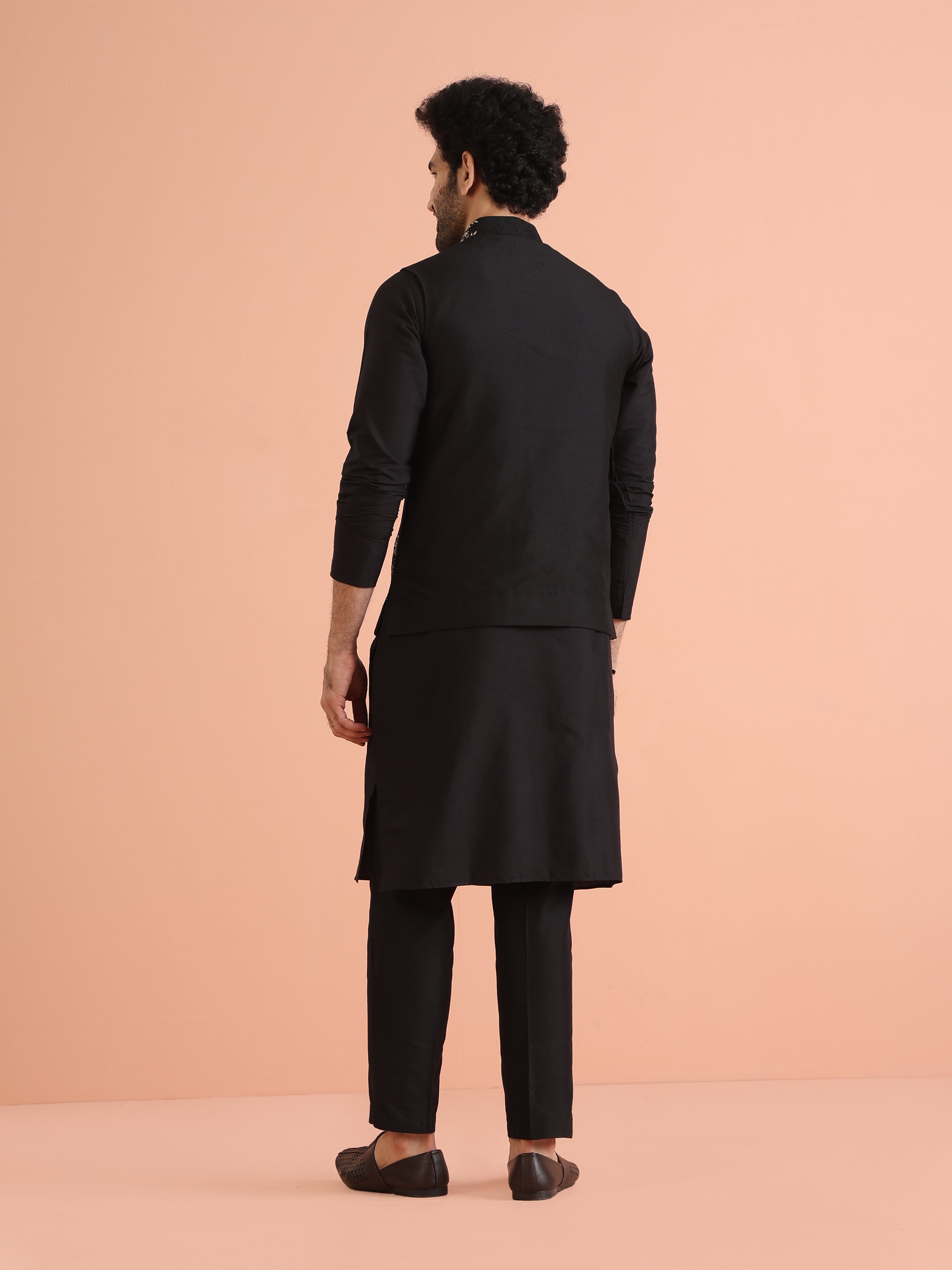 Experience classic elegance with this Men's Black Color Blended Kurta Jacket Trouser Set. The Embellished Pattern adds a refined touch, while the breathable fabric ensures comfort throughout the day. Ideal for festive events or casual wear, this Kurta Jacket Trouser Set is a wardrobe essential.