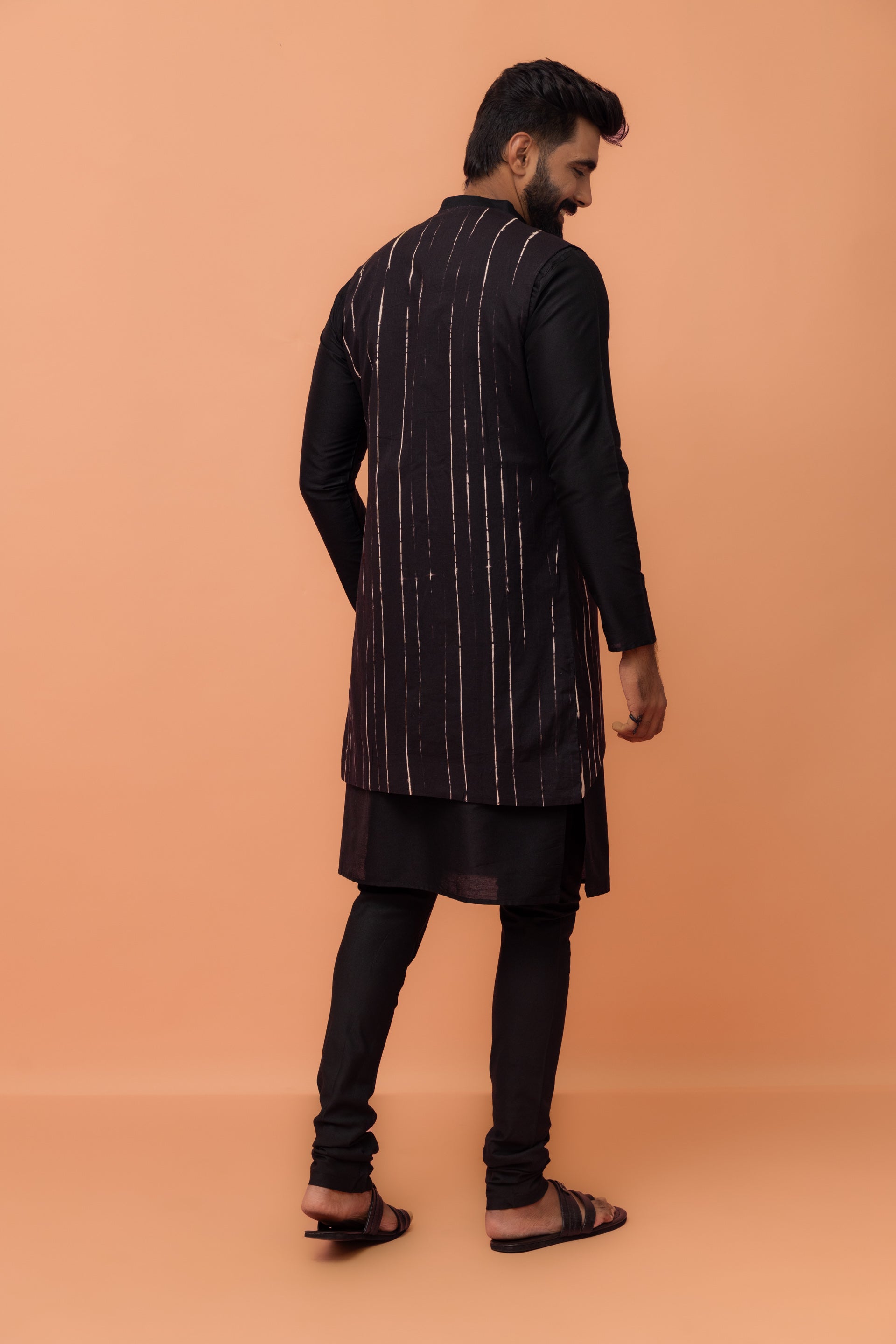 Experience classic elegance with this Kisah Men Black Cotton Blend Tie & Dye Pattern, Kurta Jacket Churidar Set. The breathable fabric ensures comfort throughout the day. Ideal for festive events or casual wear.