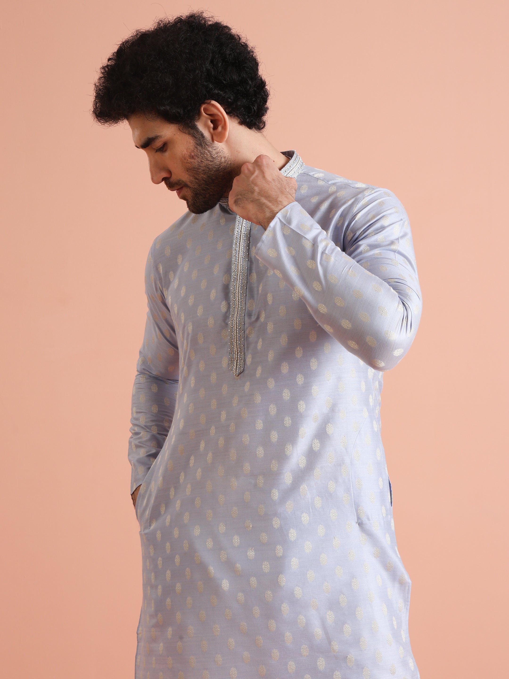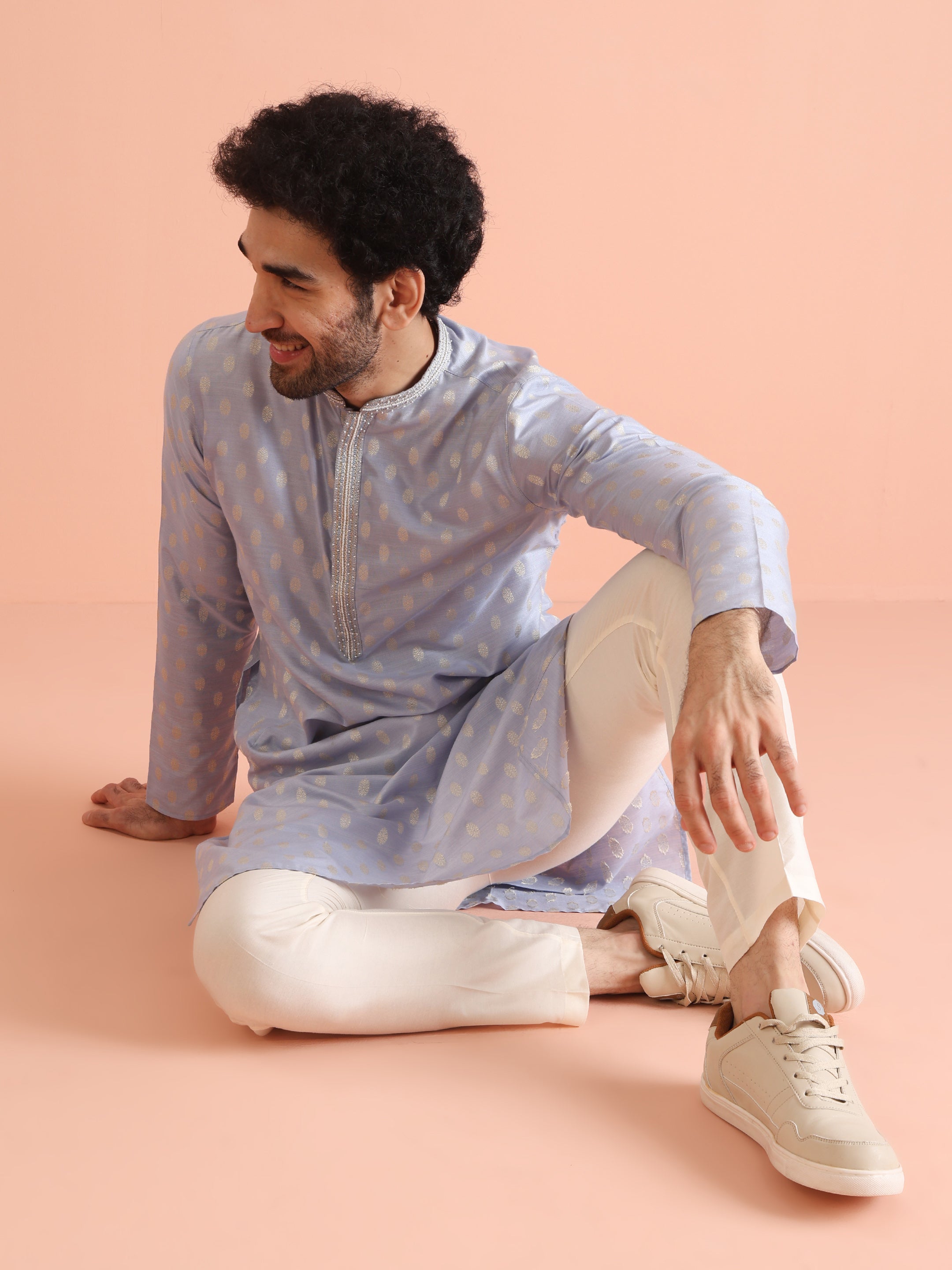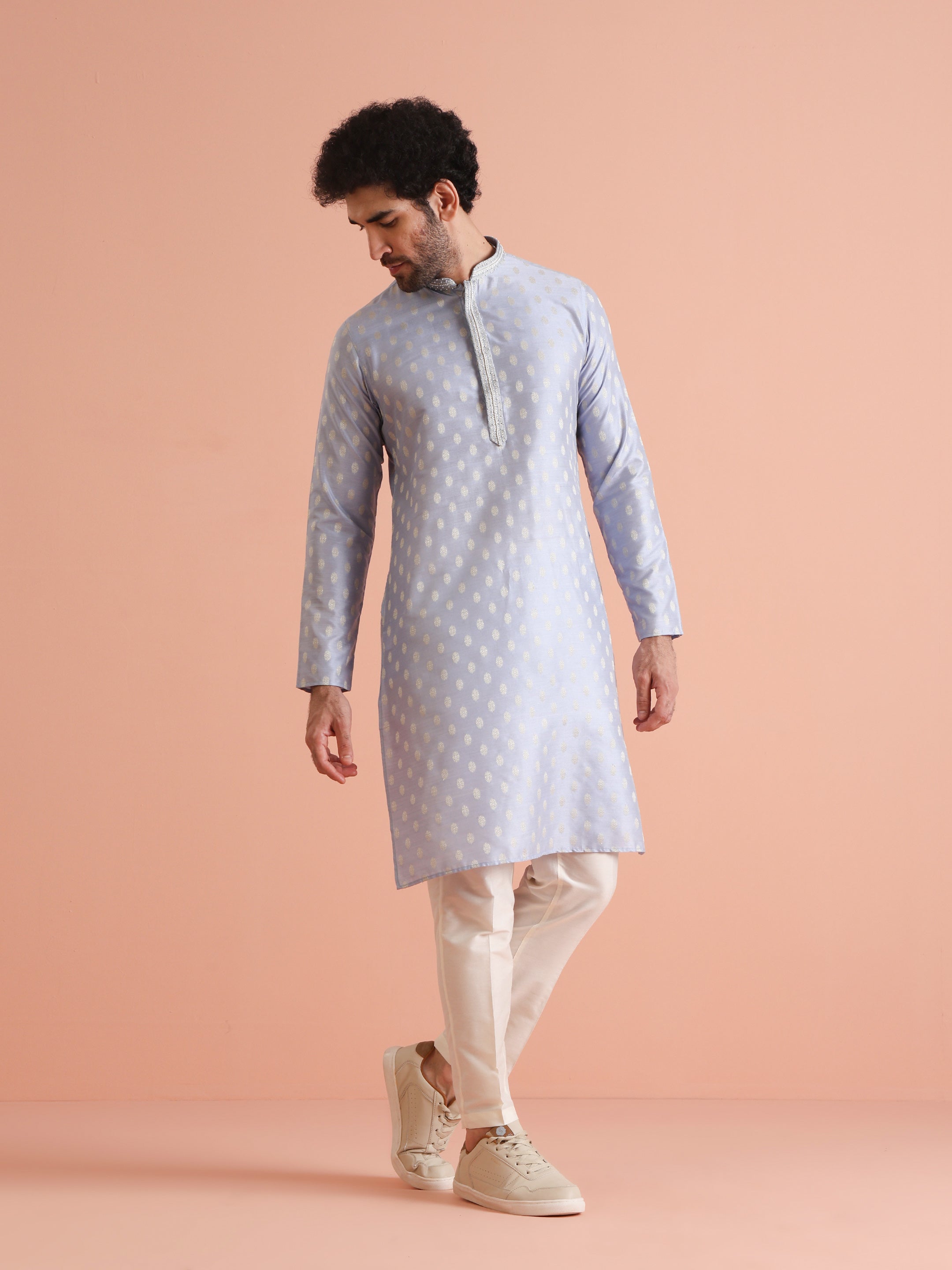 Experience classic elegance with this Men's Blue Color Silk Blend Kurta Trousers Set. The Ethnic Motifs Pattern adds a refined touch, while the breathable fabric ensures comfort throughout the day. Ideal for festive events or casual wear, this Kurta Trouser Set is a wardrobe essential.