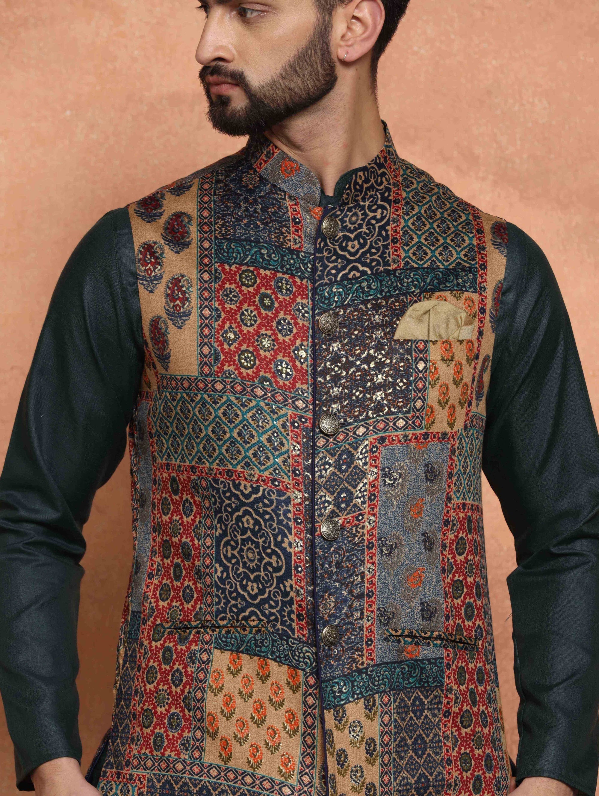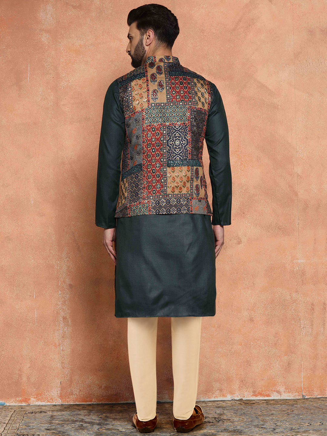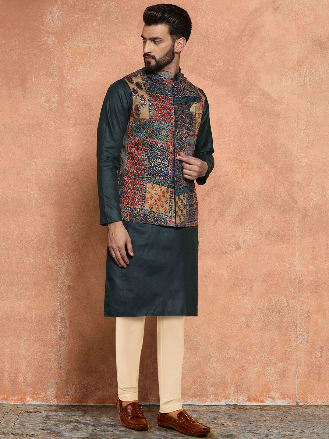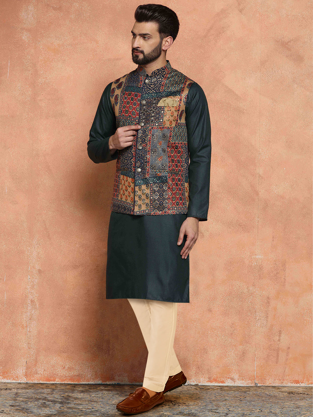 Elevate your style with this elegant Multi color Kurta Jacket Trouser Set. Made from a premium Silk Blend Fabric and Printed pattern, it offers unmatched comfort and sophistication. Perfect for any festive occasion.