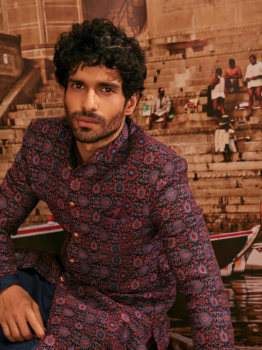 Men Multi Coloured Textured Kurta Indowestern Trouser Set