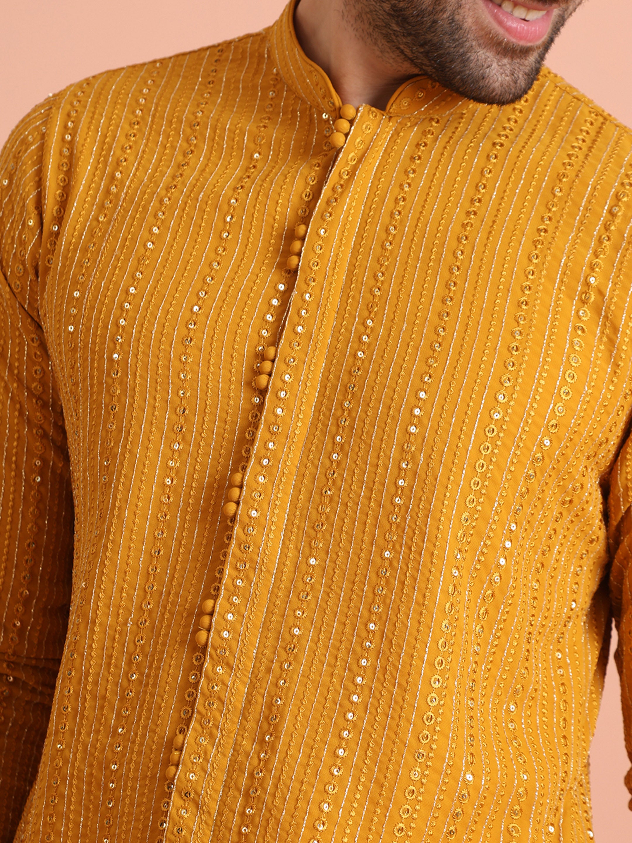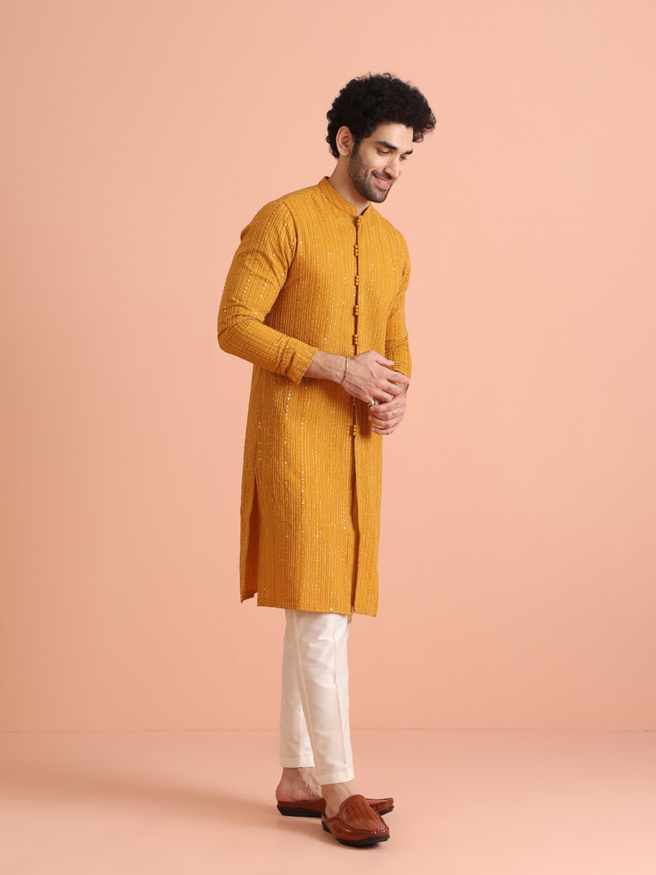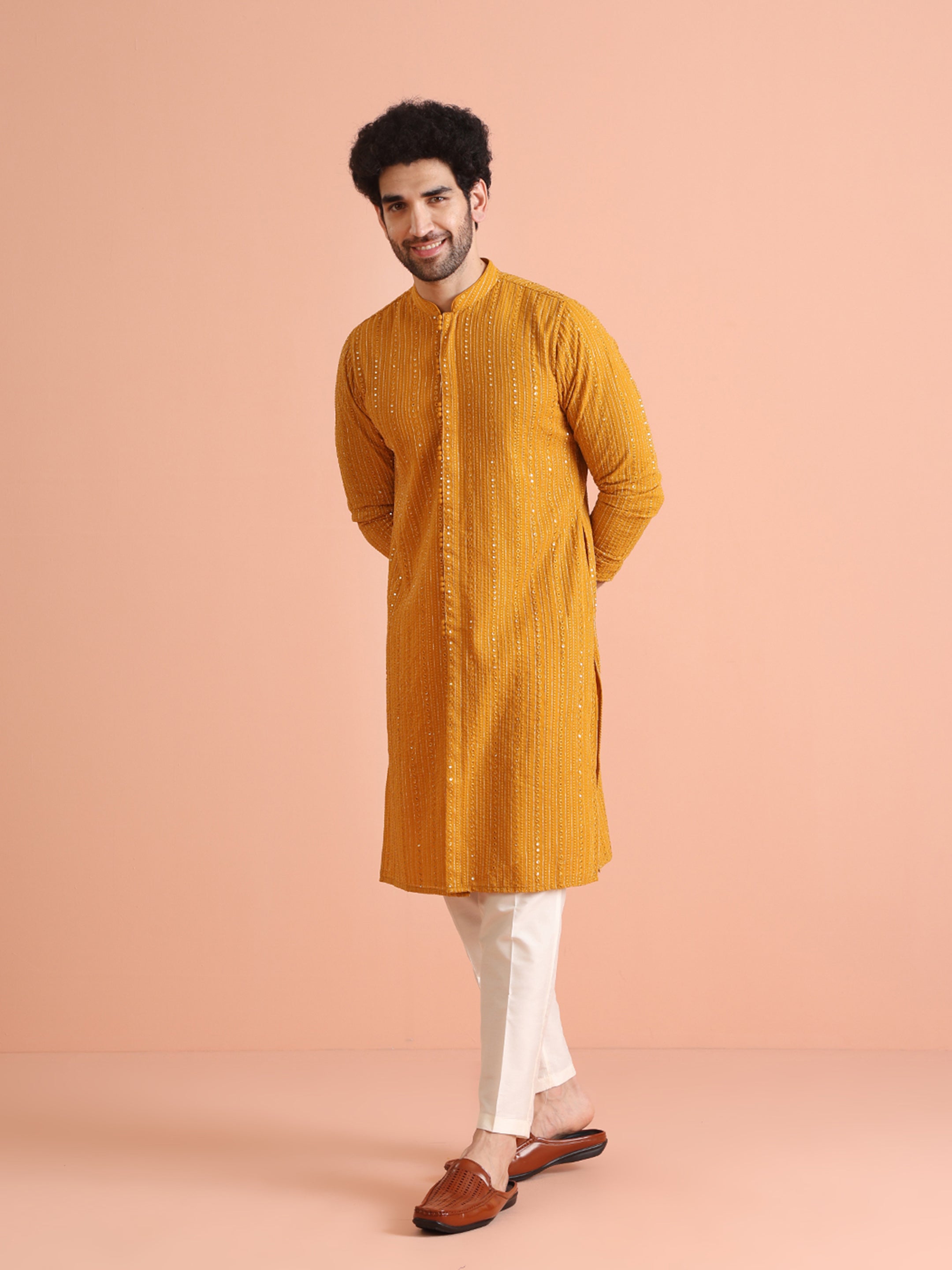 Experience classic elegance with this Men's Mustard Color Georgette Kurta Trouser Set. The Embroidered Pattern adds a refined touch, while the breathable fabric ensures comfort throughout the day. Ideal for festive events or casual wear, this Kurta Trouser Set is a wardrobe essential.
