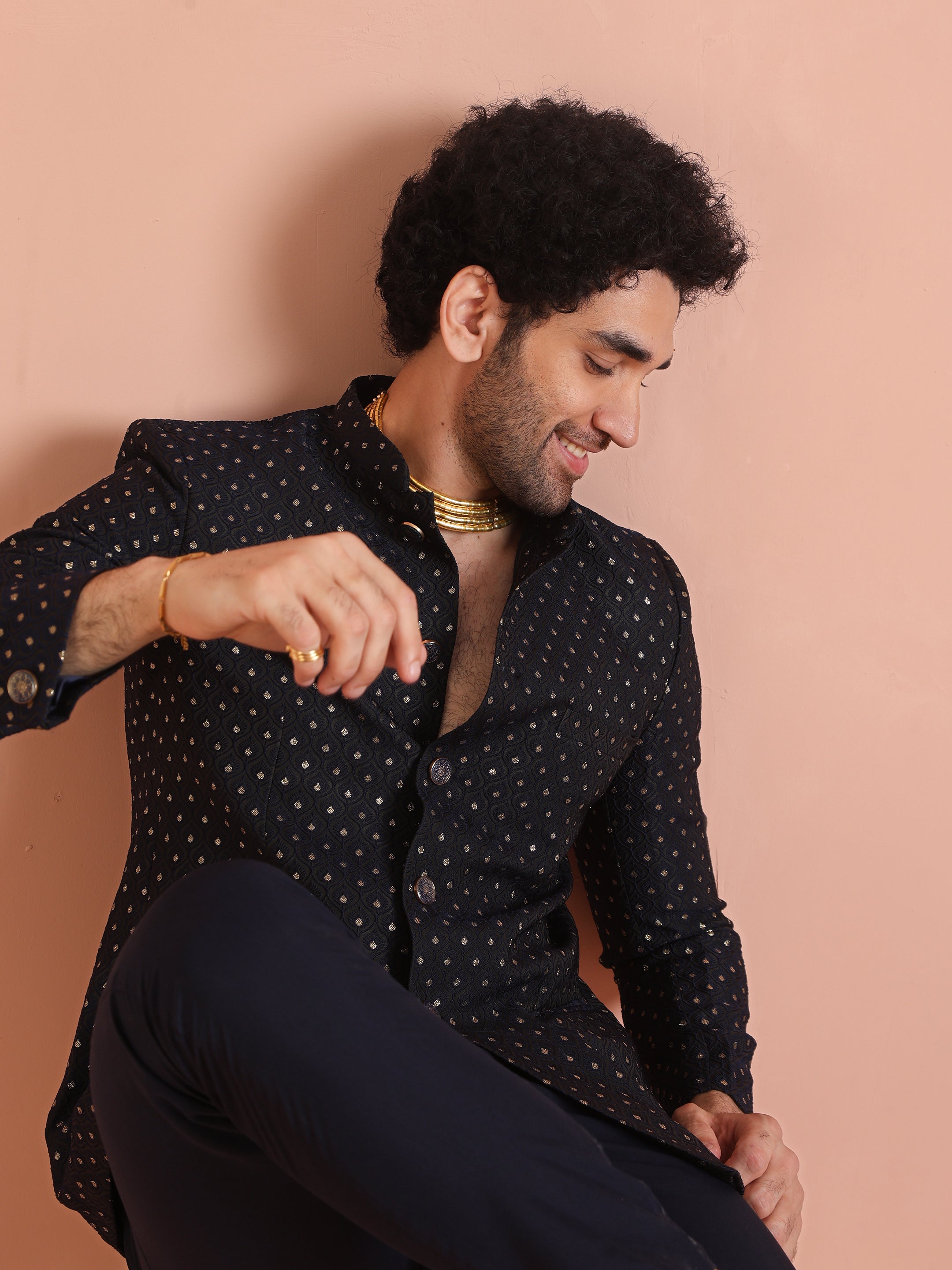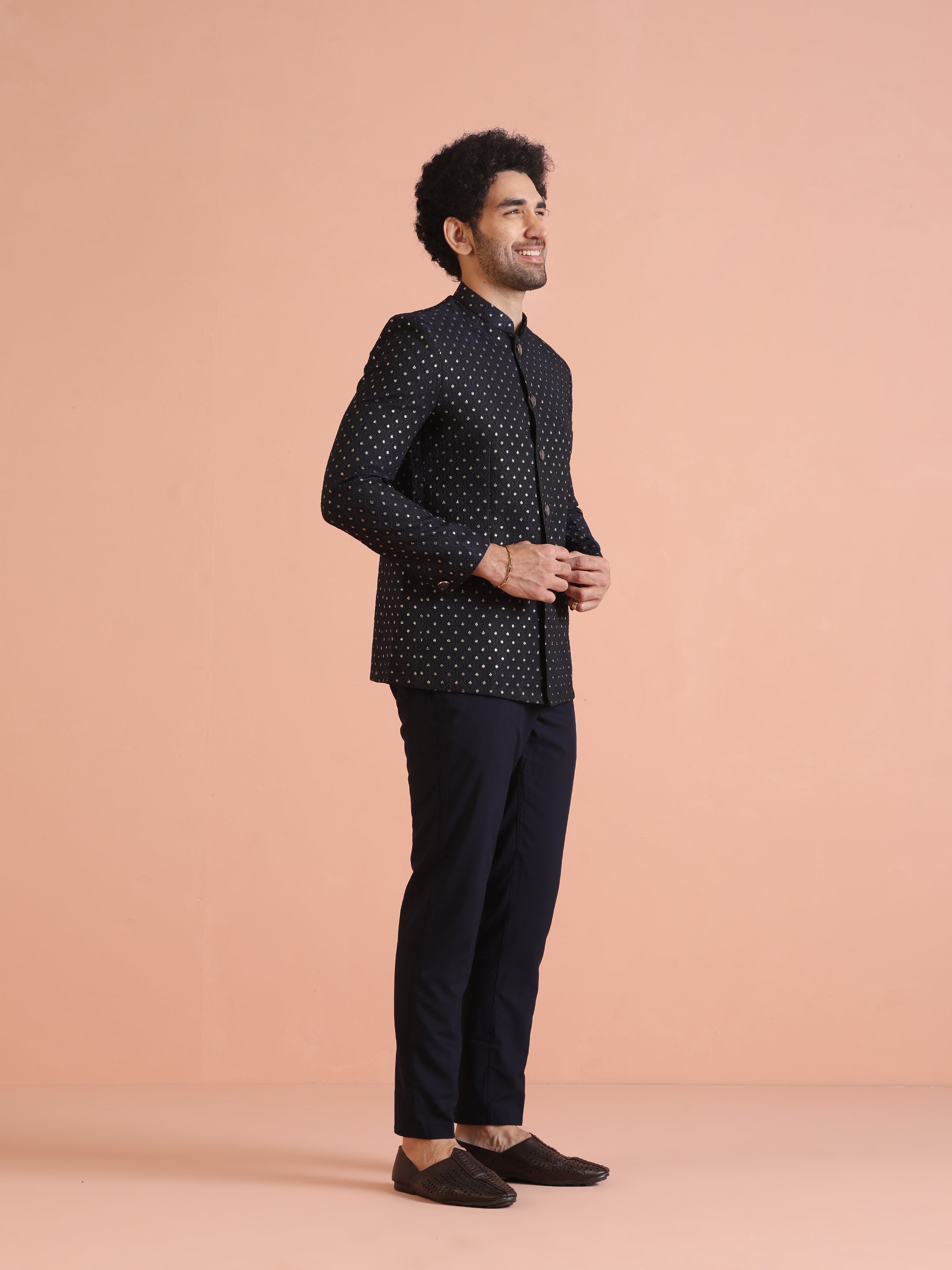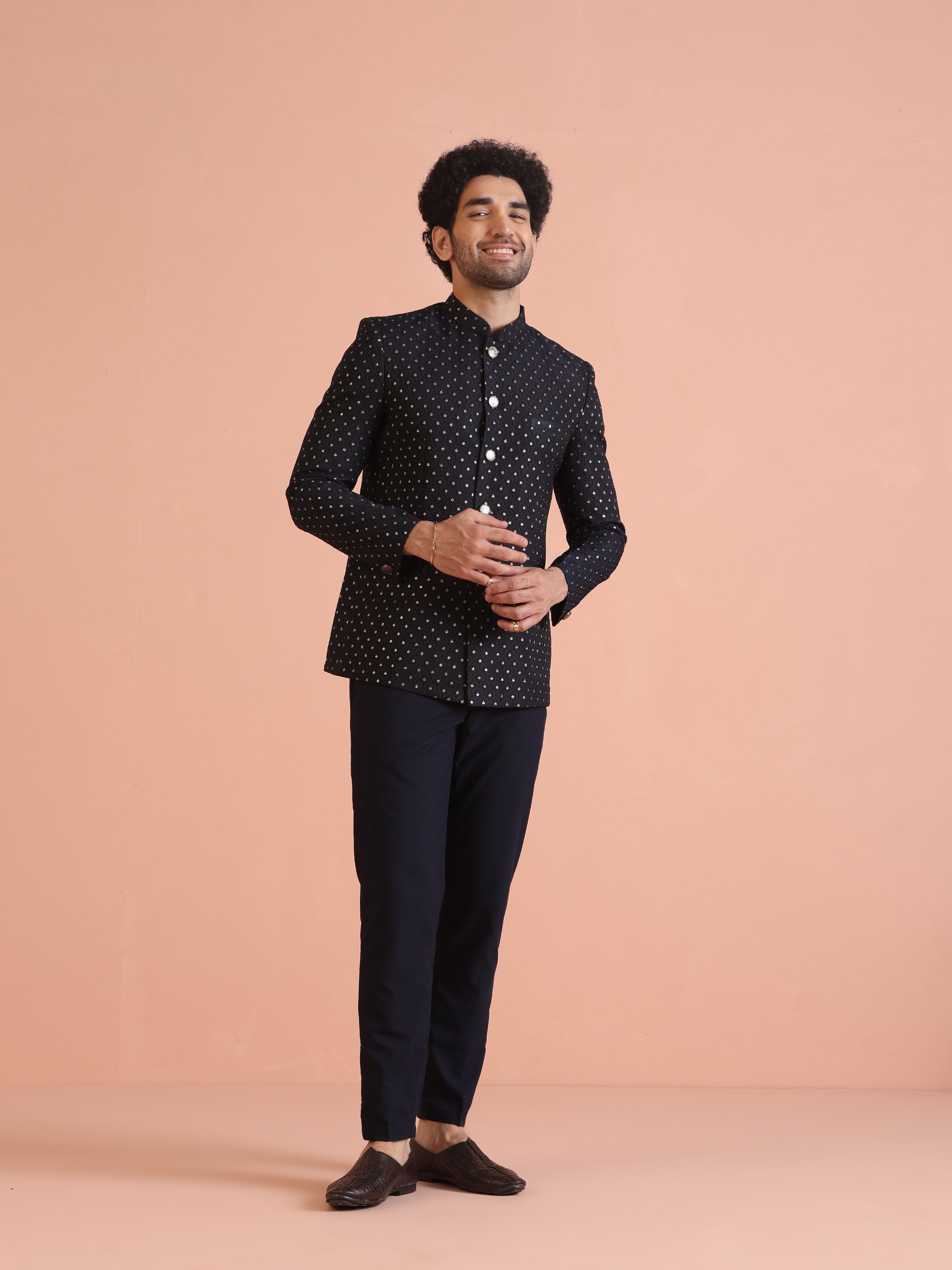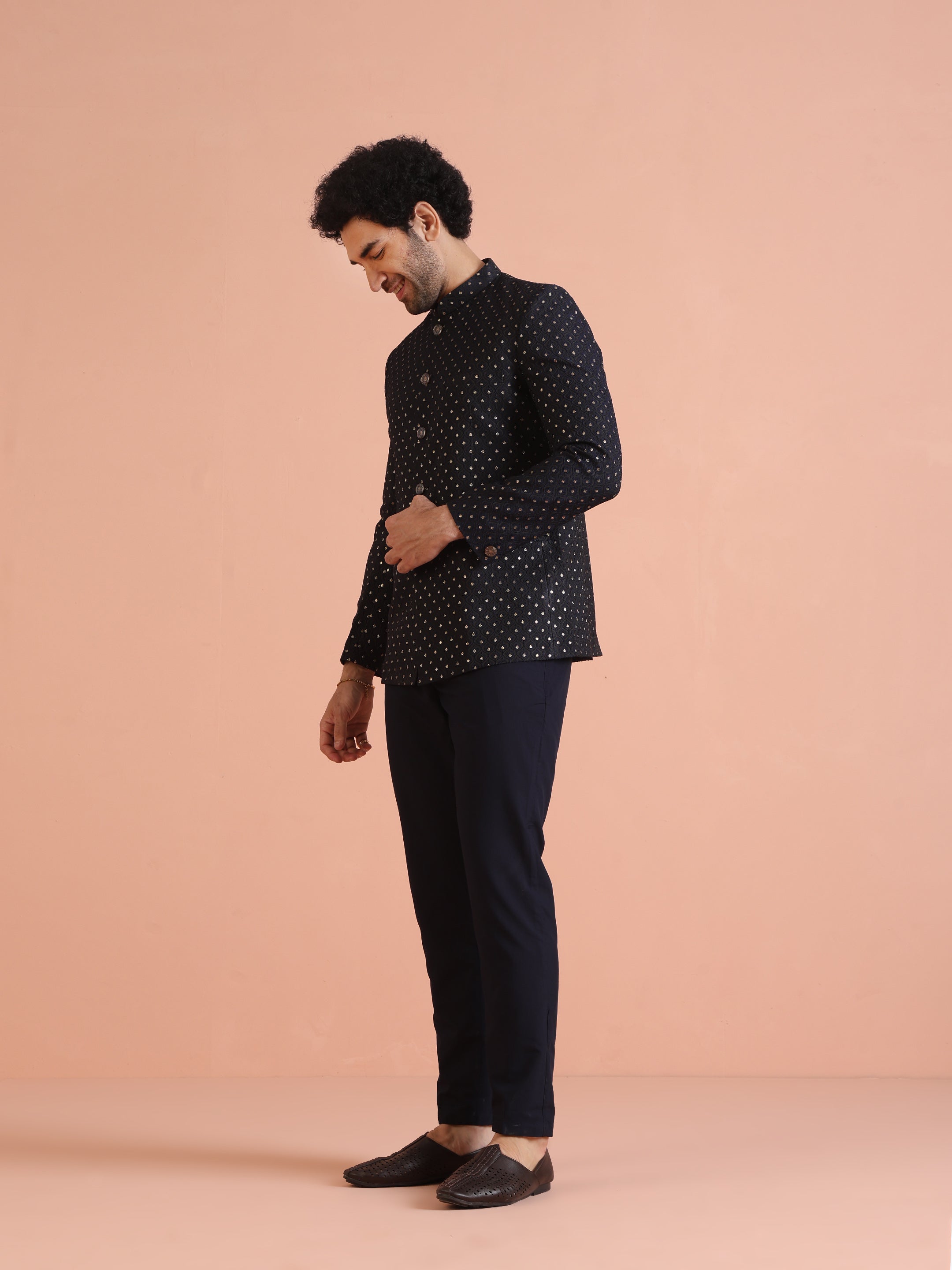 Enhance your festive wardrobe with this navy blue silk blend jacquard textured bandhgala and trouser set. Its rich texture and regular fit make it an ideal choice for elegant occasions.