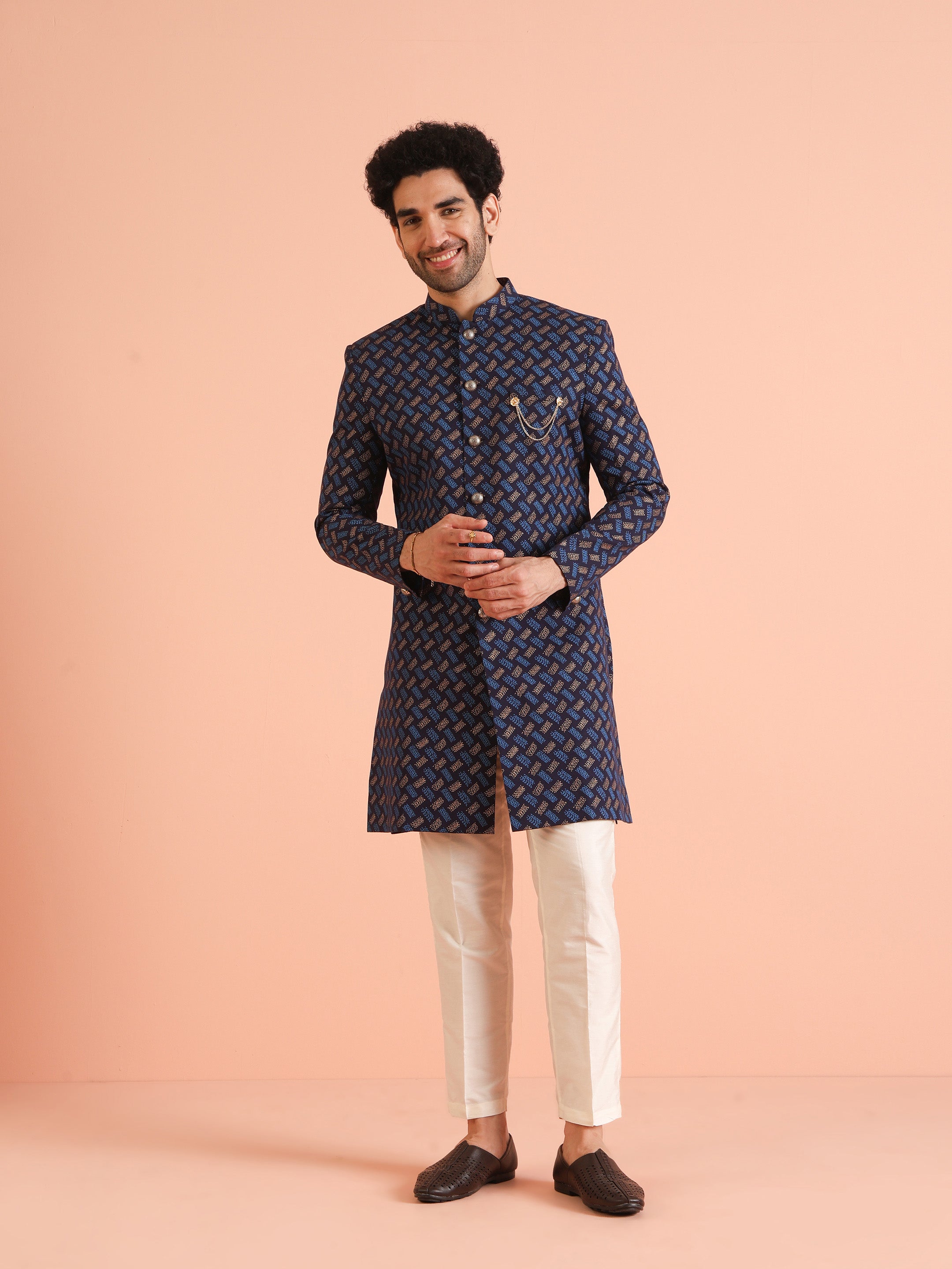 Navy Blue Jacquard Sherwani with Beige Trouser