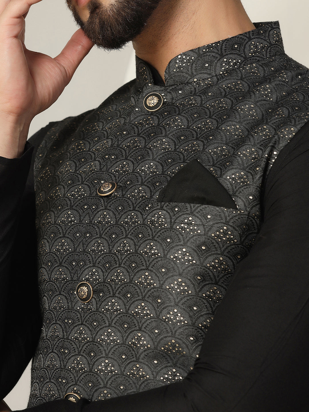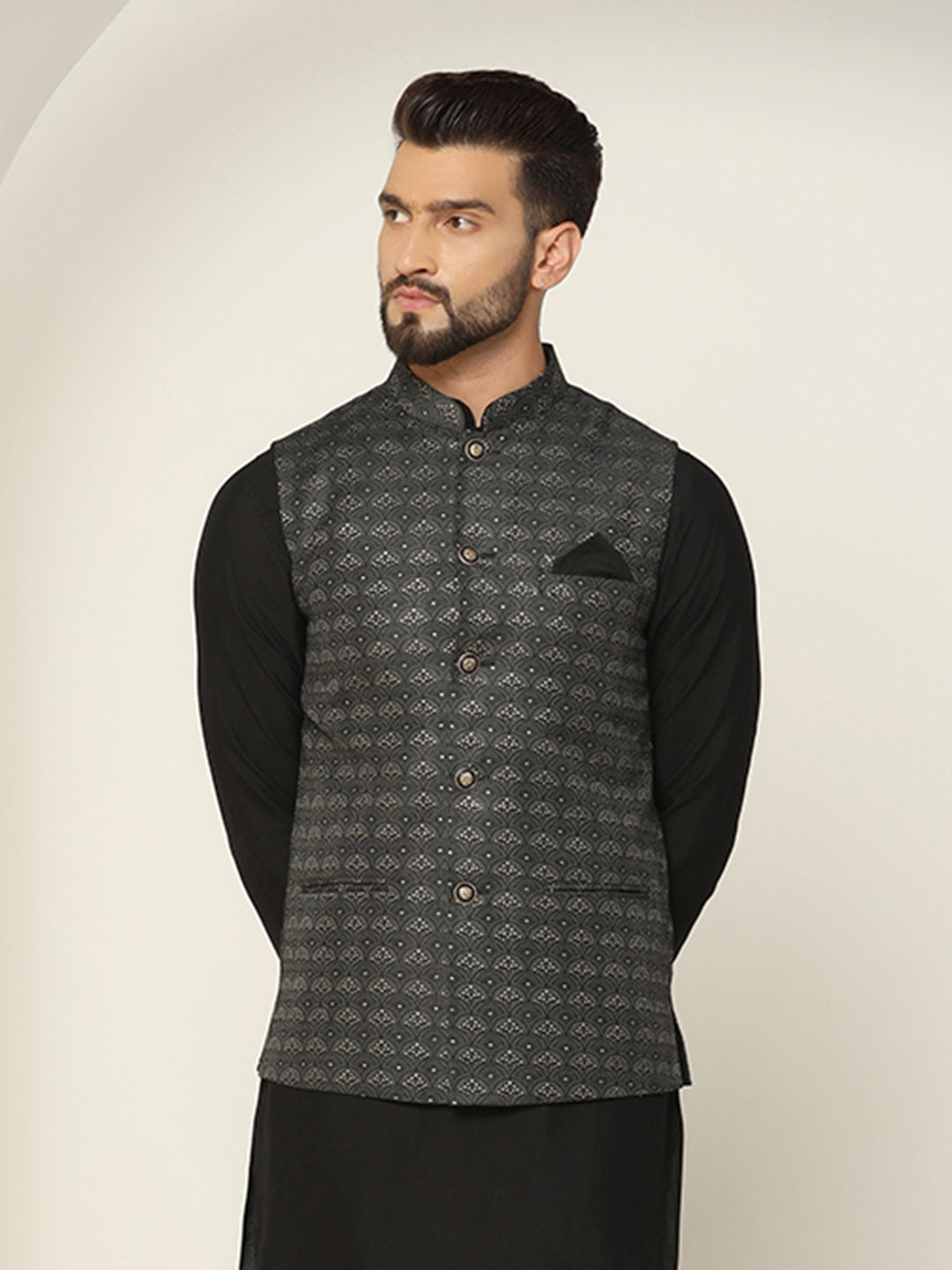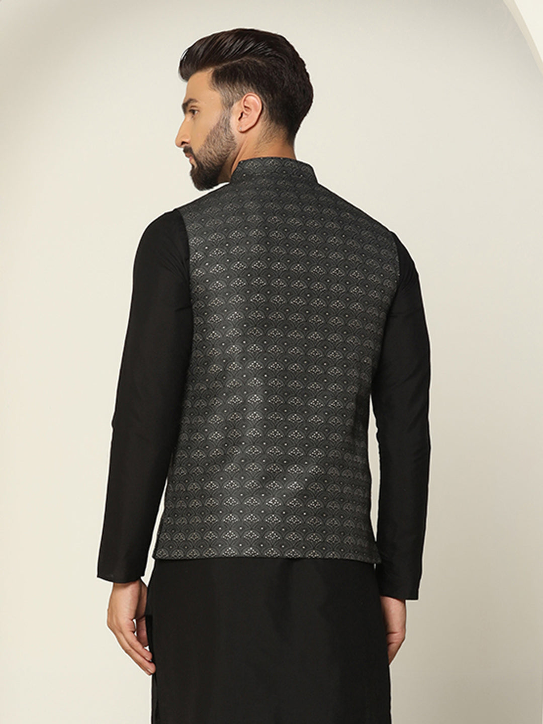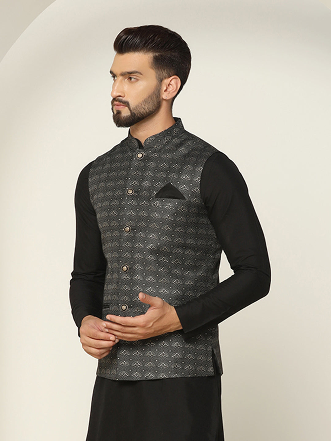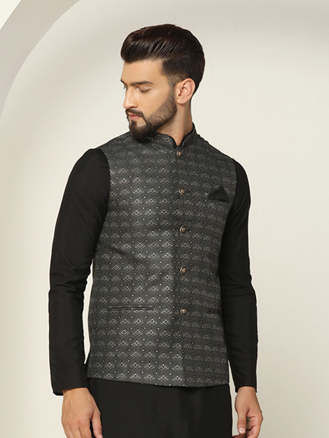 This black silk blend jacquard jacket features a woven jacquard pattern and regular fit. Ideal for pairing with ethnic outfits, it adds sophistication to your wardrobe.