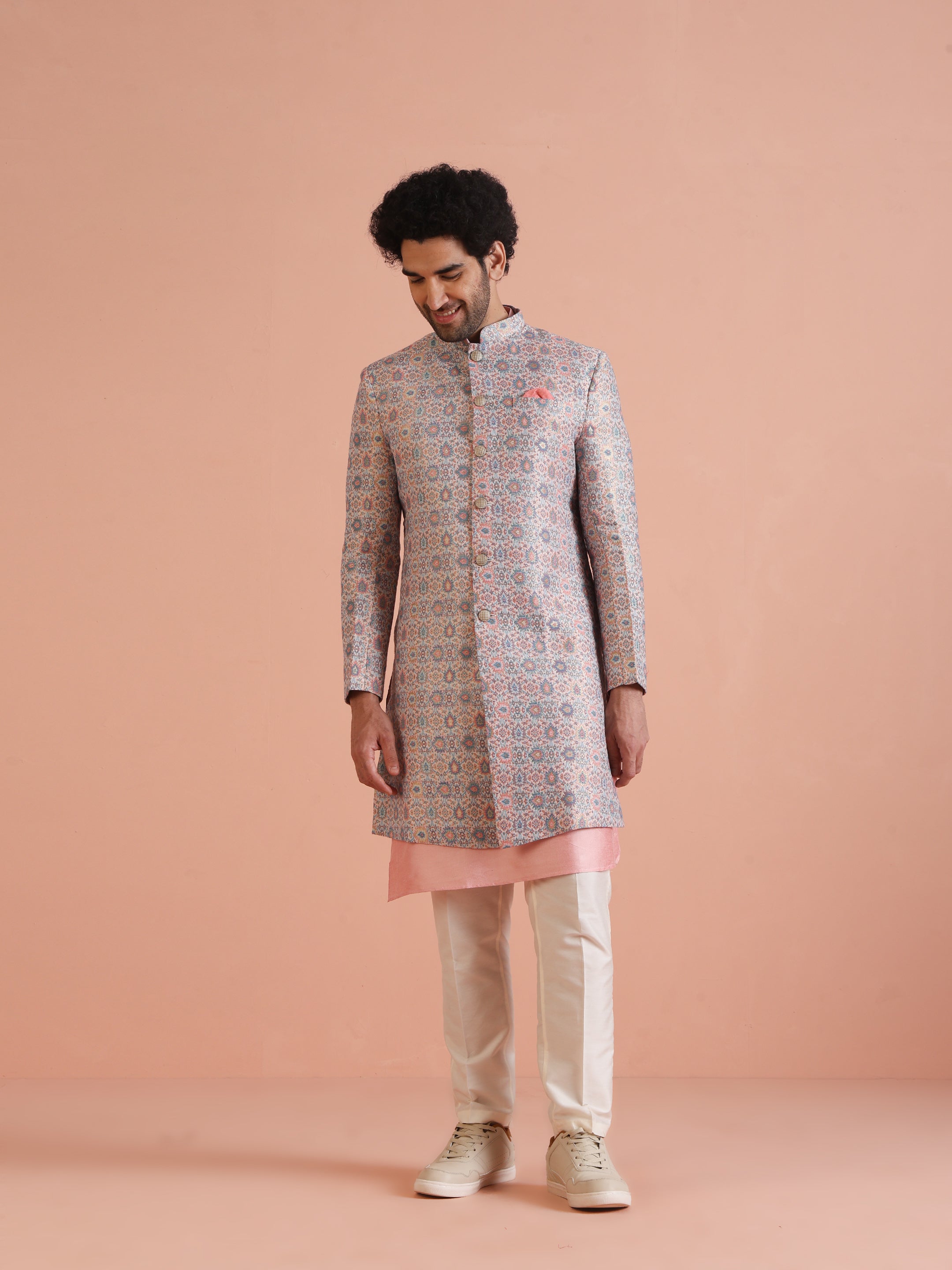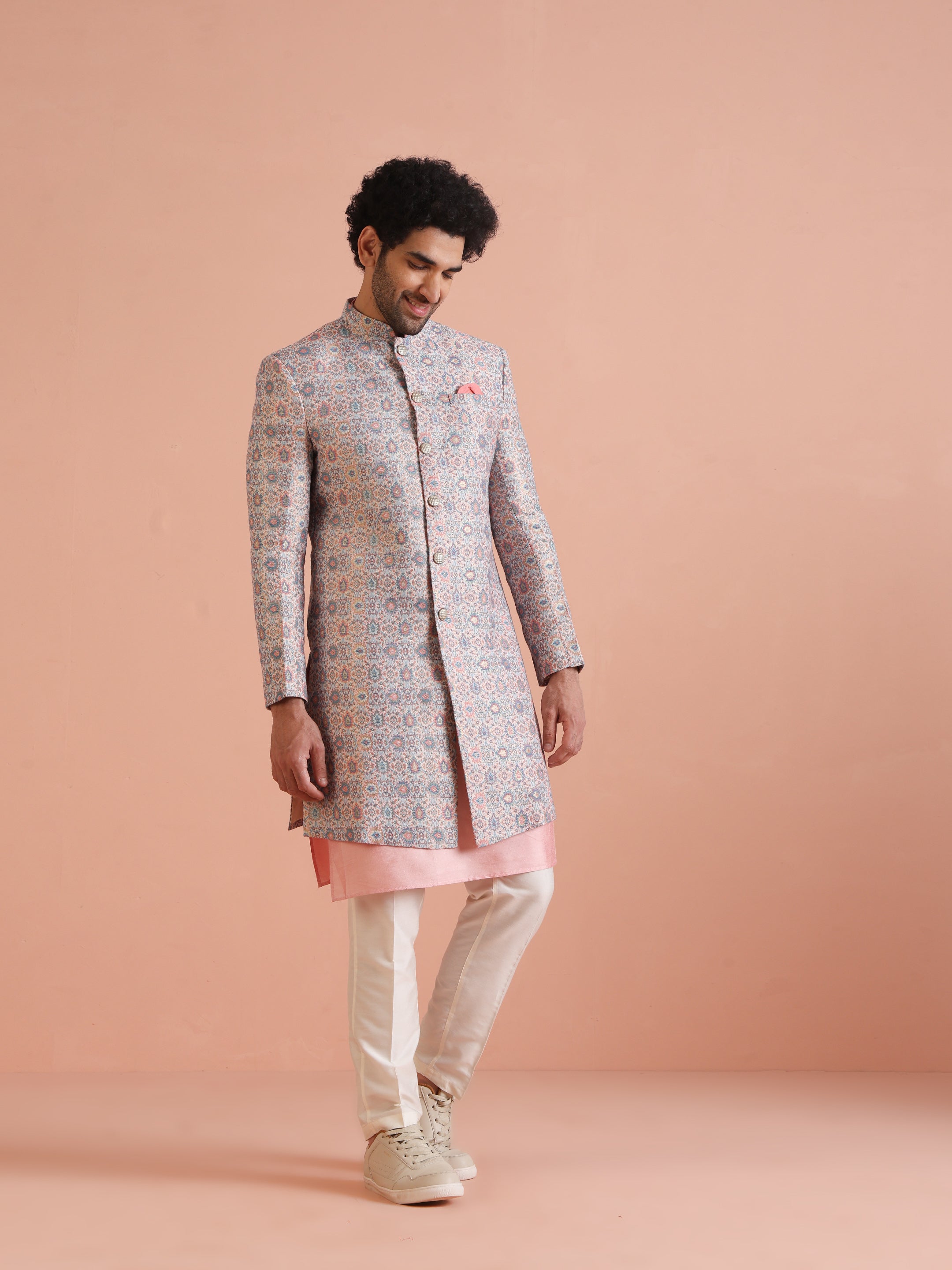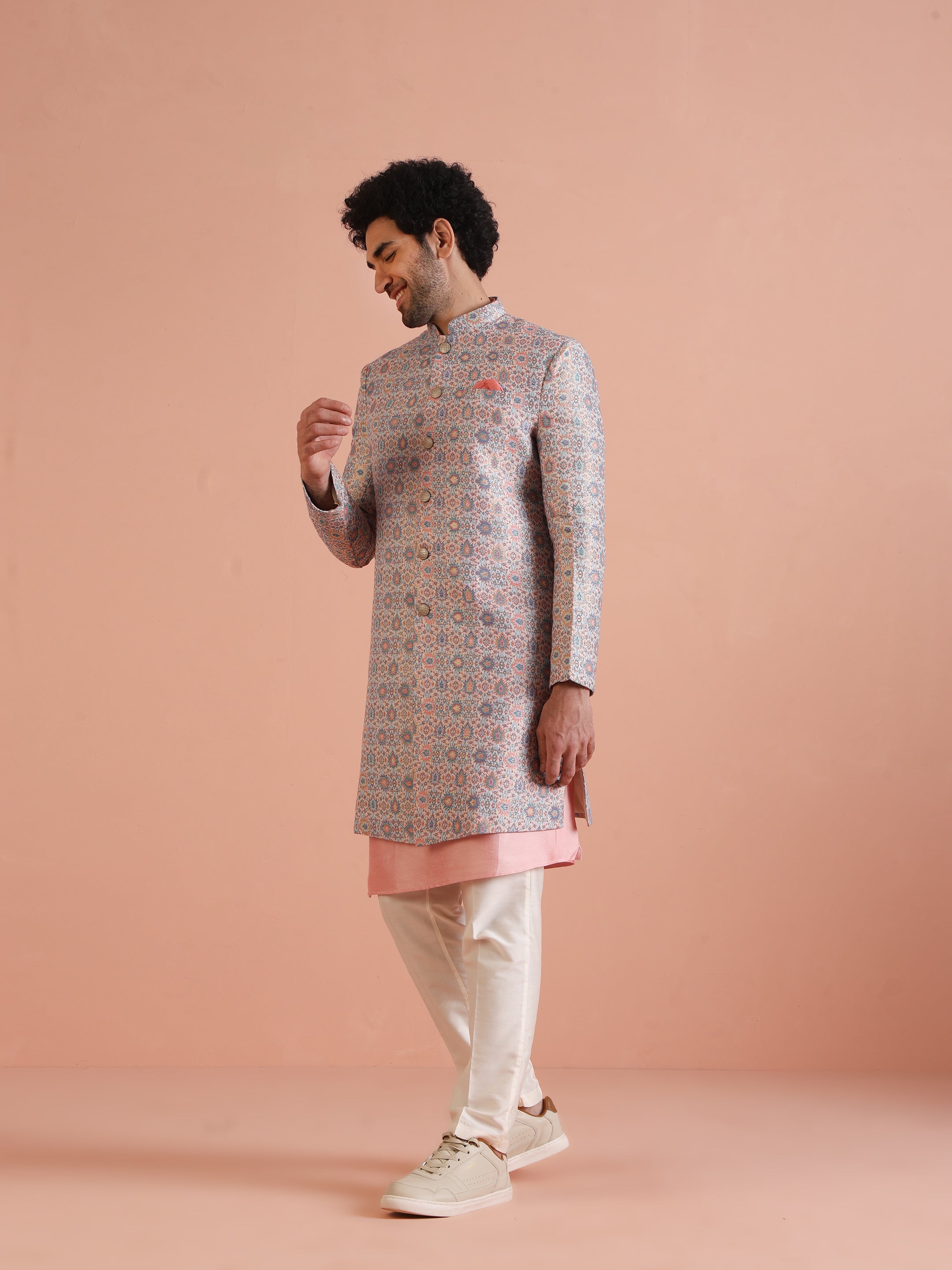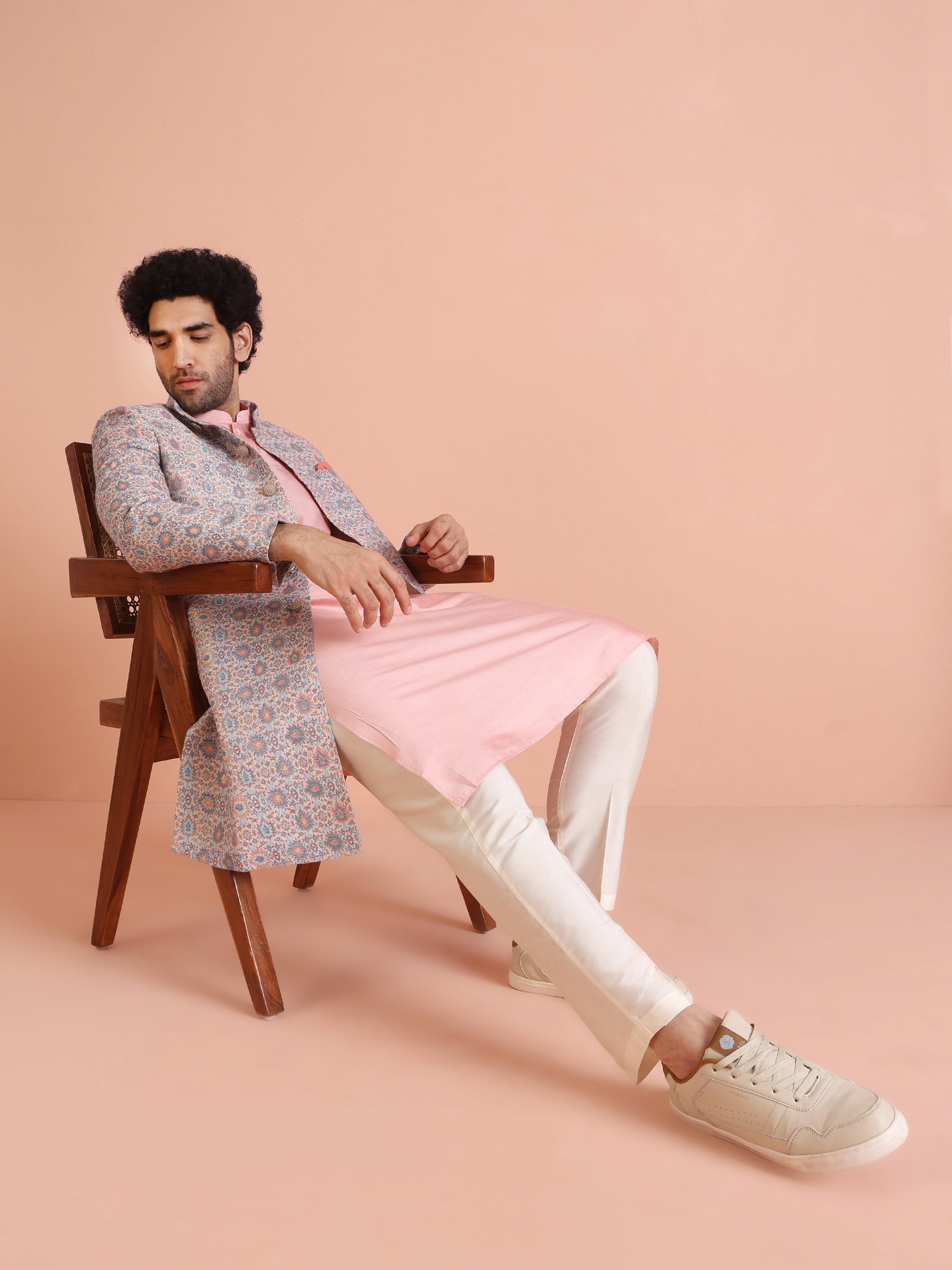 This Indowestern set is an elegant mandarin collar style that is perfect for occasional wear. With a full sleeve design, Grey colour and Cotton fabric, it will make you look stylish. Featuring a Kurta, Indowestern & Bottomwear, it is perfect for formal occasions.