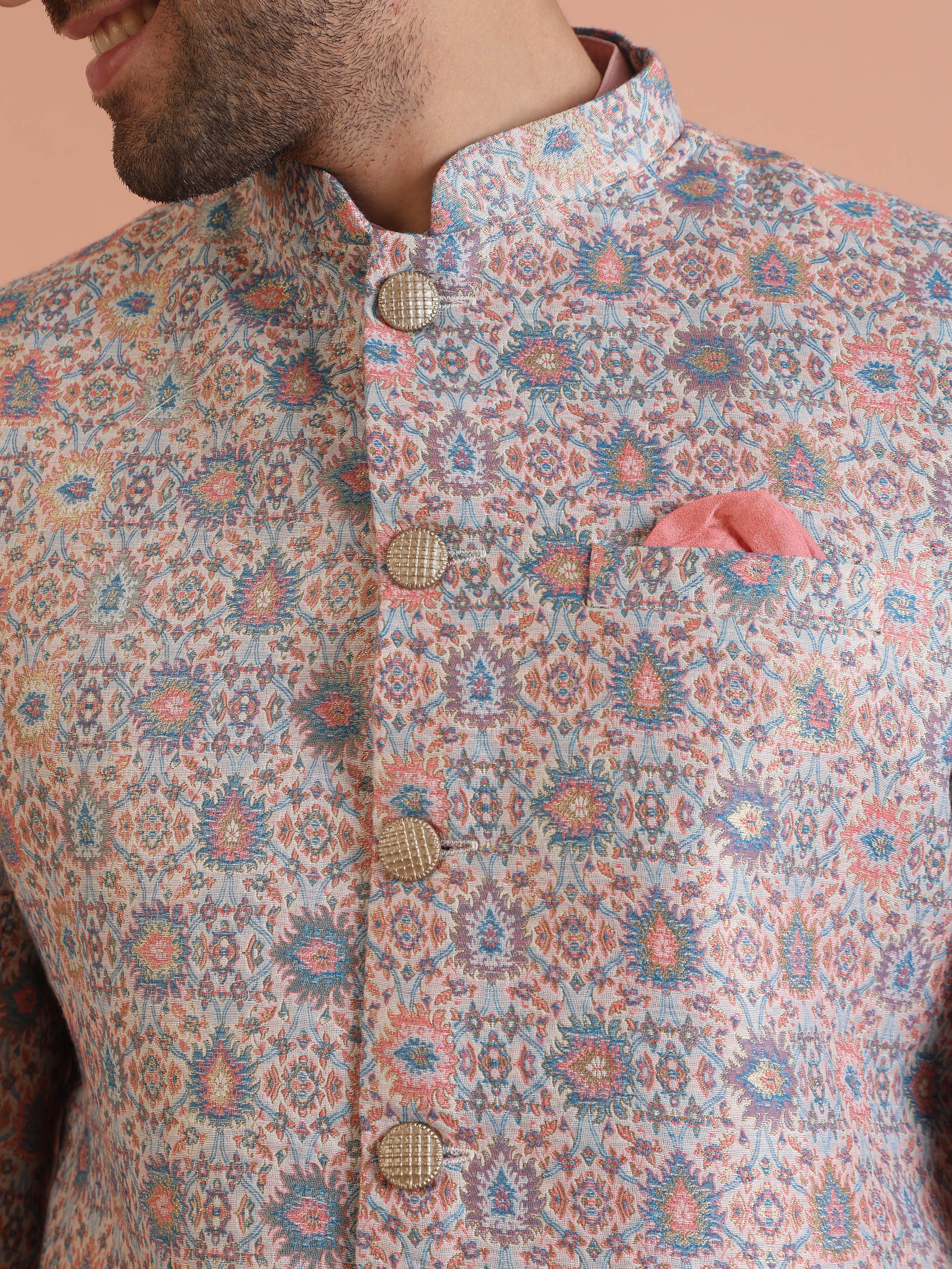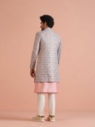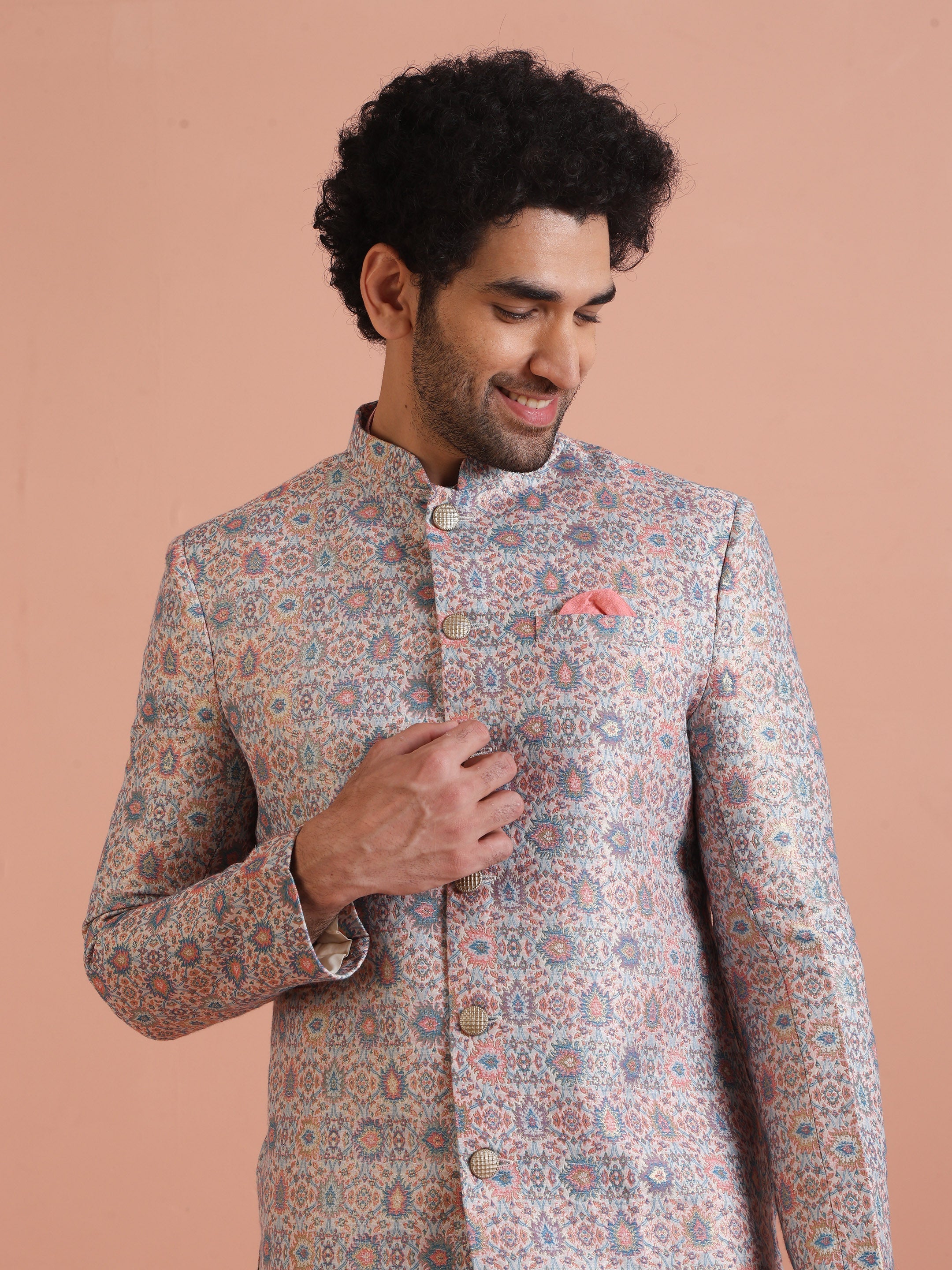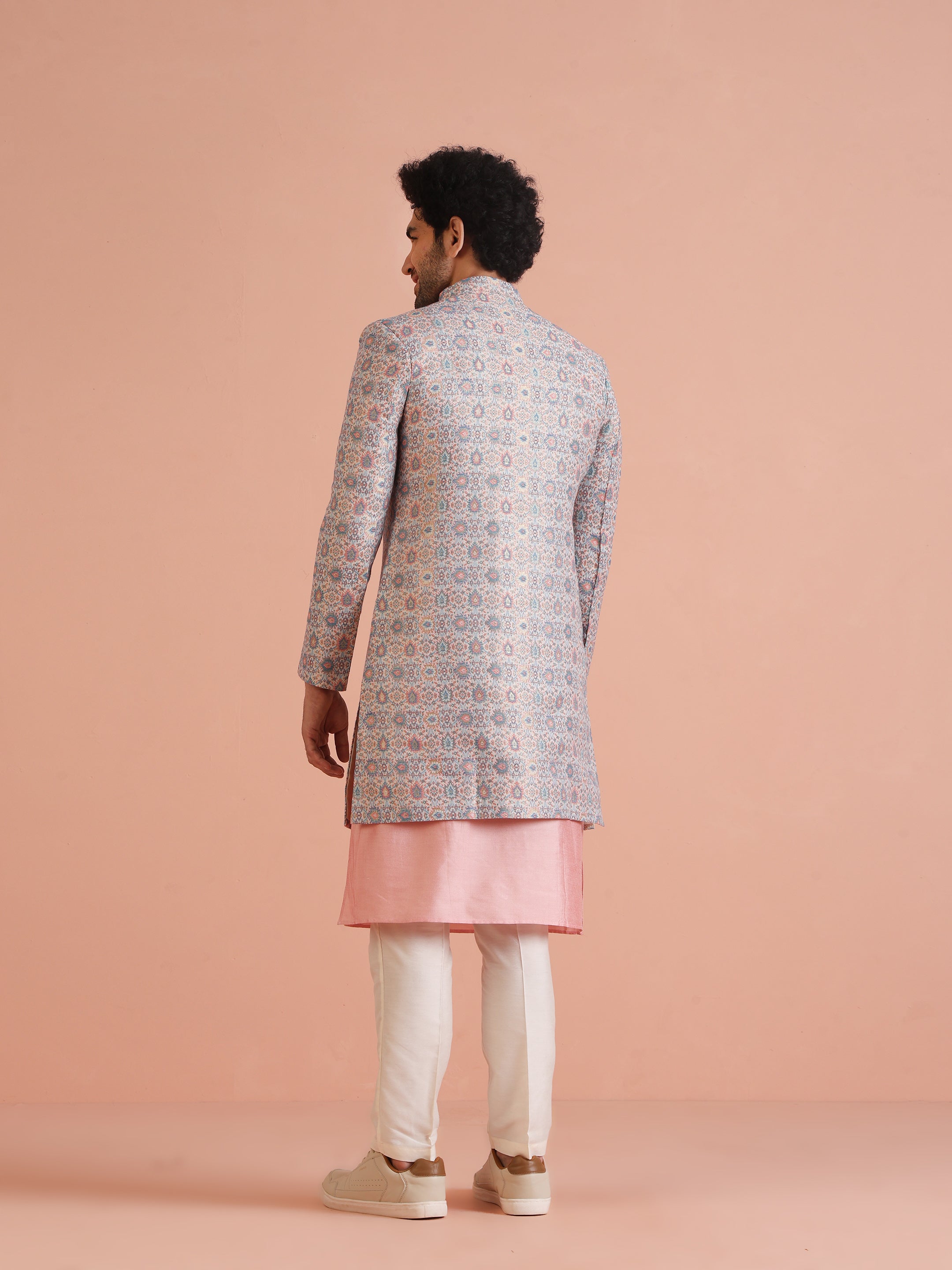 This Indowestern set is an elegant mandarin collar style that is perfect for occasional wear. With a full sleeve design, Grey colour and Cotton fabric, it will make you look stylish. Featuring a Kurta, Indowestern & Bottomwear, it is perfect for formal occasions.