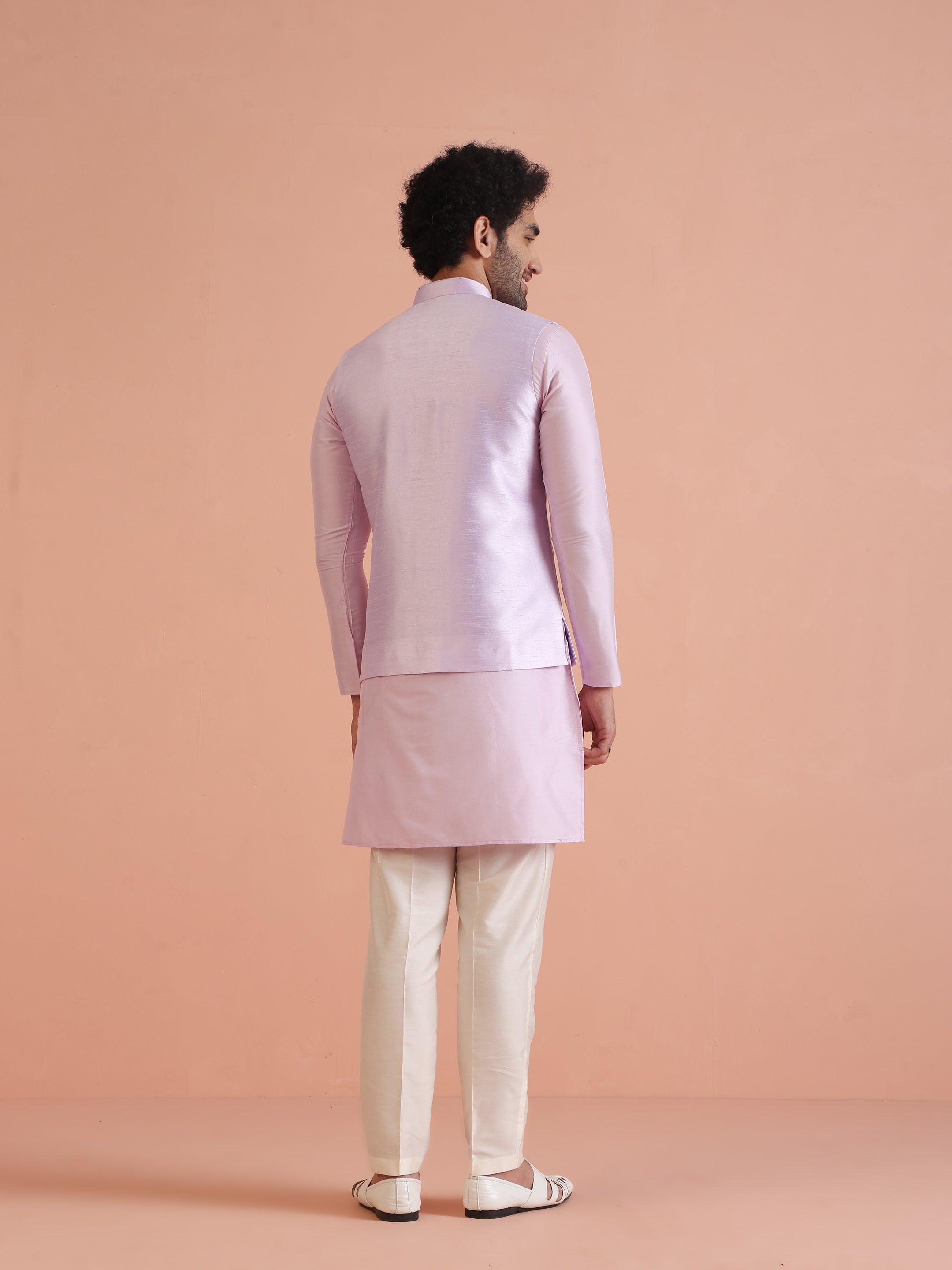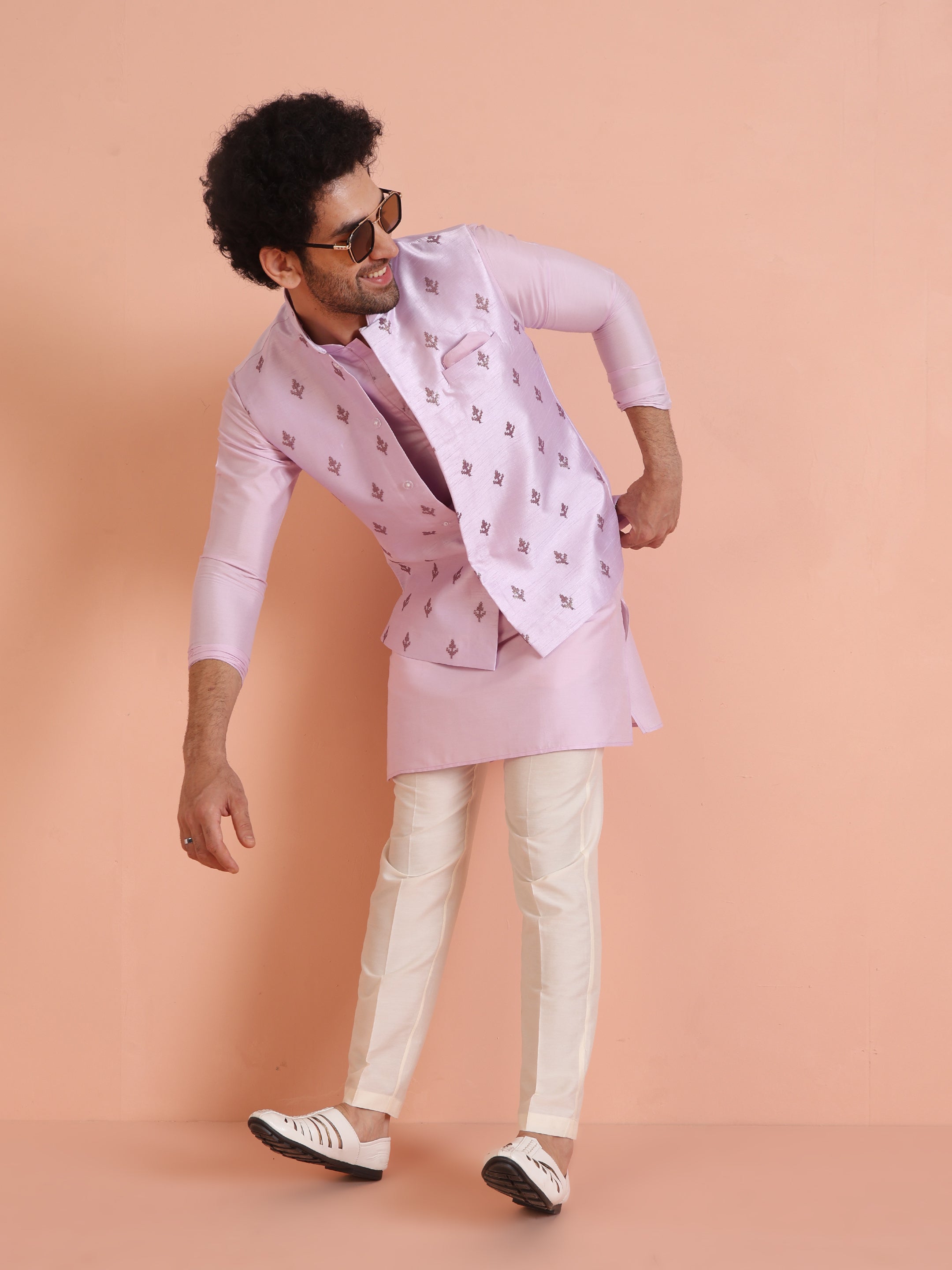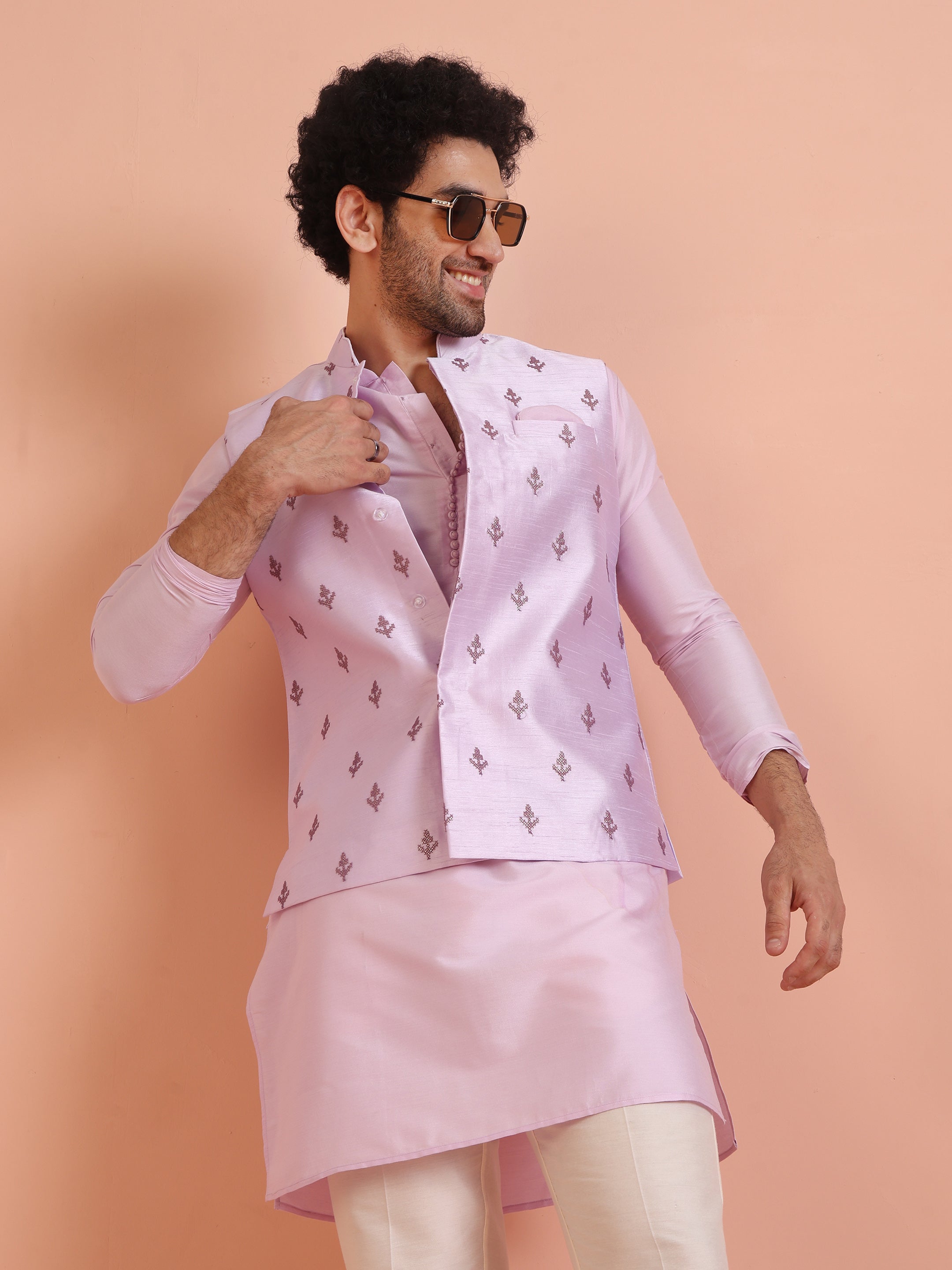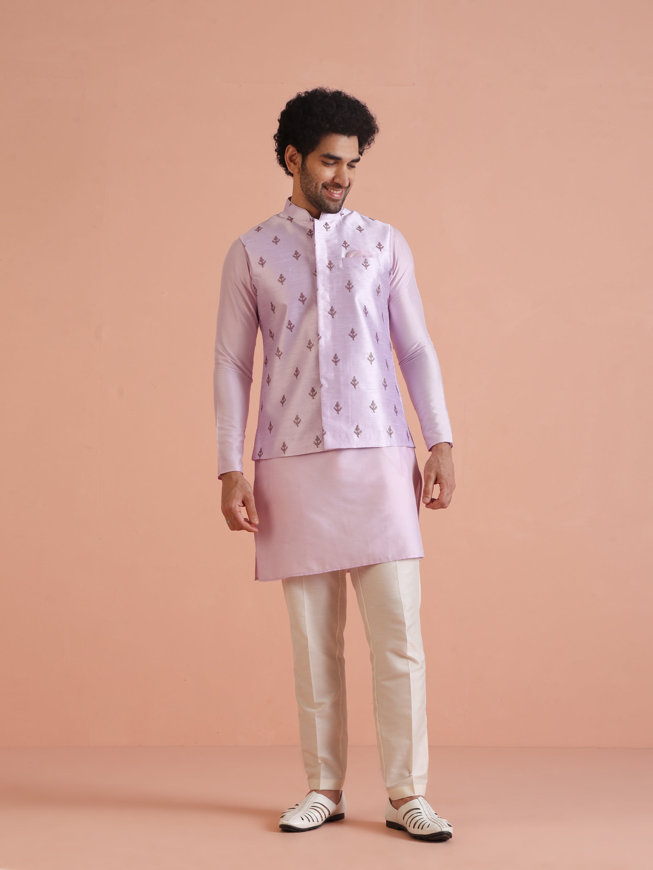 This lilac silk blend jacket features intricate embroidery and a regular fit. Ideal for elevating your ethnic wear, it adds a stylish and elegant touch to any outfit.
