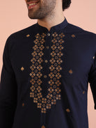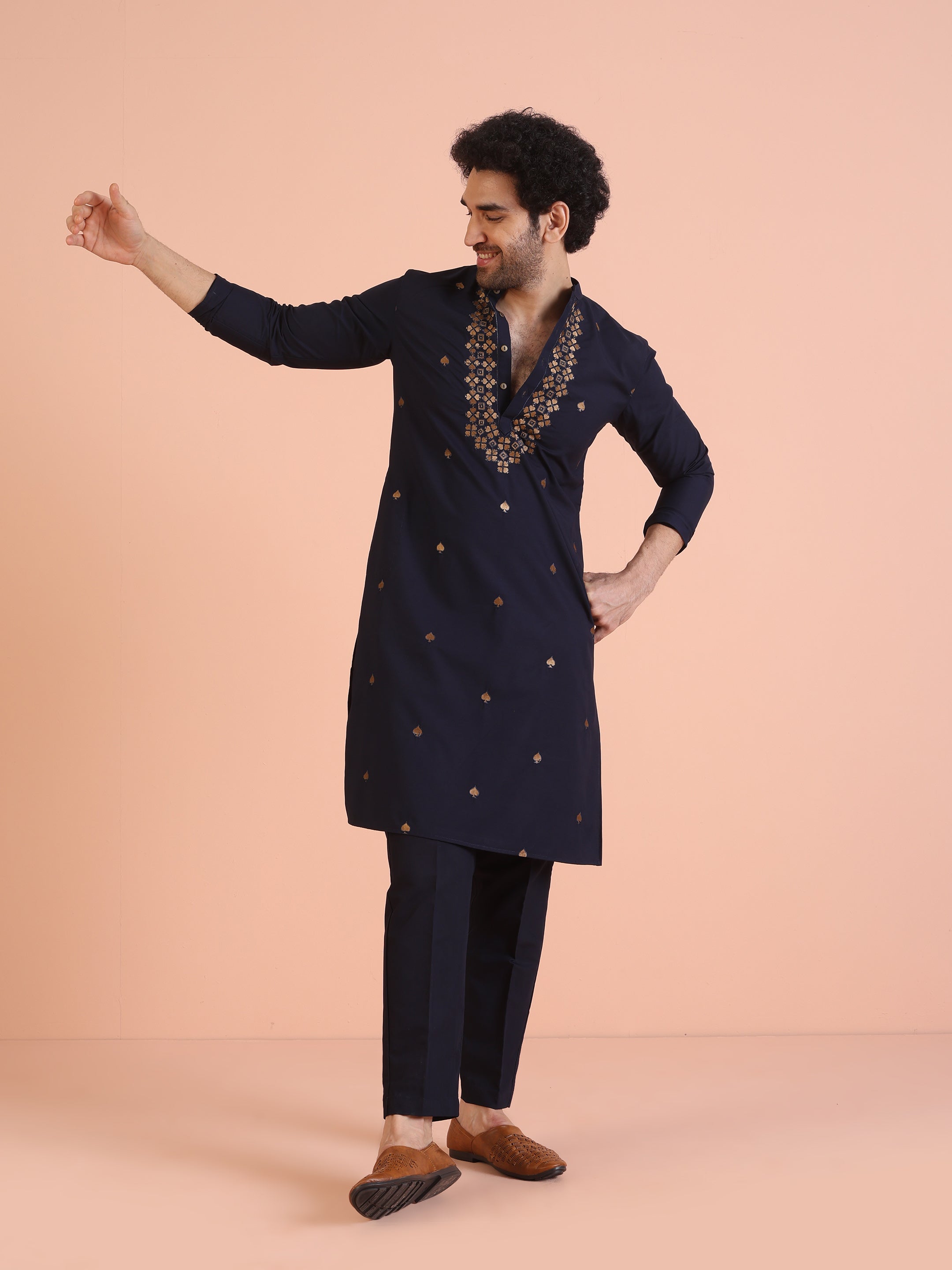 Elevate your look with this navy blue cotton blend kurta featuring embroidery. The regular fit ensures comfort, making it ideal for traditional events or casual traditional gatherings.