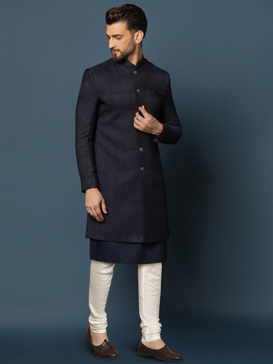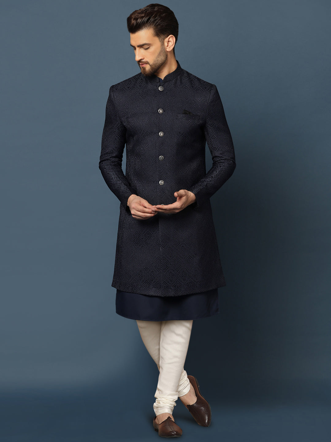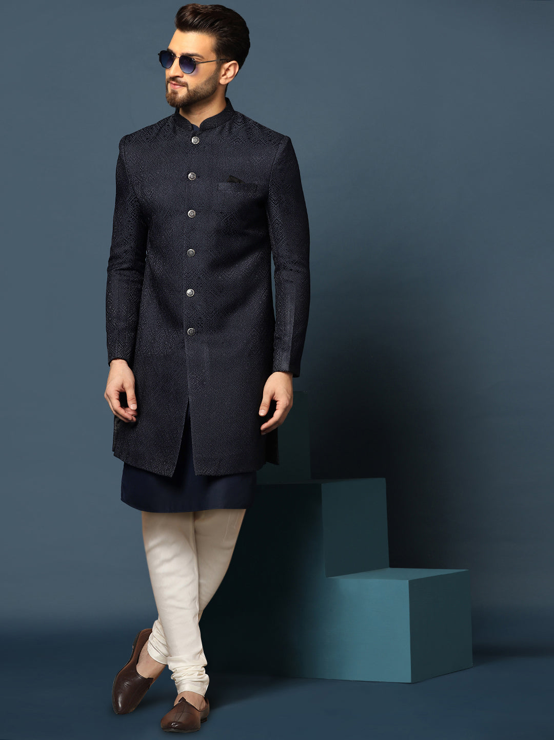 Step up your ethnic style with this navy blue silk blend jacquard kurta, Indowestern, and churidar set. The textured design and regular fit make it perfect for festive events.