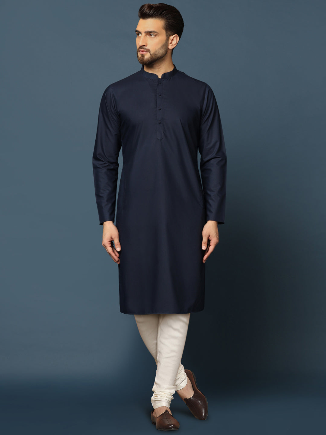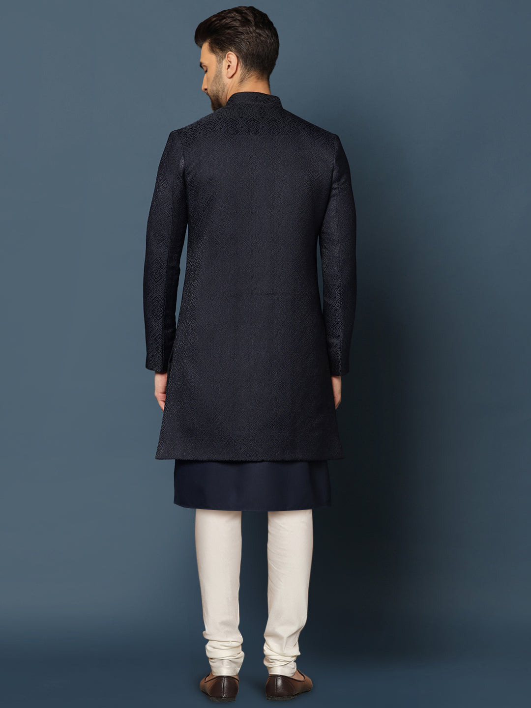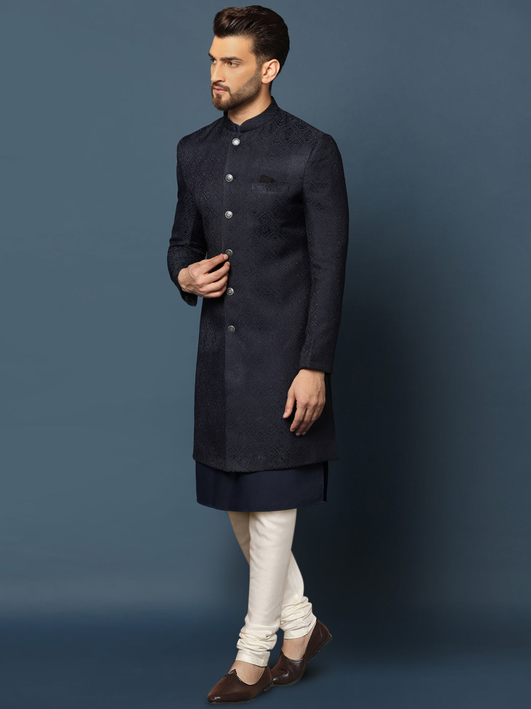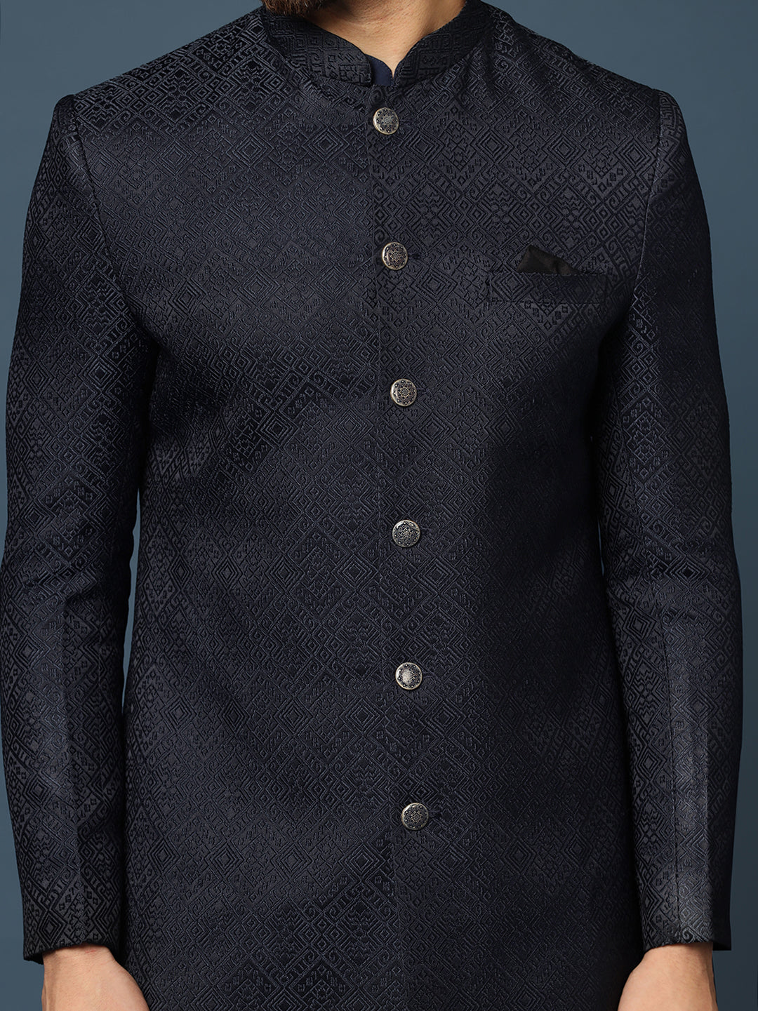 Step up your ethnic style with this navy blue silk blend jacquard kurta, Indowestern, and churidar set. The textured design and regular fit make it perfect for festive events.