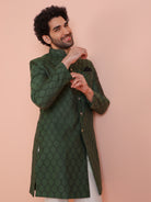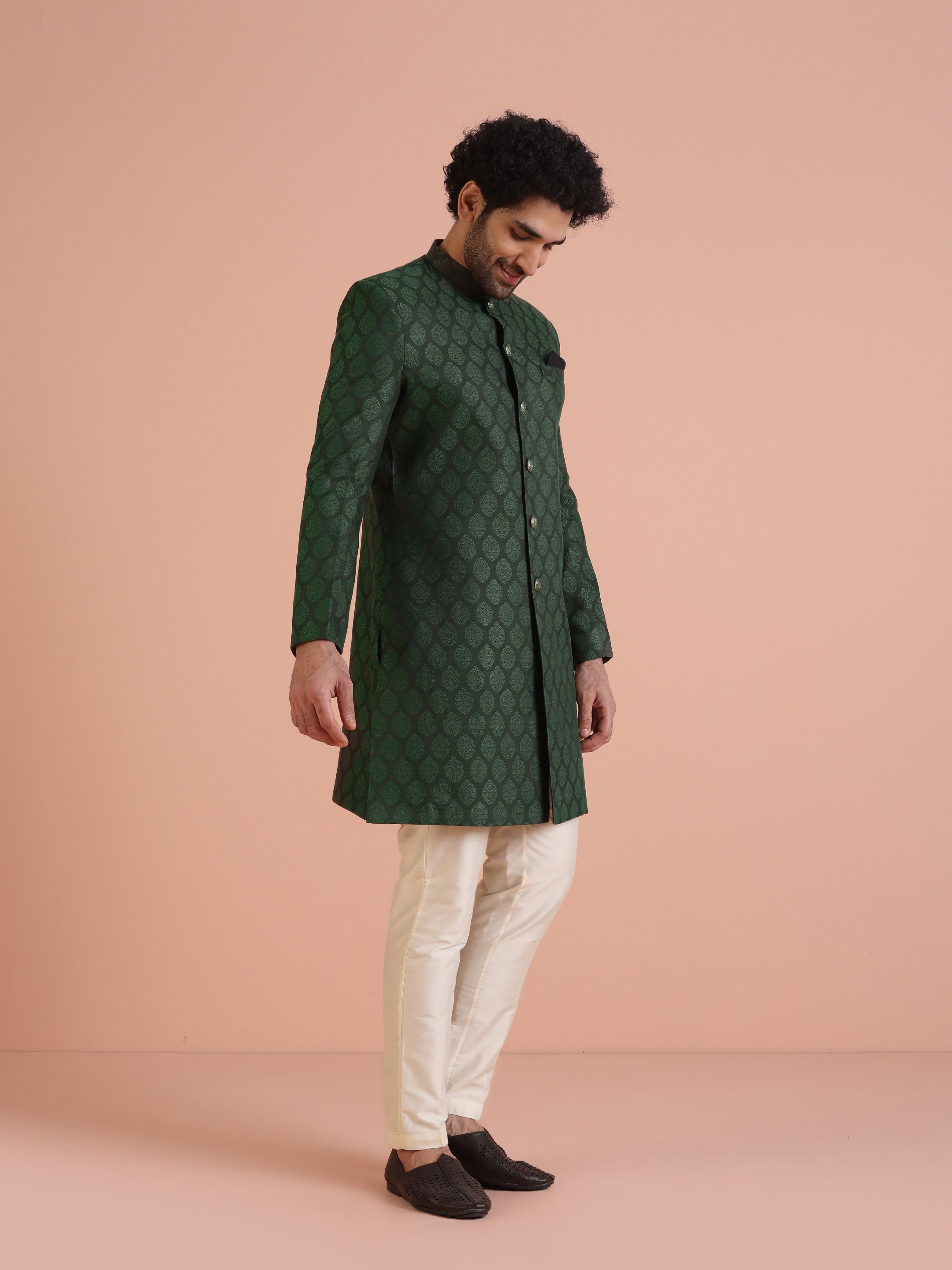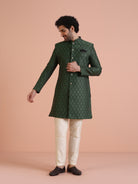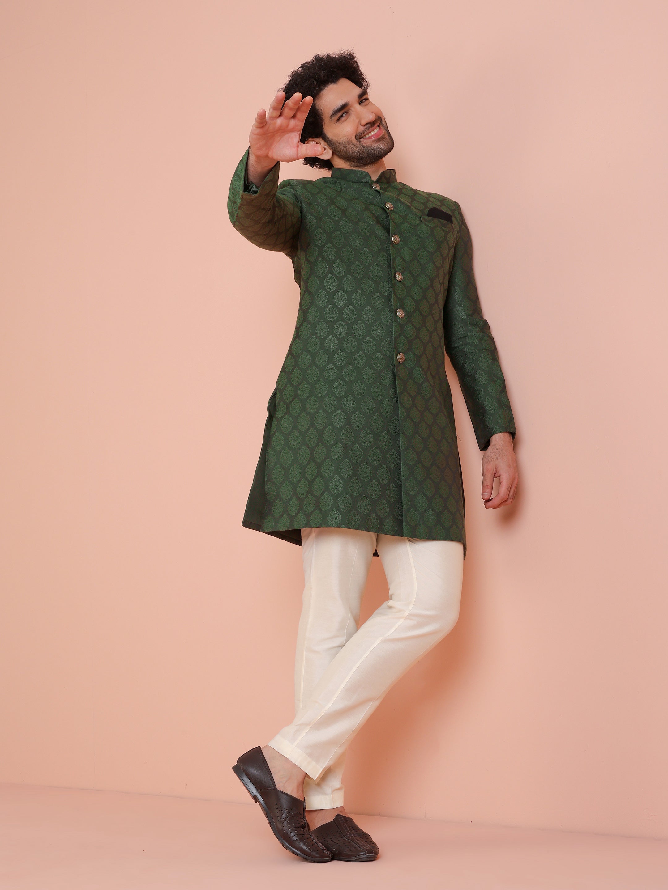 Step out in style with this Green Silk Blend Jacquard Indowestern Trouser Set, designed for those who love a blend of luxury and comfort. With a textured finish and a regular fit, it offers the perfect balance of elegance and ease. Ideal for weddings, festivals, or any special occasion, this ensemble effortlessly merges modern style with classic charm. Make a statement wherever you go, with a look that’s timeless, polished, and sure to turn heads.