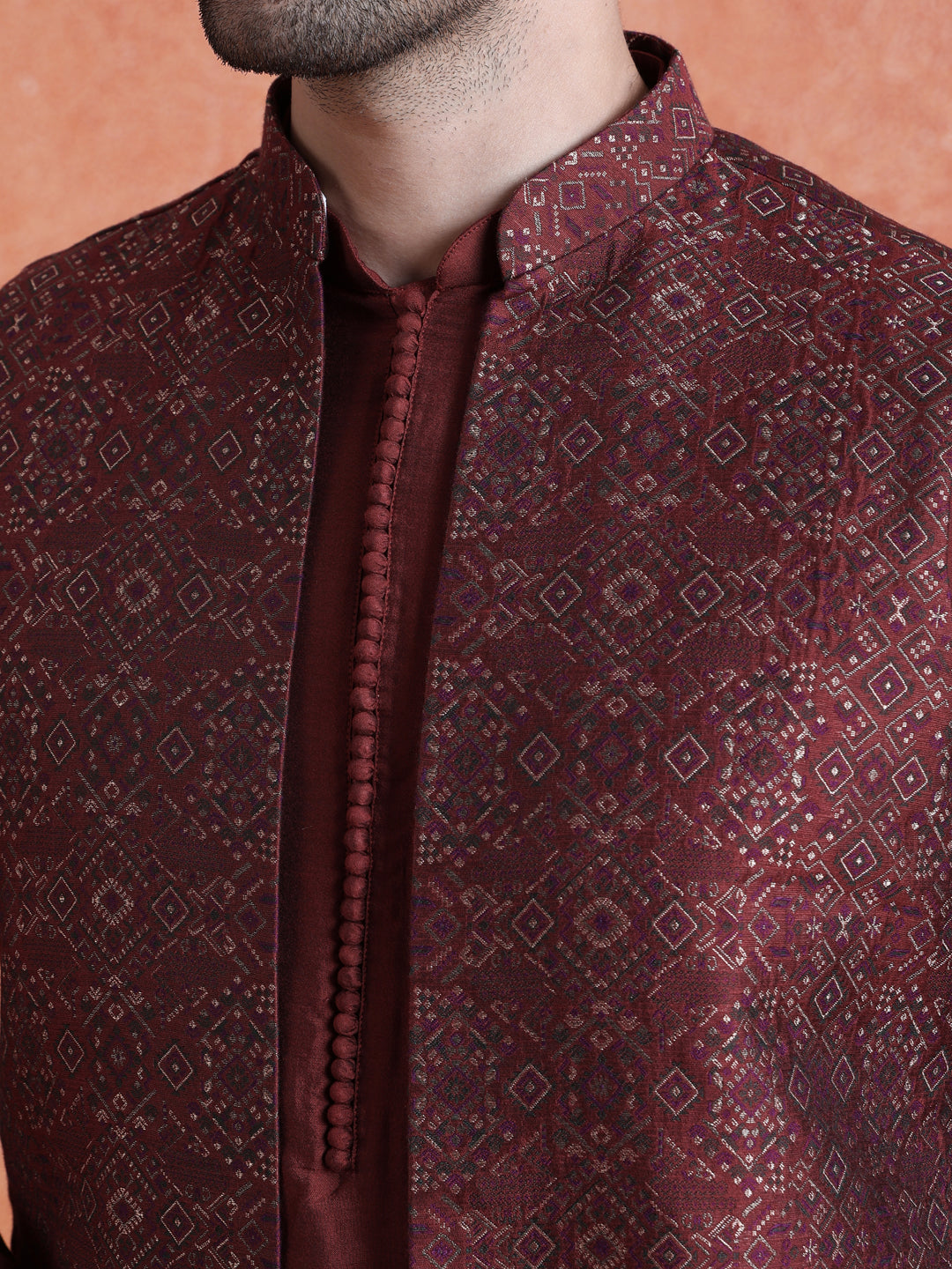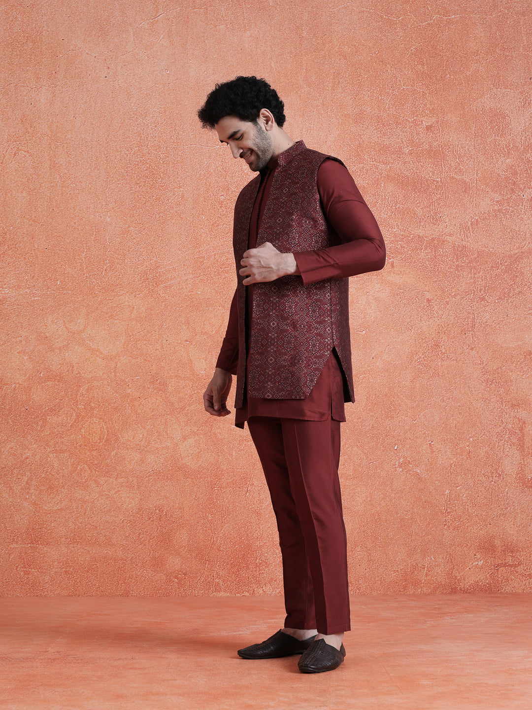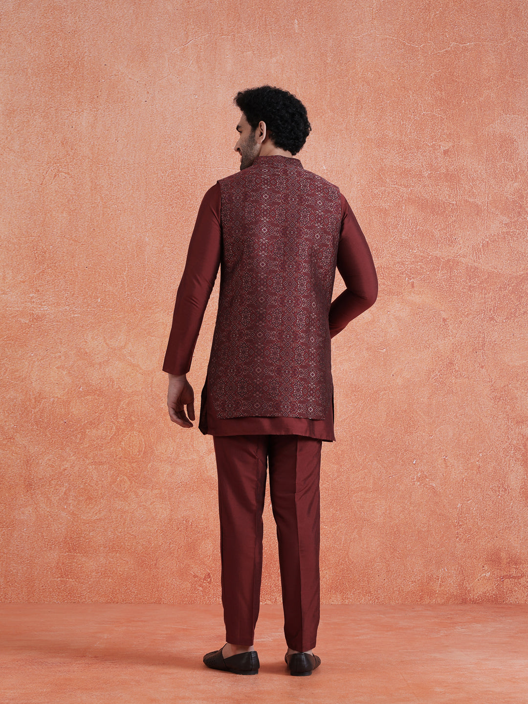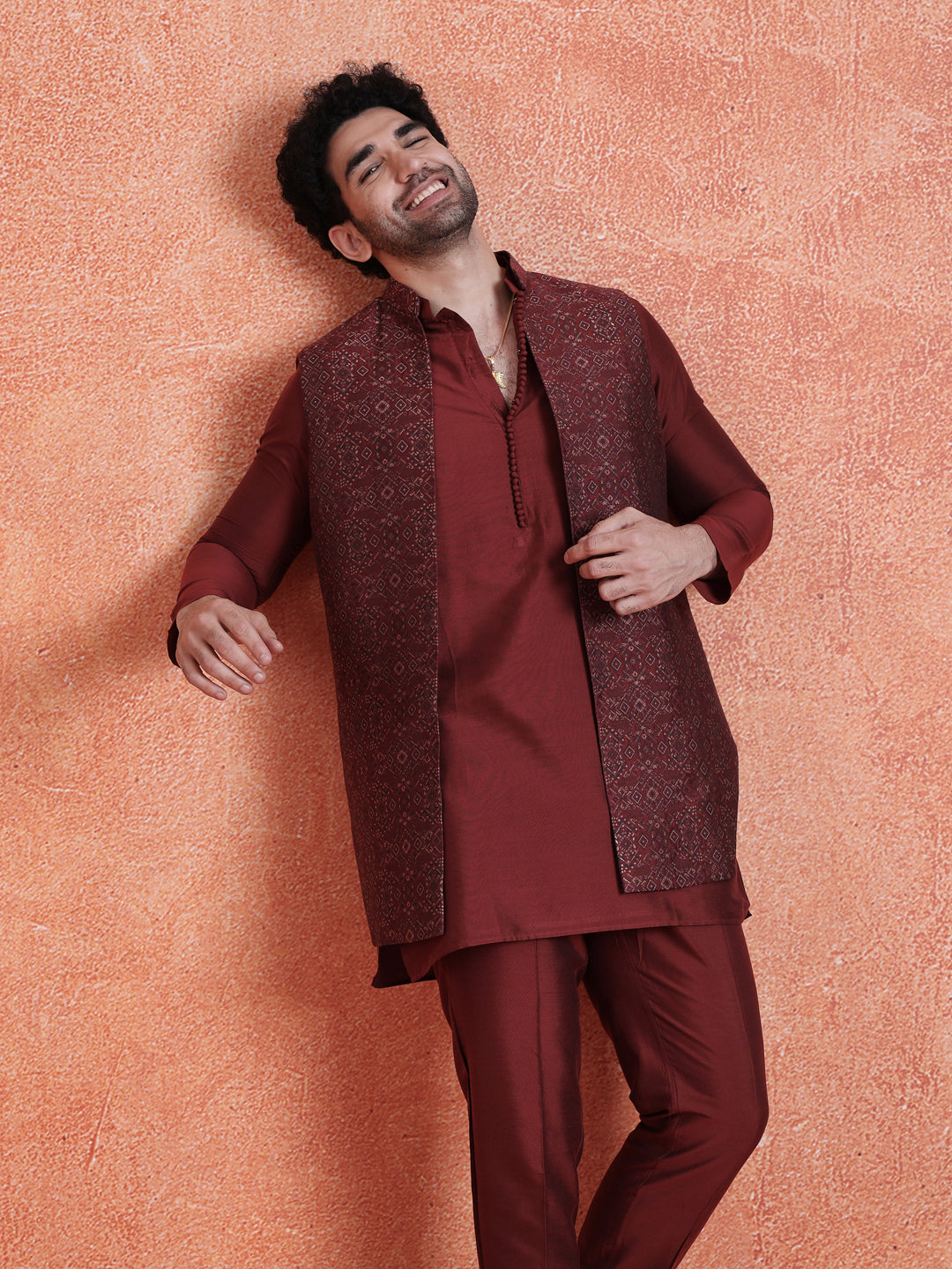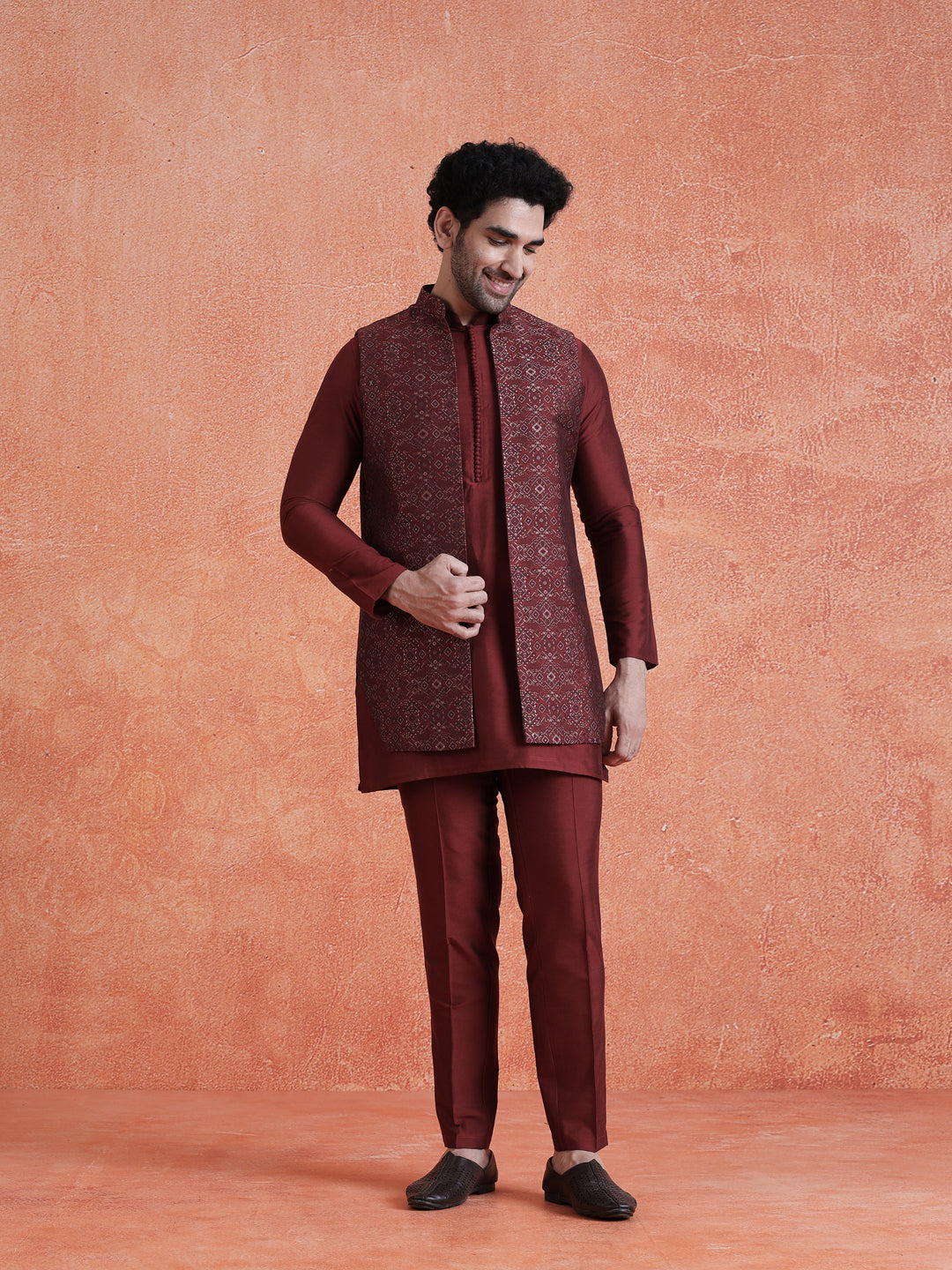 Maroon Silk Blend Mid Kurta Front Open Long Jacket Trouser Set with Jacquard pattern, perfect for weddings and festive occasions.
