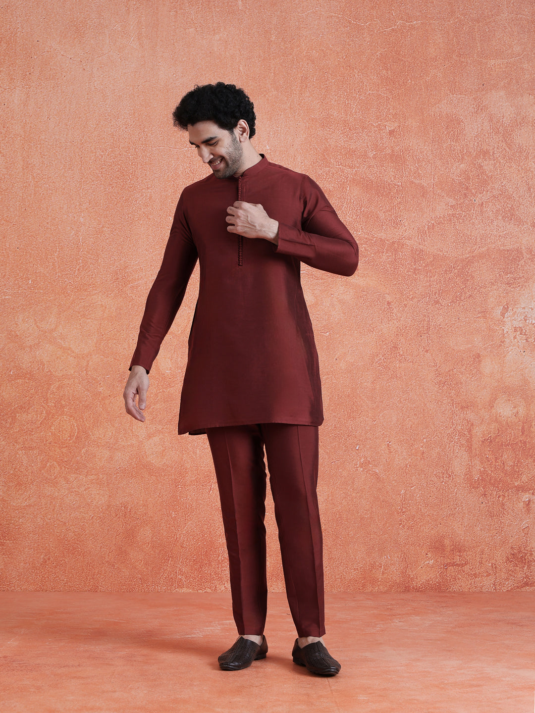 Maroon Silk Blend Jacquard Mid Kurta Front Open Long Jacket Trouser Set