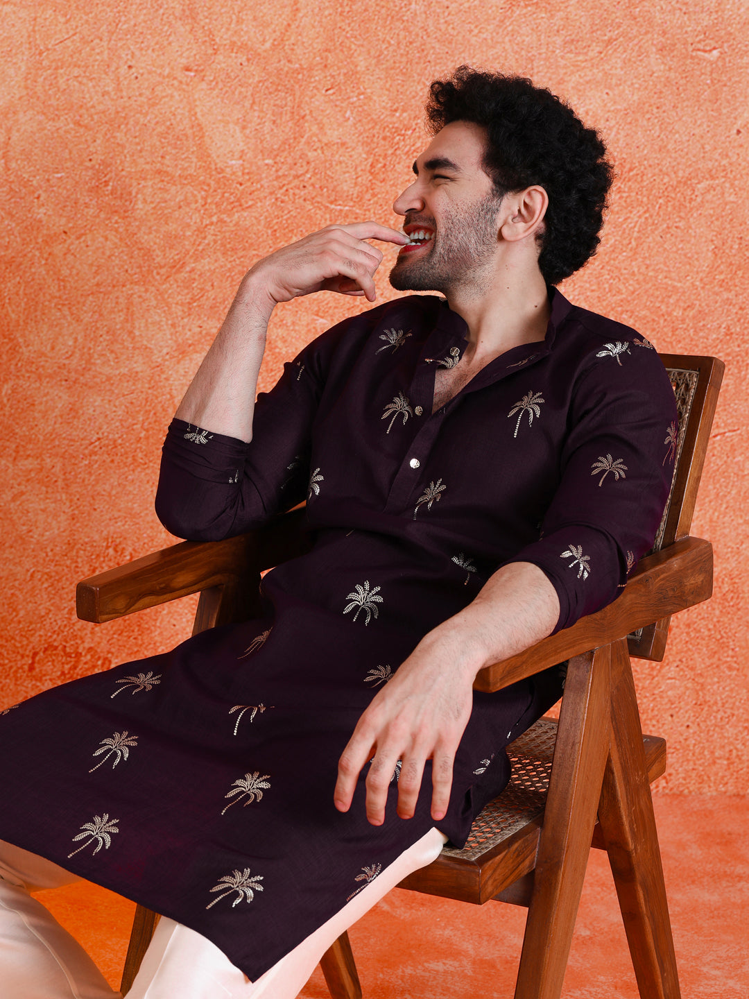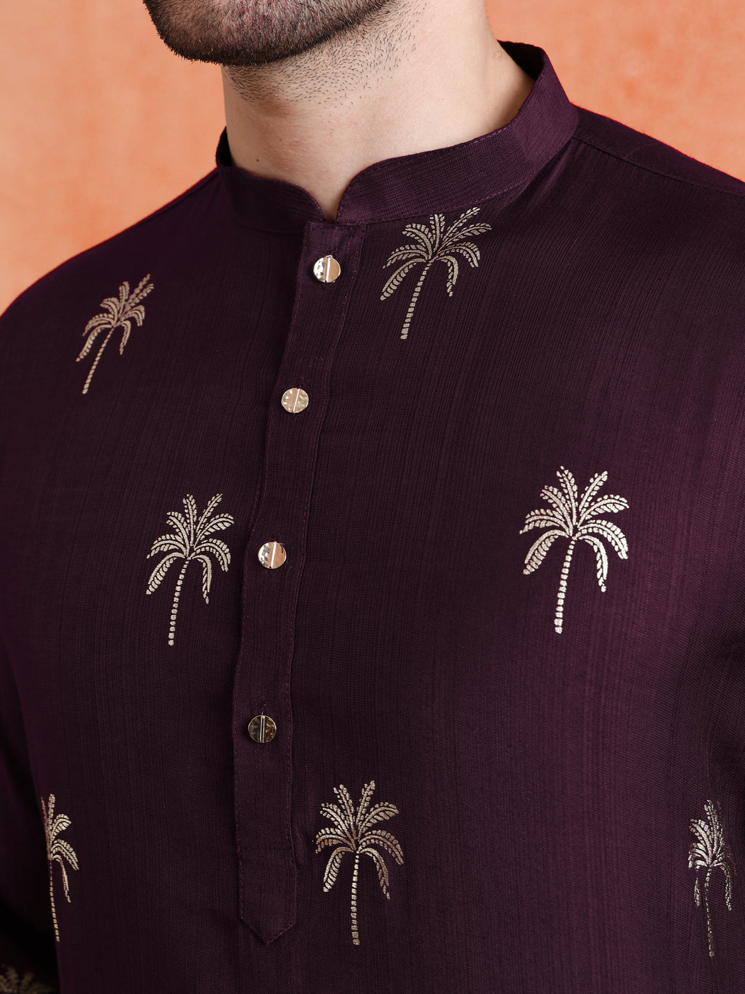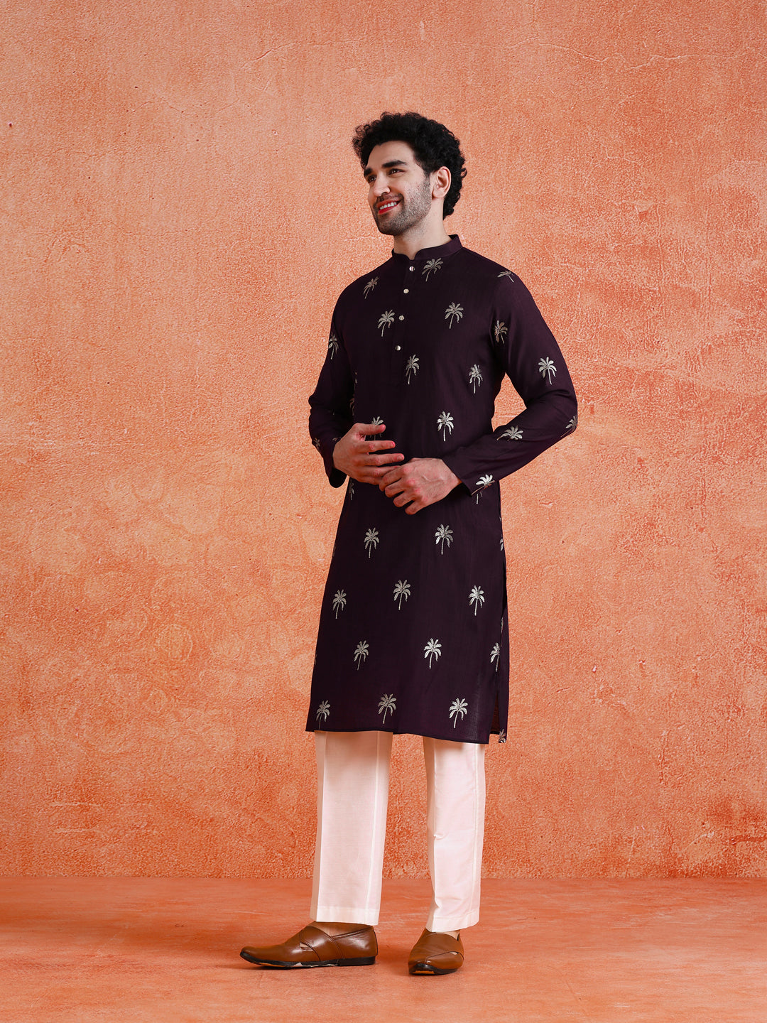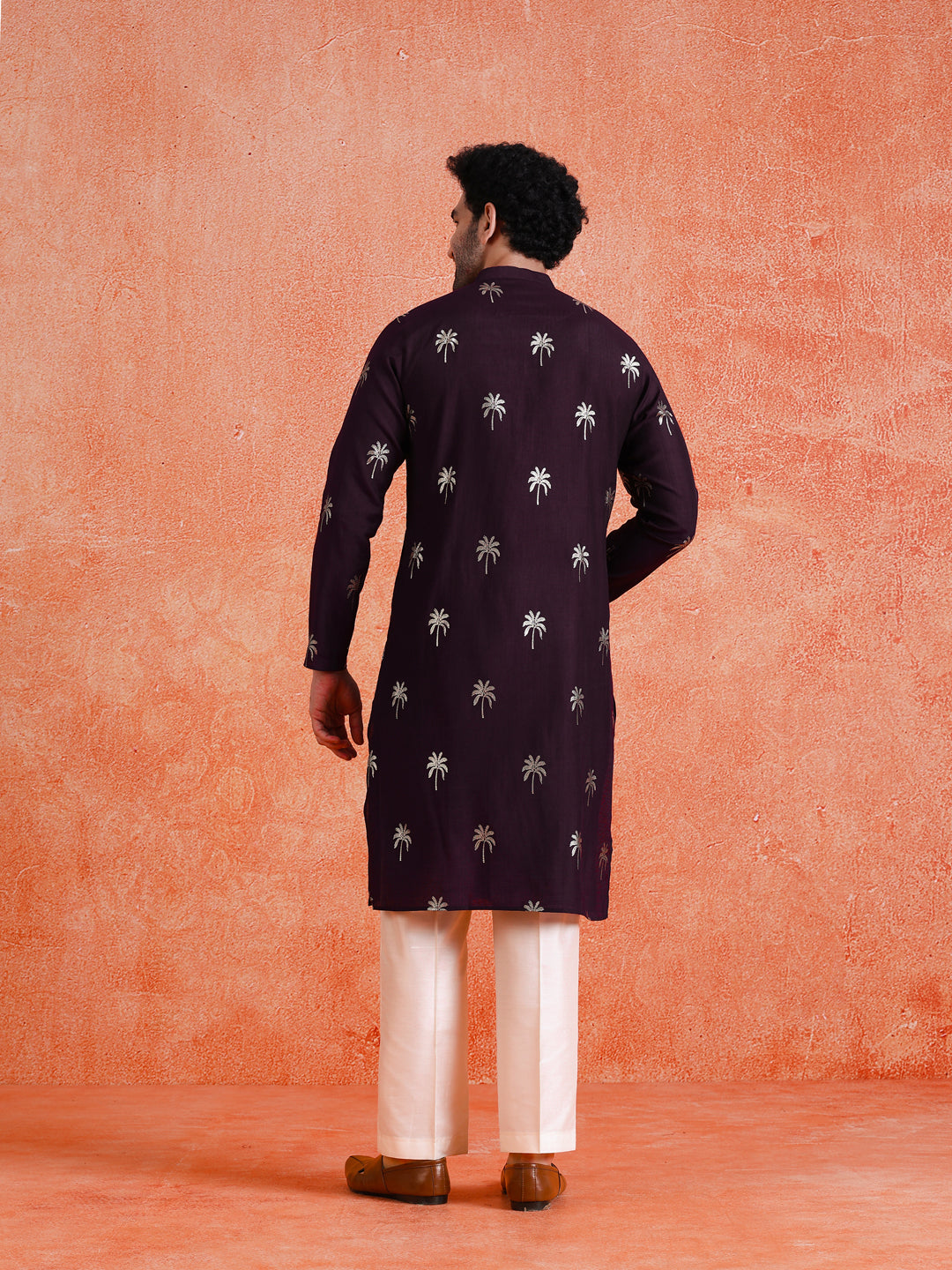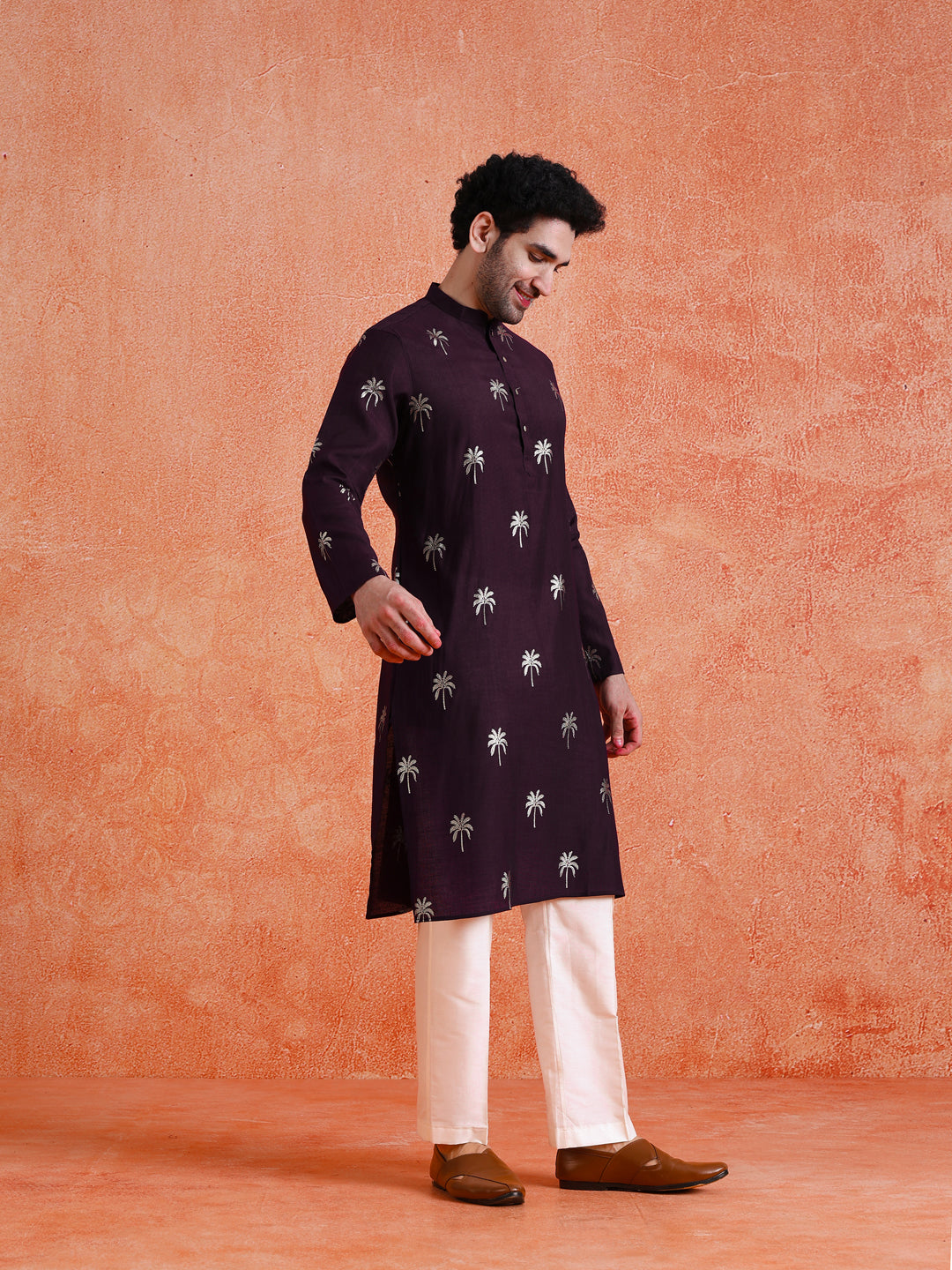 Maroon Silk Blend Kurta Wide Leg Trouser Set with Printed Design. Perfect for festive and traditional occasions. Comfortable and stylish.