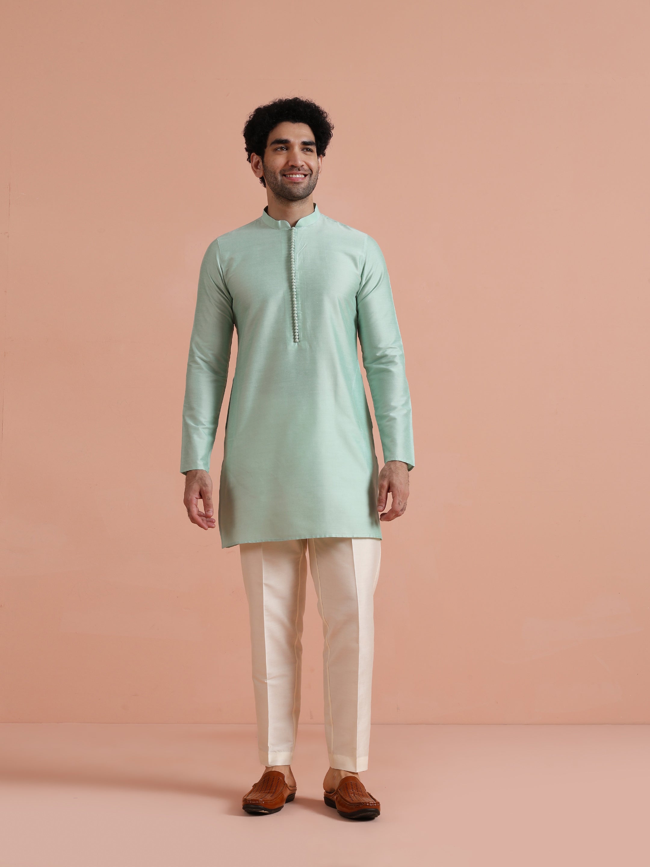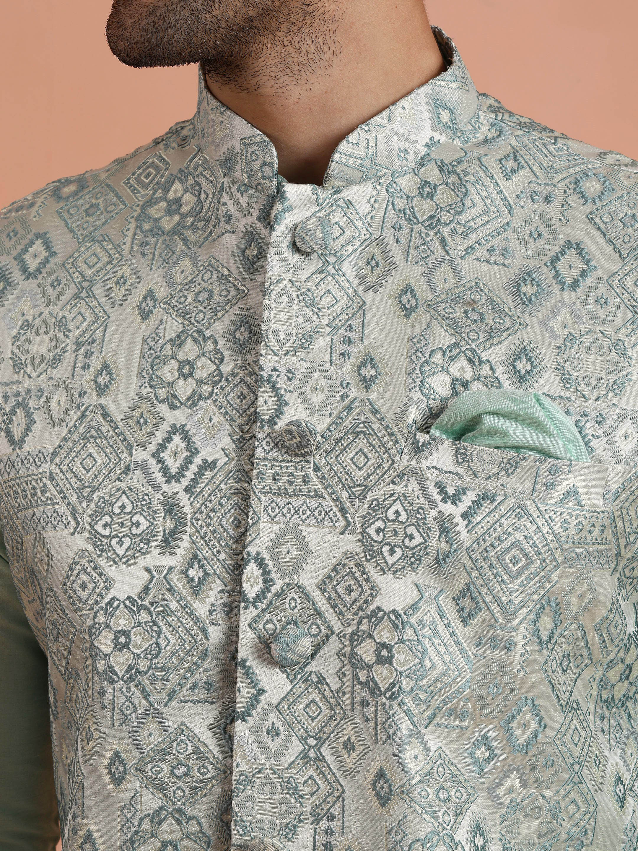 Mint green velvet kurta with woven ethnic motif Nehru jacket and cream trouser elegant pastel kurta jacket set for weddings and festive wear.