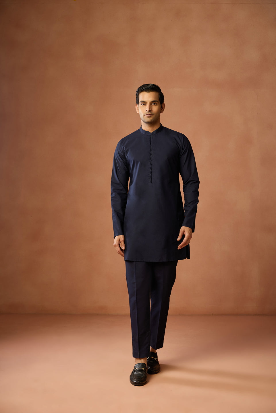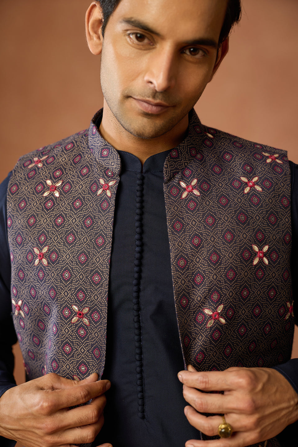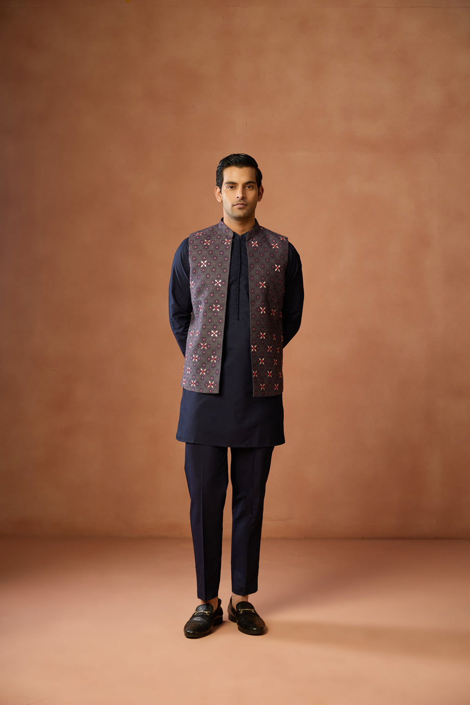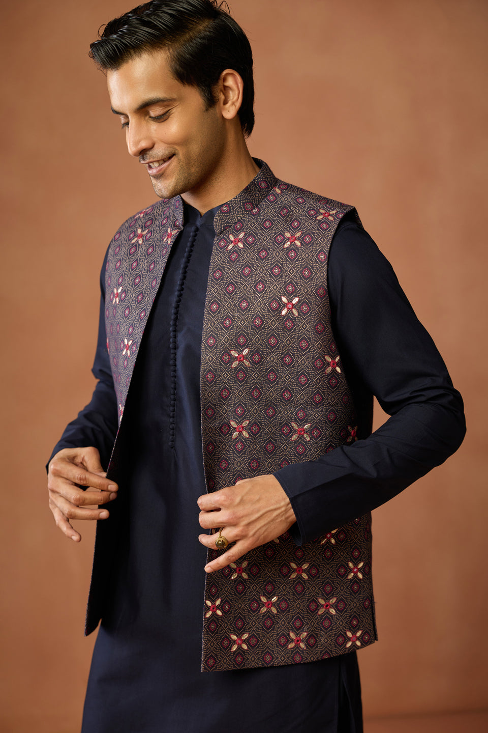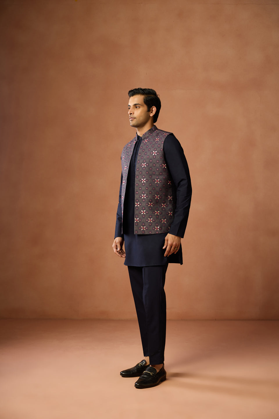 Kisah Navy Blue Silk Blend Mid Kurta Trouser Set with brocade embroidered jacket elegant ethnic wear for weddings, receptions & festive occasions.