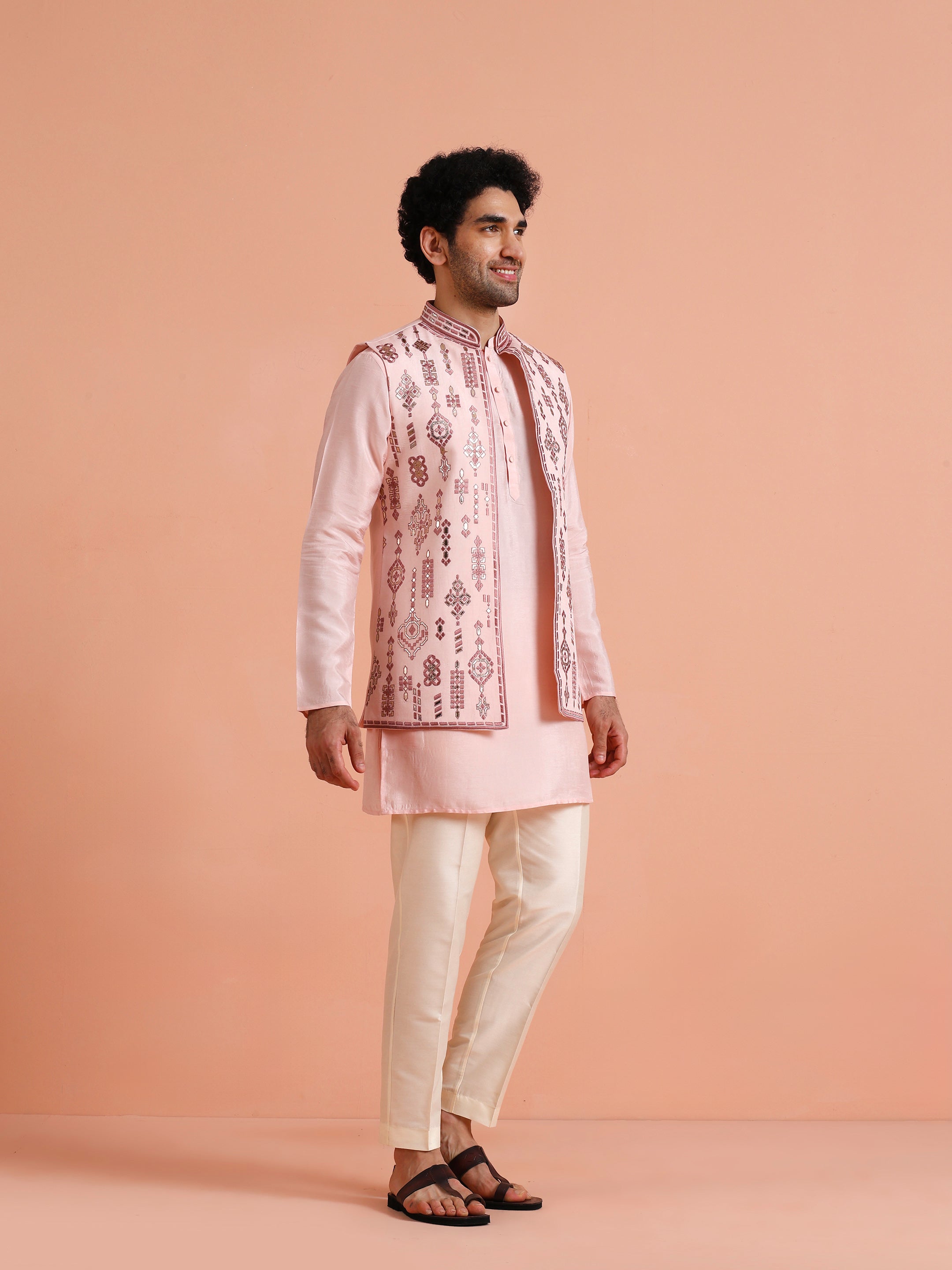 Pink embroidered jacket kurta set with cream trousers a pastel festive outfit perfect for weddings, engagements, and cultural celebrations.