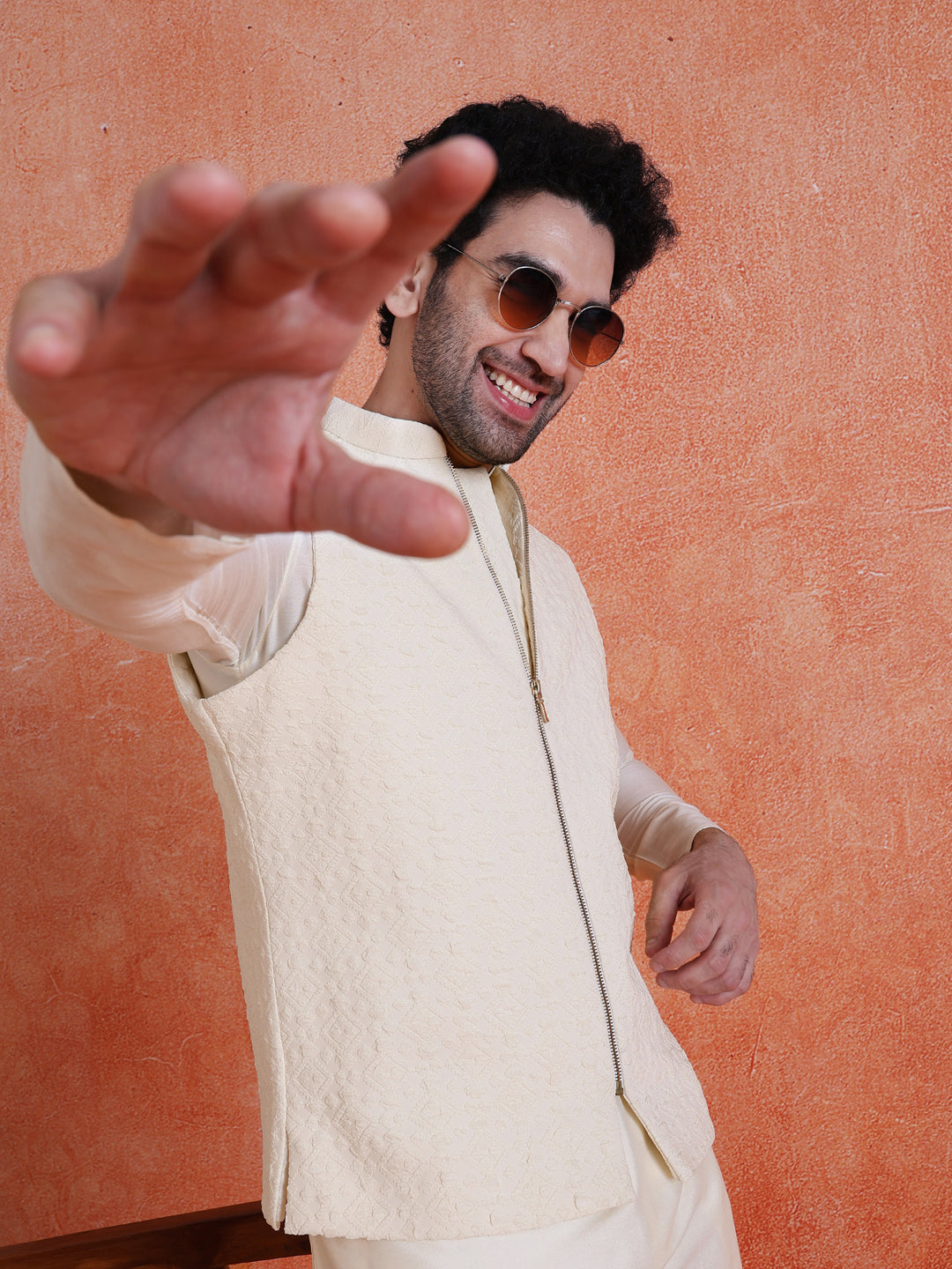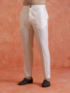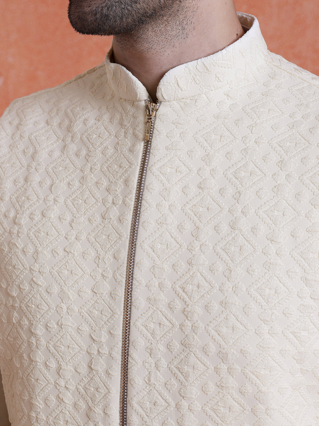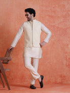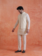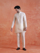 Elegant Mid Kurta Jacket with Zip Trouser Set in Silk Blend. Perfect for festive occasions with a refined jacquard pattern and comfortable fit.