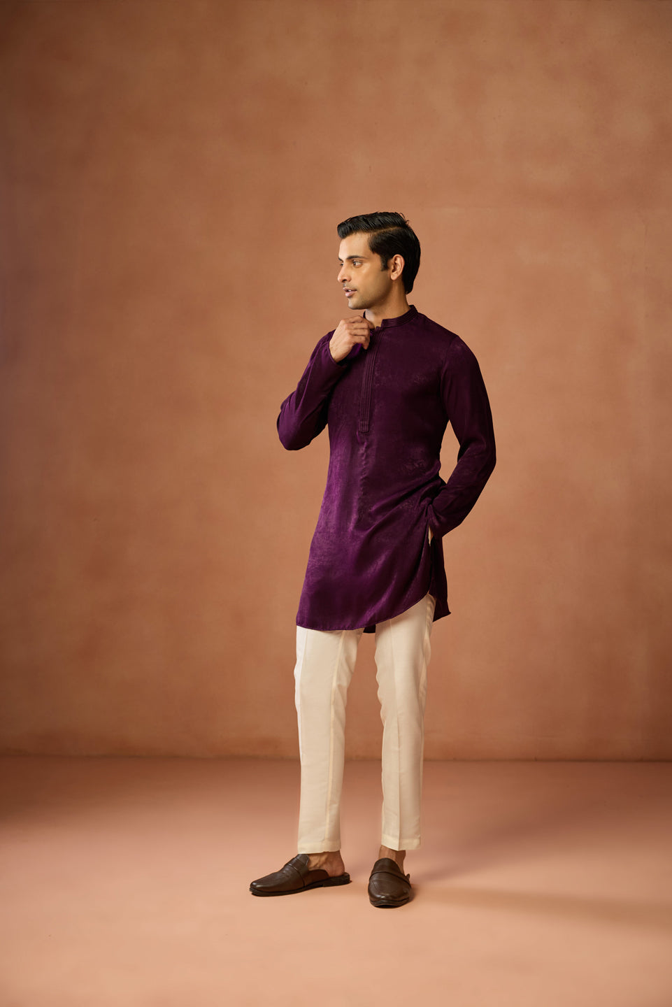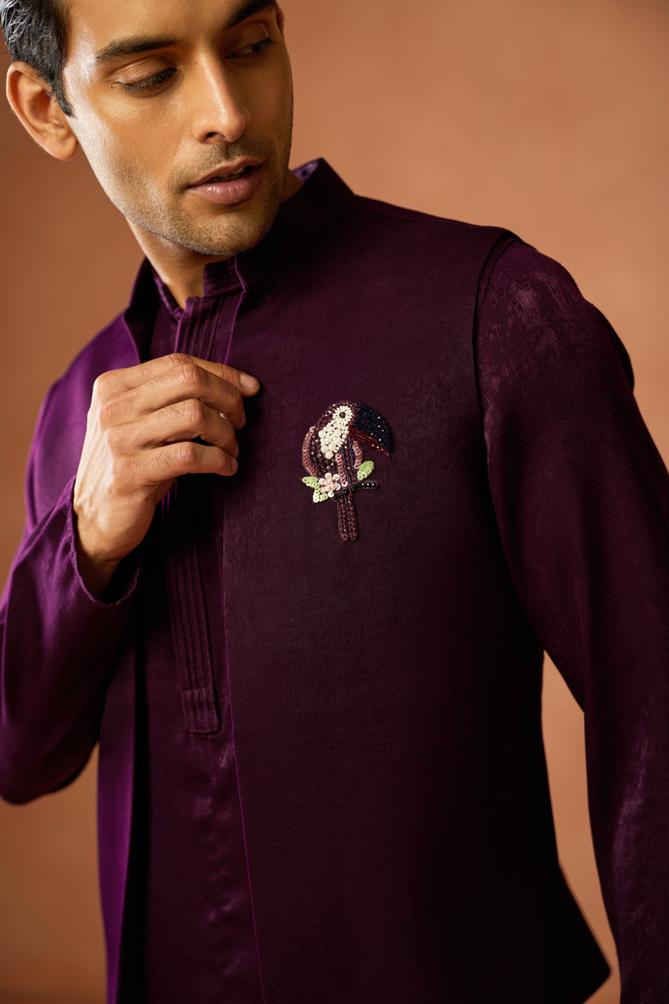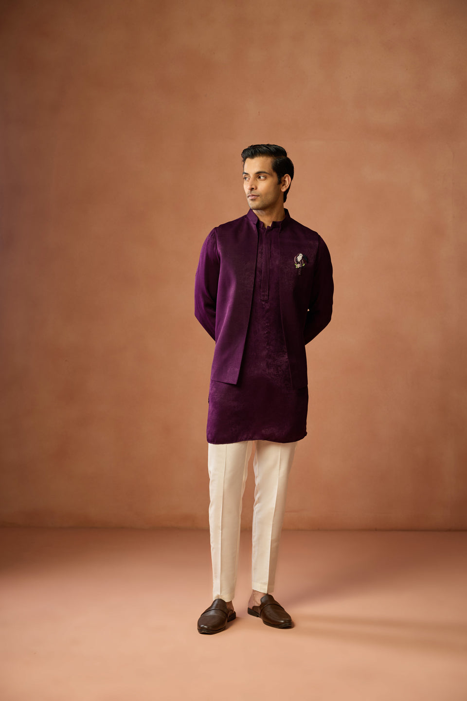 Kisah wine purple silk blend mid kurta with front open jacket, embellished brooch, and cream trousers. Modern Indo-western set for weddings.