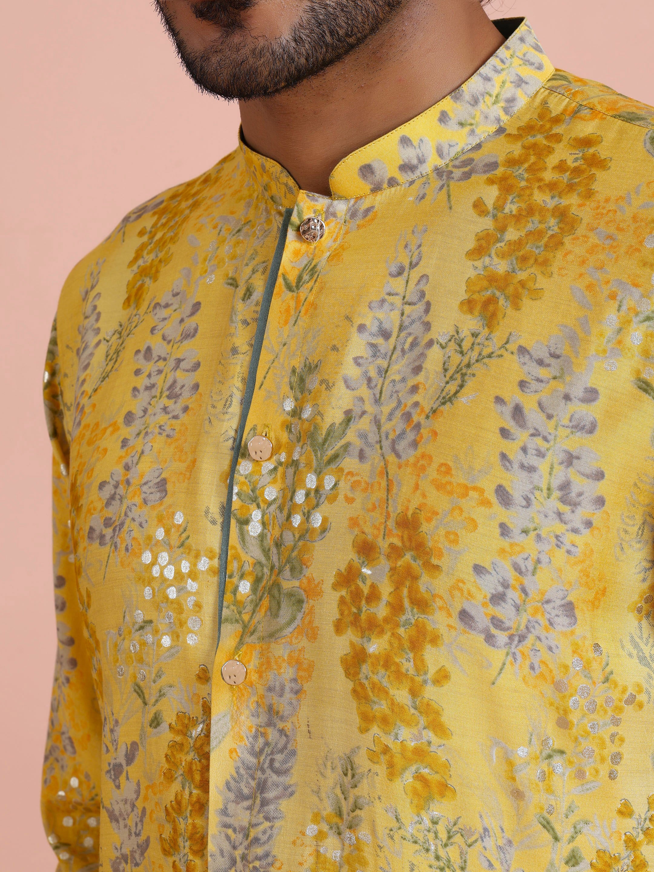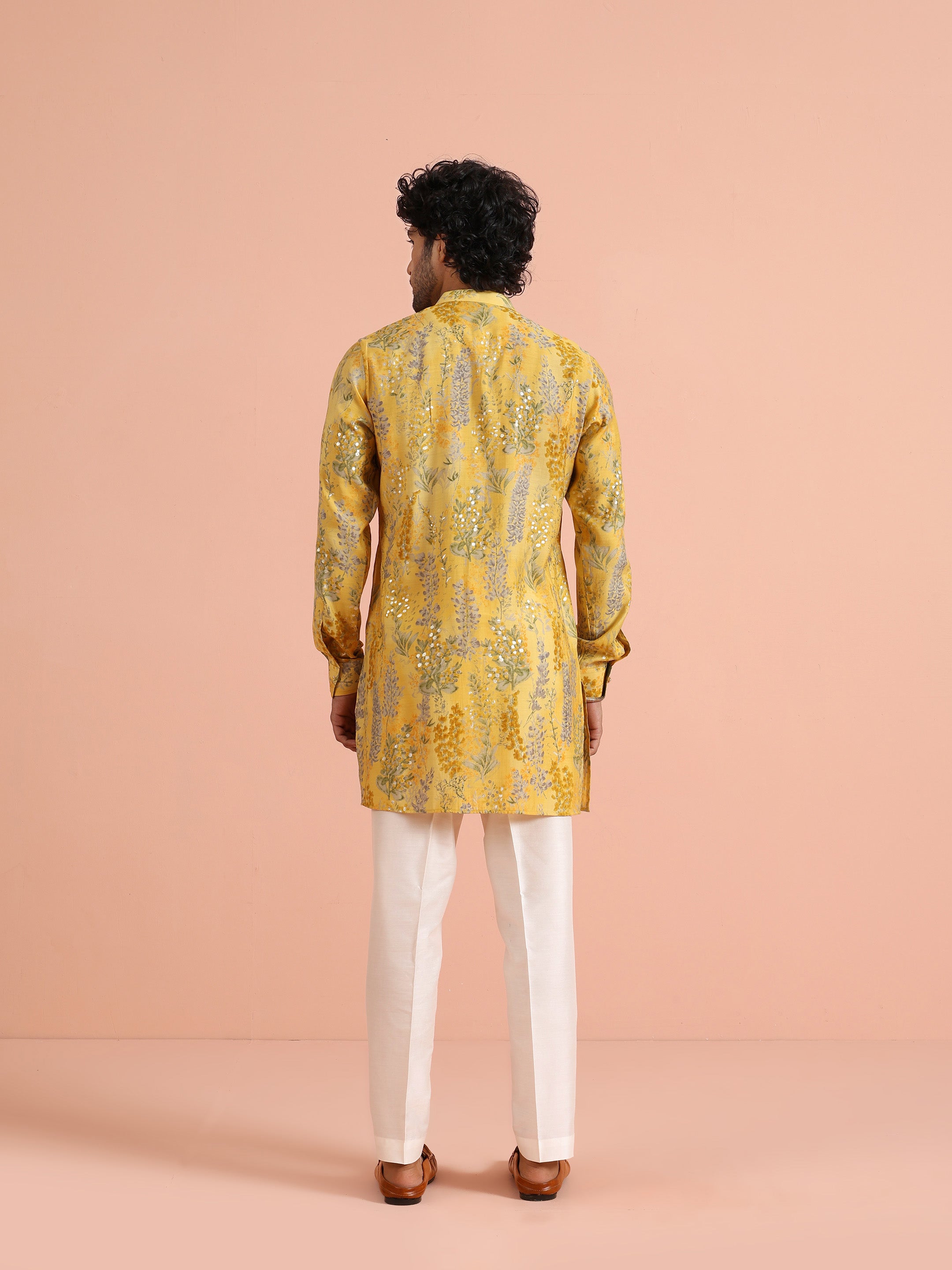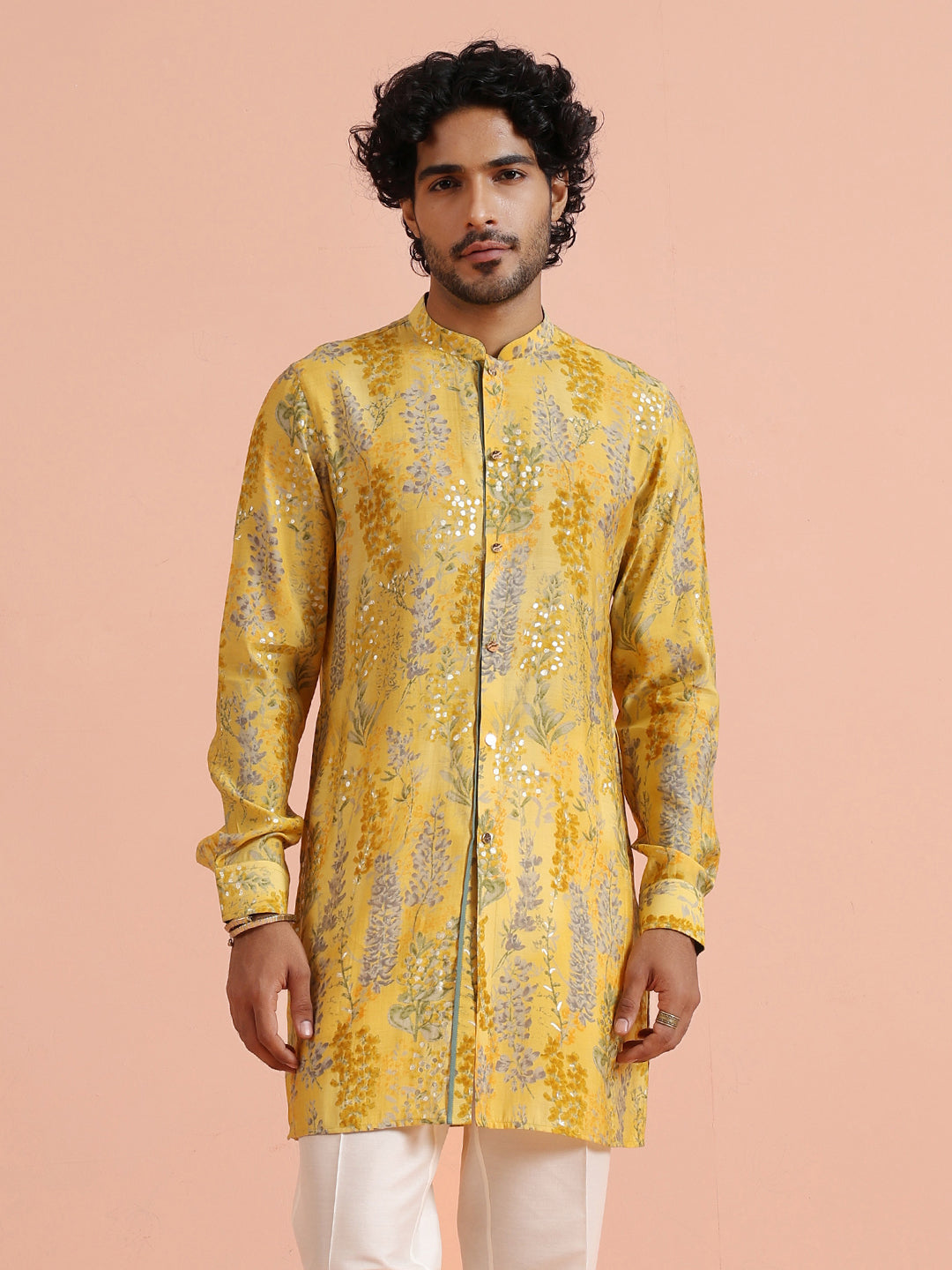 Kisah Menss Yellow Sequinned Mid Kurta festive floral kurta with sequins for haldi, weddings, and celebrations. Bright, elegant, and stylish.